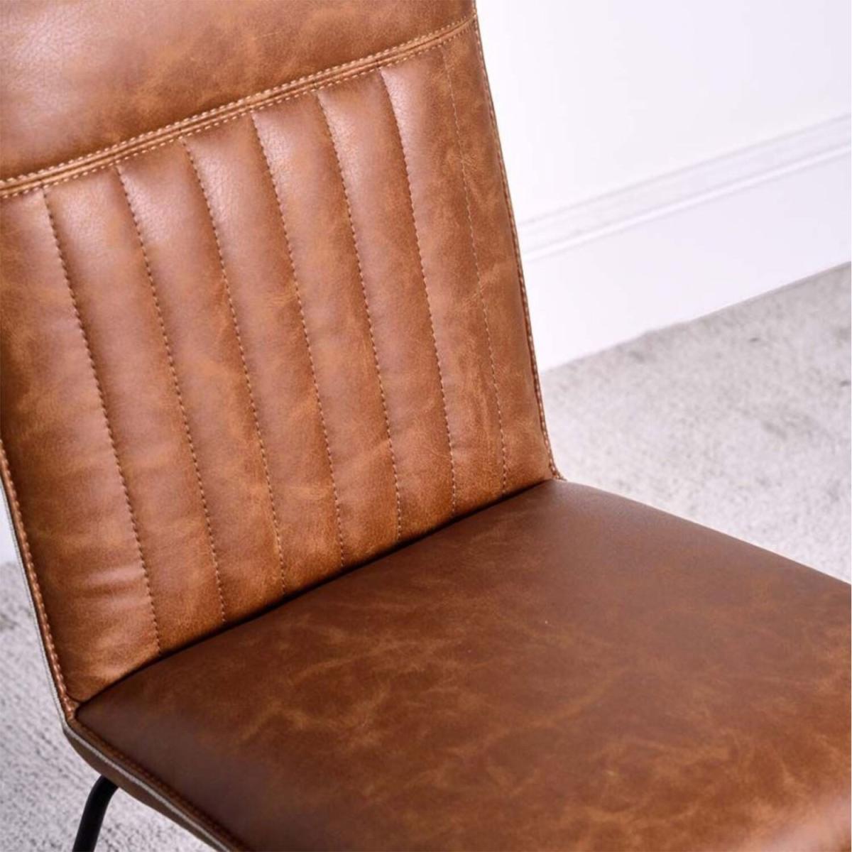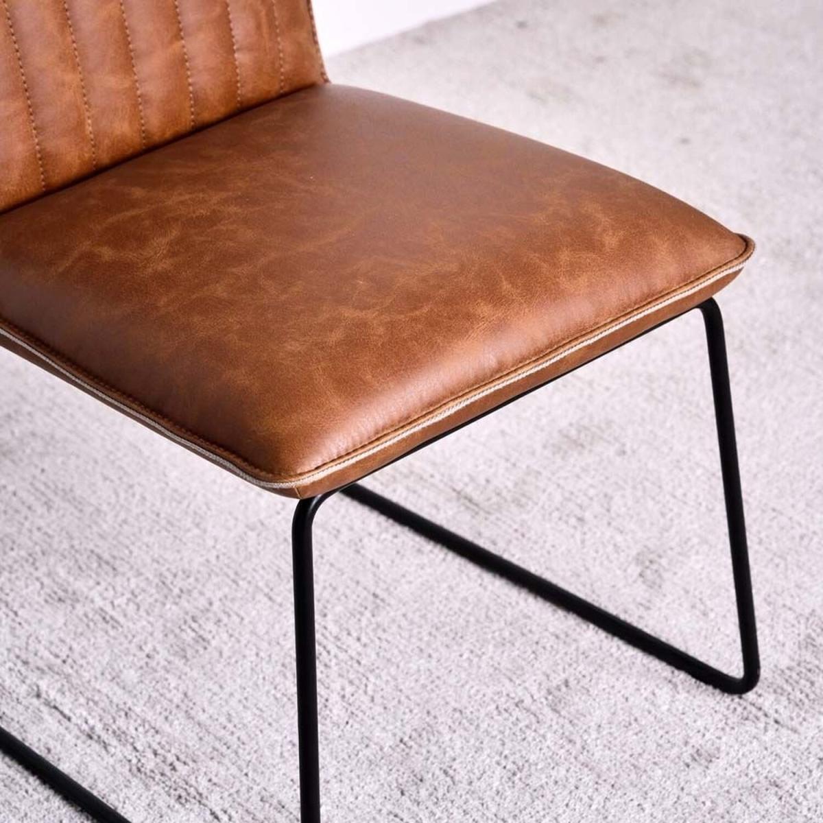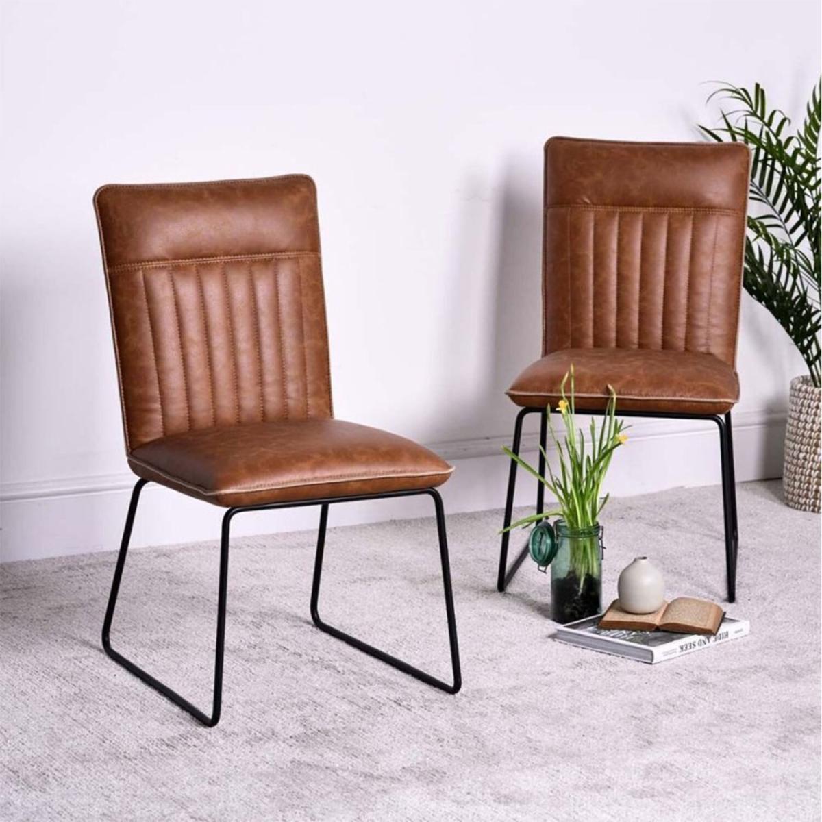 If you're looking to makeover your dining room then consider these stylish industrial leather dining chairs with metal legs The Hardy industrial leather dining chair by Baker Furniture brings with it a modern design with industrial vibes that can be seen in its slim metal legs. Sold as a pair, these industrial dining chairs are upholstered with tan faux leather featuring a ripple effect on the seat back.