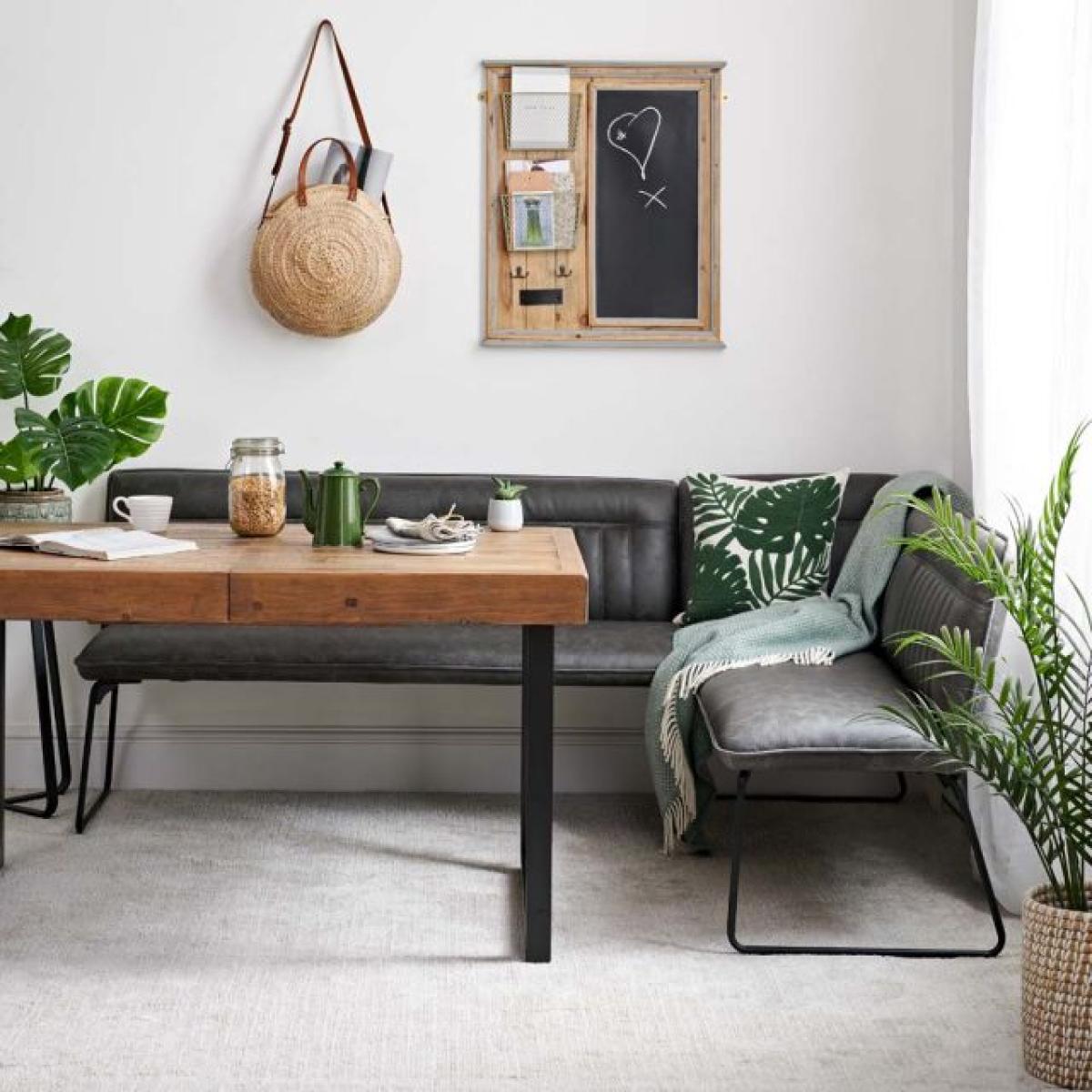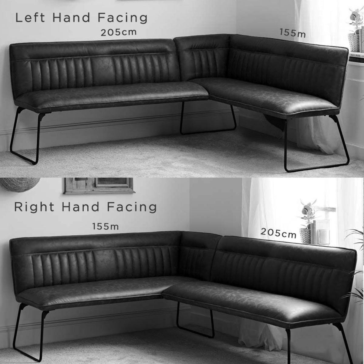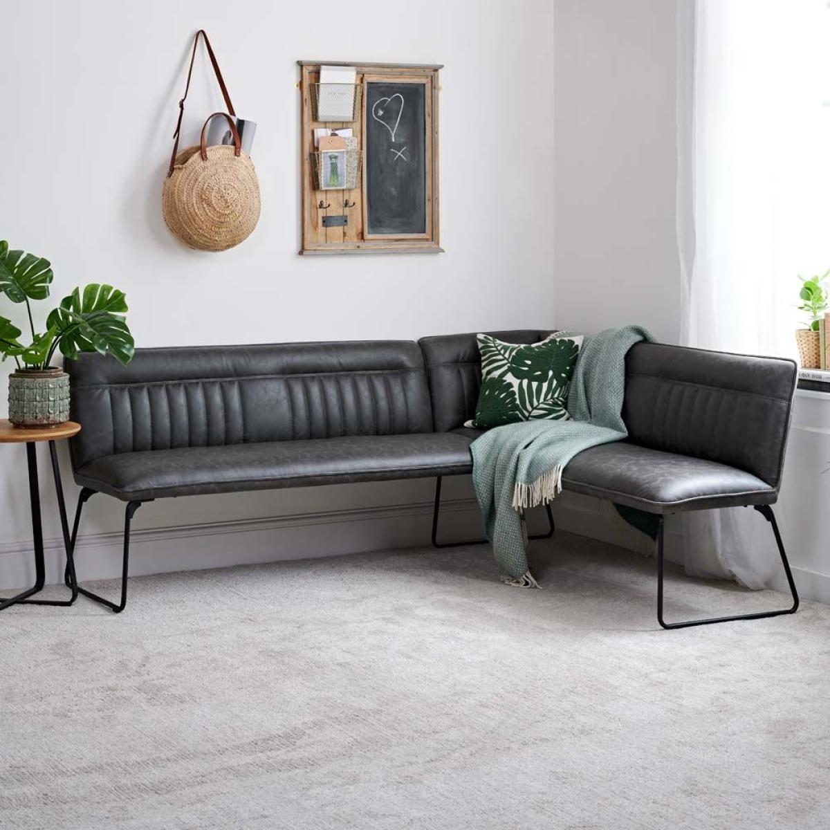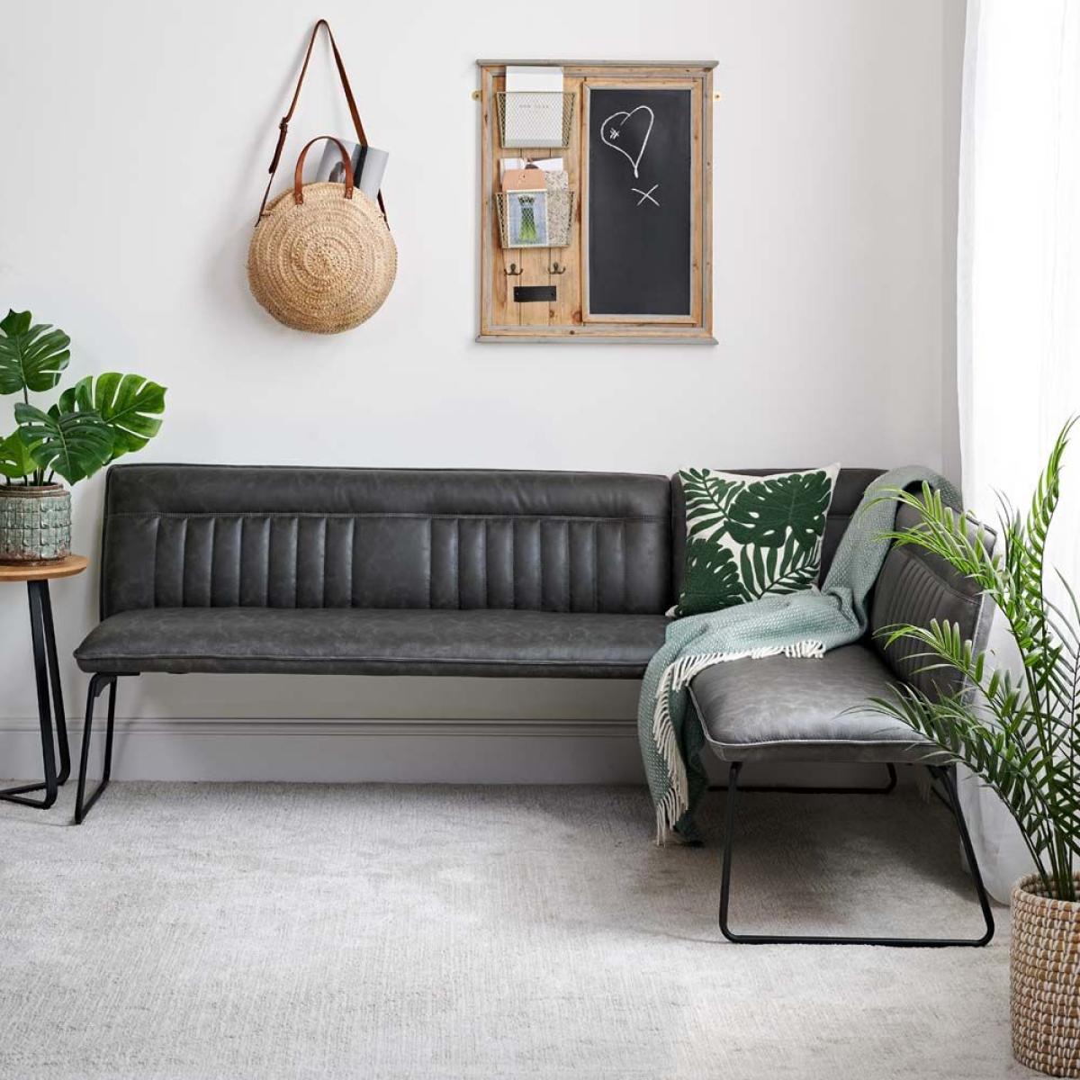 The Hardy corner bench seating is a fantastic solution for a comfortable dining arrangement when space is a premium. The corner bench essentially allows you to position the dining table in a corner and have your diners sit in comfort, with the soft padding of the bench continuing around two lengths of your table. This corner bench seating in left hand facing configuration is upholstered in a very high quality grey faux leather. Also available in Tan, and in a right hand facing configuration. The benches easily slot together so assembly is quick and simple.