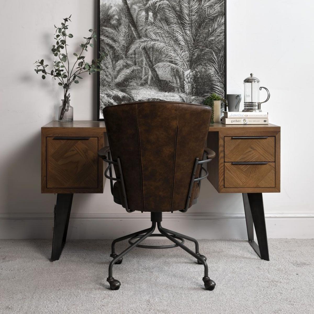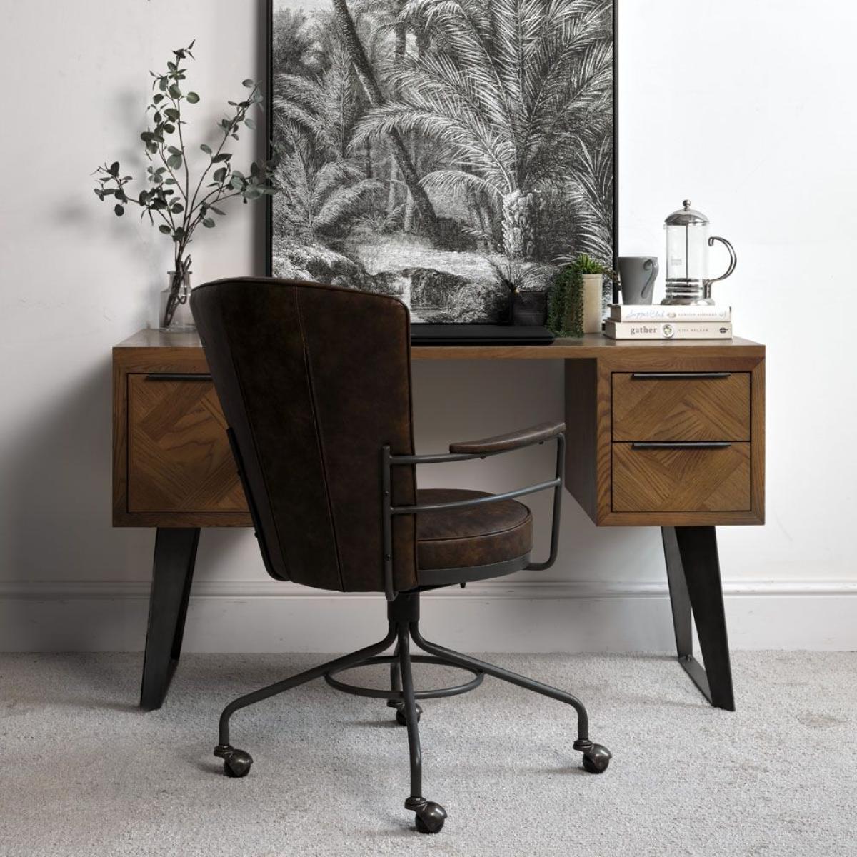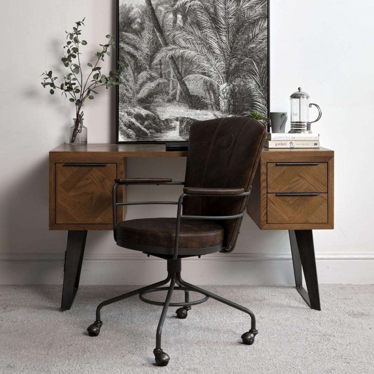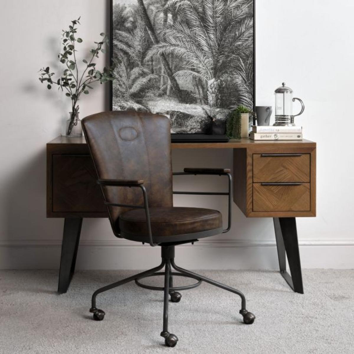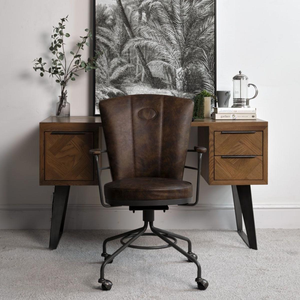 The Hardy Office Chair is an incredibly stylish desk chair with a vintage industrial design. Here is a dark brown faux leather, the hardy desk chair is built from a strudy metal frame and supported by four stem legs with smooth rolling castors. Dimensions: H93cm x W59cm x D65cm- Arm height 67.5cm. Four stem legs fitted with smooth rolling castors. Dark Brown Faux Leather. Very simple self assembly