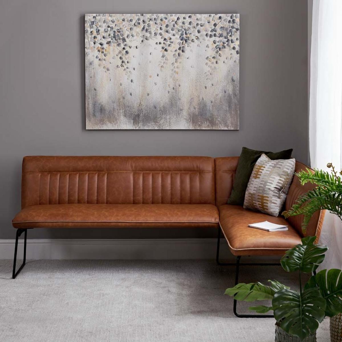 The Hardy tan corner bench is a fantastic solution for a comfortable dining arrangement when space is a premium. The corner bench seating essentially allows you to position the dining table in a corner and have your diners sit in comfort, with the soft padding of the bench continuing around two lengths of your table. The benches easily slot together so assembly is quick and simple. This tan corner bench seating in left hand facing configuration is upholstered in a very high quality faux leather. Also available in grey, and in a right hand facing configuration. Dimensions: H84cm x Longer Seat Length 205cm Shorter Seat Length 155cm. Seat Height 48.5cm Faux Leather Upholstery Powder Coated Black Steel Legs Simple Self Assembly