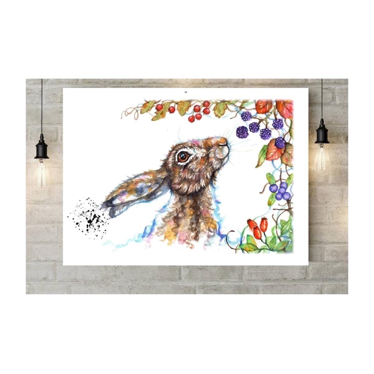 Inspired by the beauty of nature, Be Coventry originally painted this scene of an Autumn Hare eating Berries in professional watercolours. Now recreated in print on a box canvas, this artwork will enhance any room in your home. The watercolour design is printed onto 260gsm Matte Polyester canvas, and attached to quality pine timber. The canvas is taped on the rear and is supplied with a wall-hanging kit.