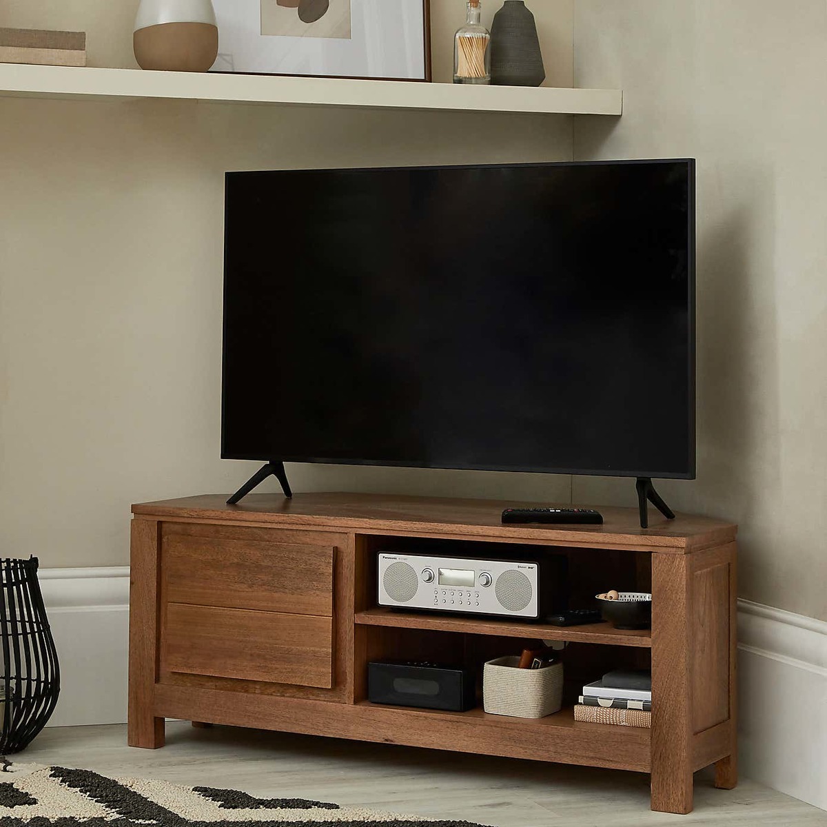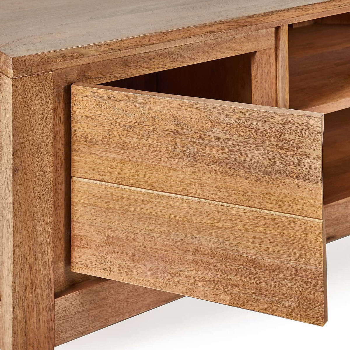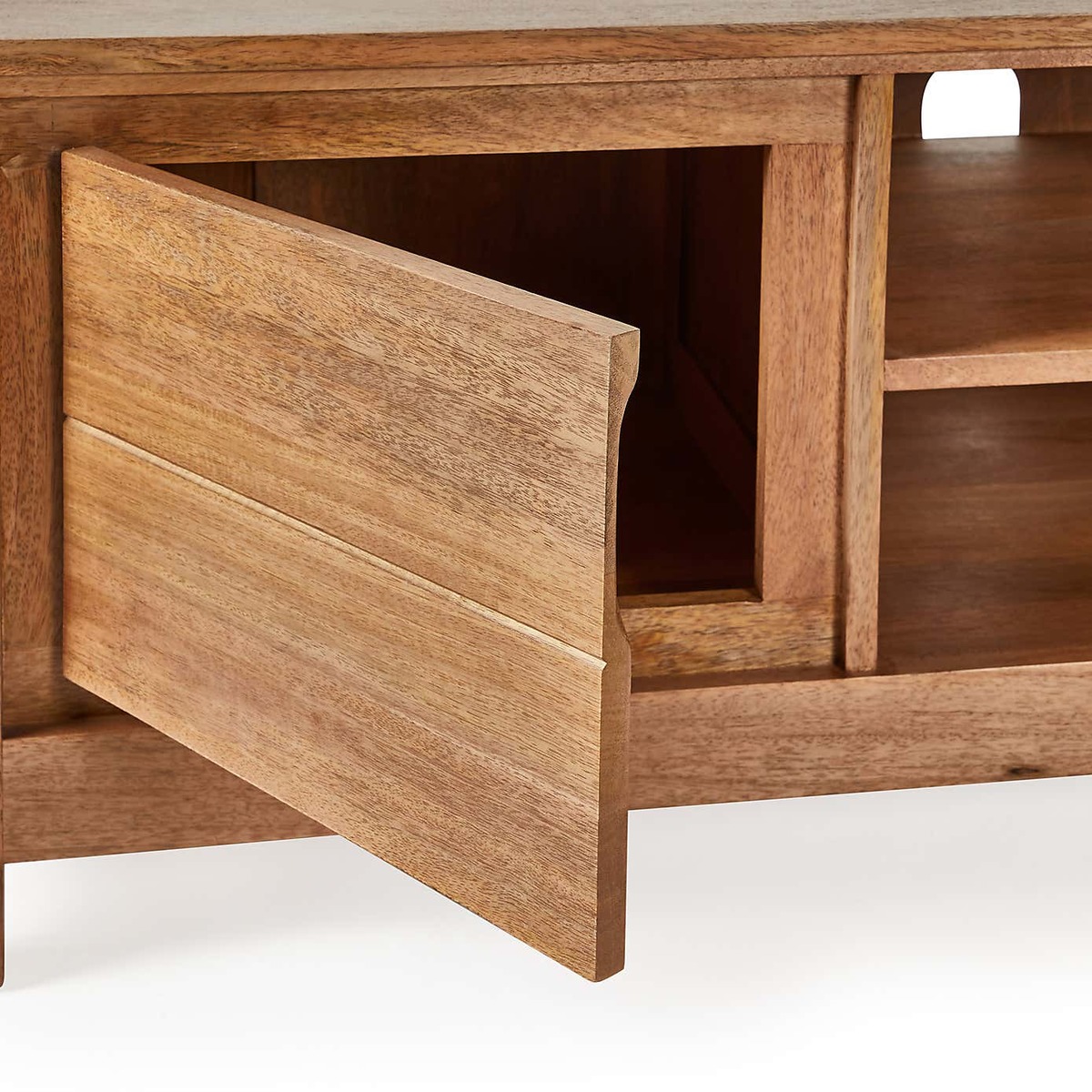I love this TV rack for its warm, natural finish which adds a cosy, inviting feel to living rooms. Its simple yet functional design makes it versatile for various interior styles, from contemporary to rustic schemes. It works particularly well in spaces that emphasise natural materials and understated aesthetics. For styling tips, consider pairing it with neutral-toned accessories or greenery to enhance its organic vibe. Keep clutter at bay by using decorative baskets or trays on top or within the open shelves, and balance it with taller or textured decor items to create visual interest. This piece's sturdy construction and open storage make it practical while maintaining a relaxed, stylish look.