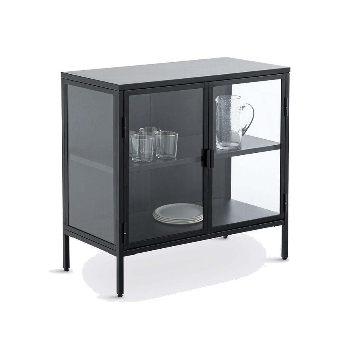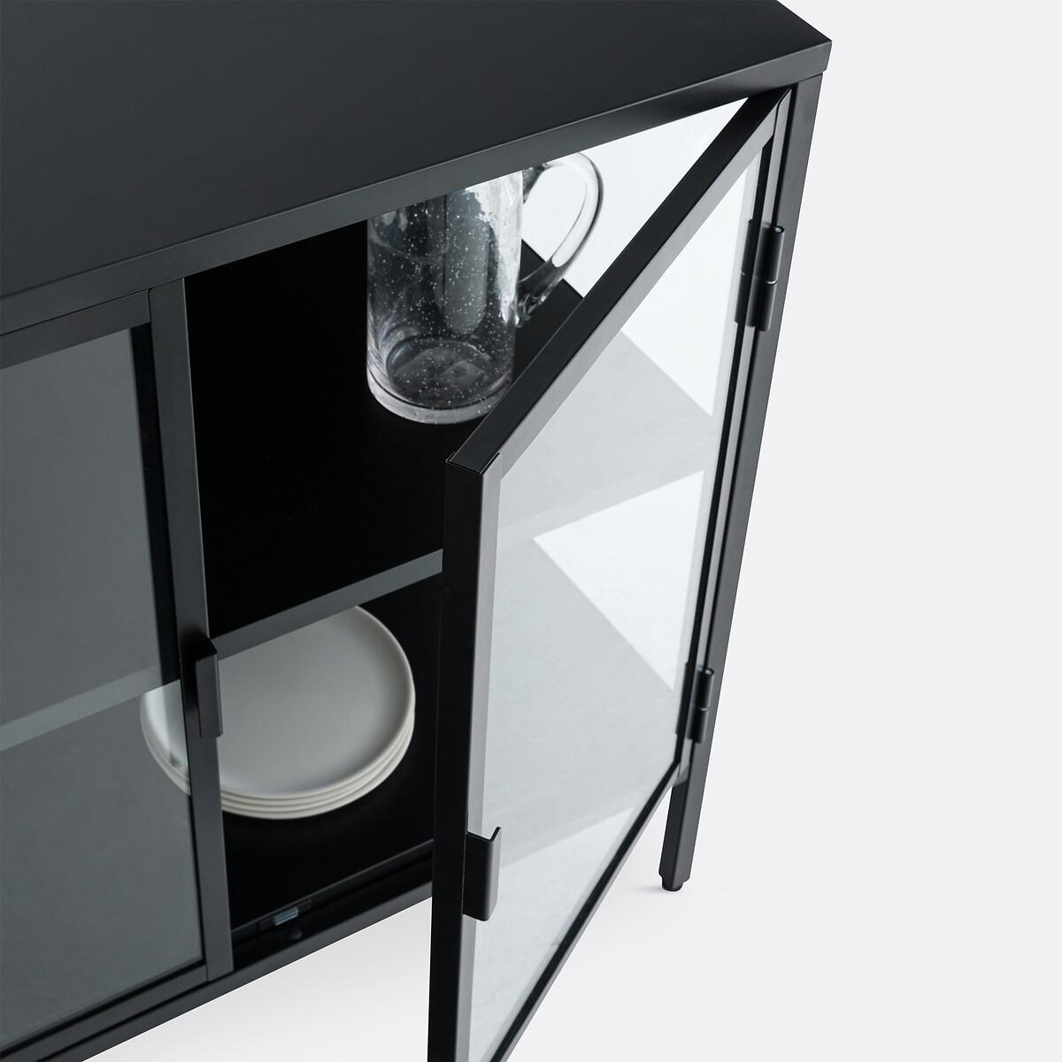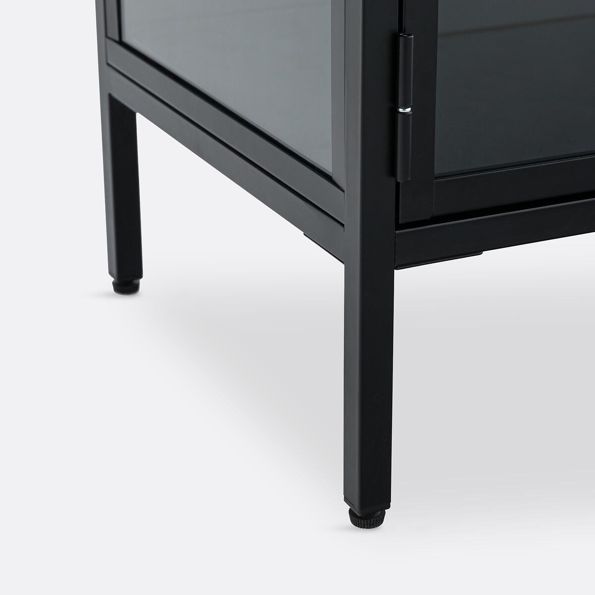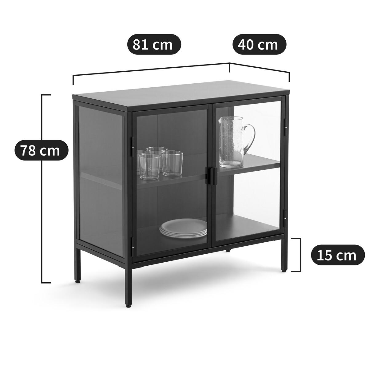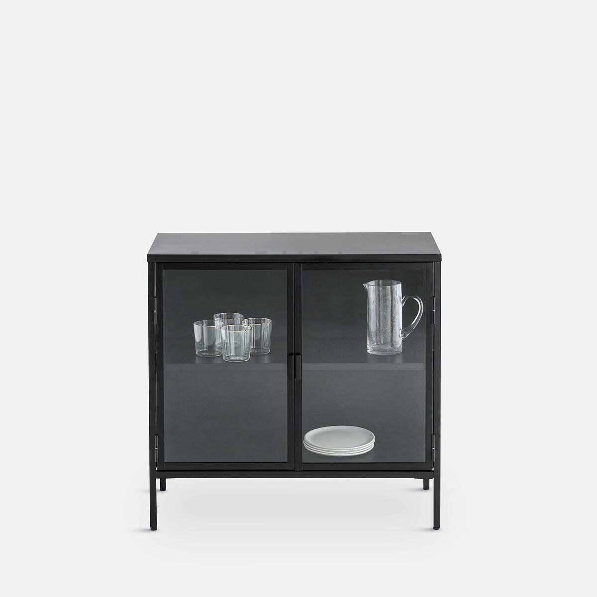 Discover Harlem. The metal sideboard cabinet with ideal proportions to showcase your most beautiful objects... Its glazing is made of tempered glass for more resistance and safety. It's beautiful from all angles!An exclusive by La Redoute Interiors. Product Details • Structure, legs, steel shelves, black paint, epoxy finish • Clear tempered glass doors and sides • 2 doors, 1 removable shelf, 2 compartments • Adjustable plastic feet • Wall mounting recommended (screws and dowels not supplied)Dimensions. Overall • Width: 81cm • Height: 78cm • Depth: 40cm • Height of legs: 15cm. Usable space • Compartments : L77 x H28 x D35cmDelivery:. Assembly required. Available for home delivery. Dimensions and weight of parcel1 parcel • L90.5 x H23 x D49cm. 27kg