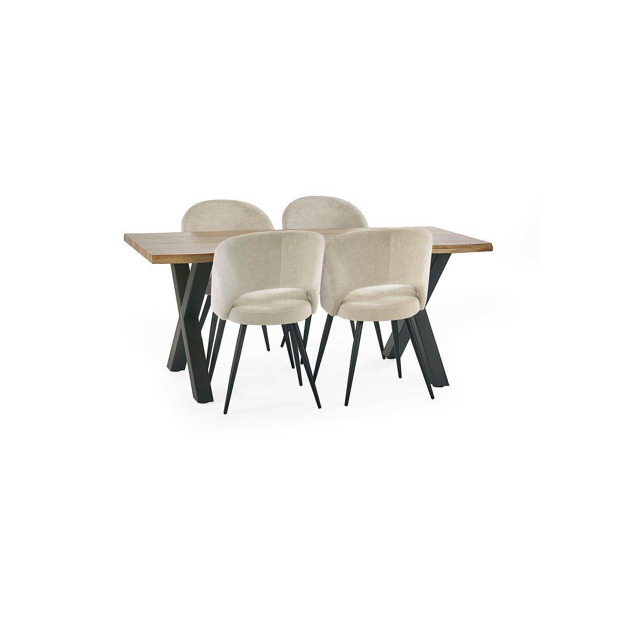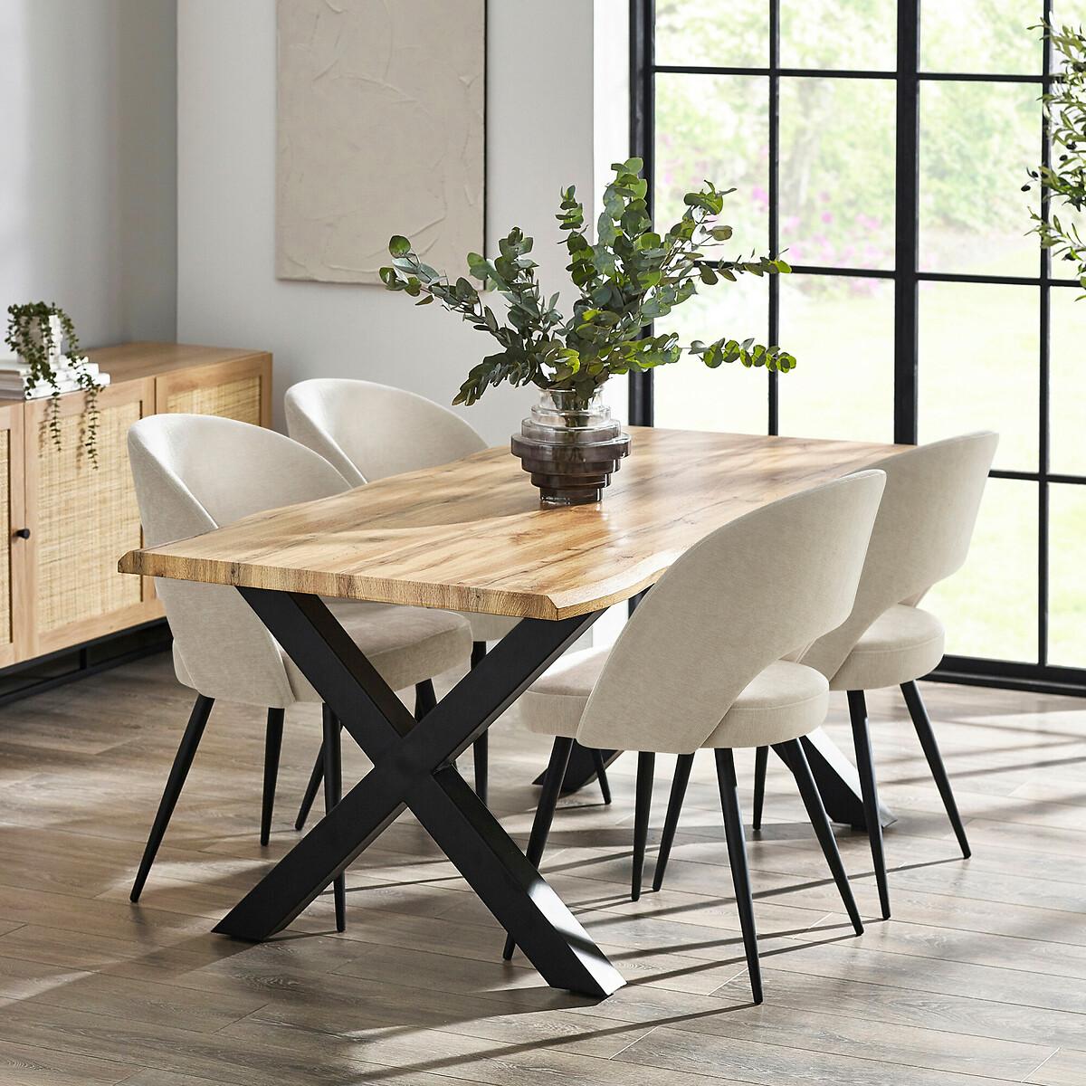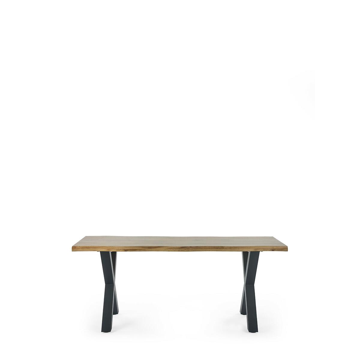 Meet Harlen — the dining table with rustic character and modern edge. Its oak-effect top, complete with a distinctive waved edge, creates a natural rustic feel, bringing farmhouse charm to every meal, while the bold matt black crossed steel legs keep things sturdy and stylish, lending an industrial touch. Whether it’s everyday dinners or hosting a crowd, the Harlen table is built to be the centre of attention. Product Details • Waved wood edges for a natural, earthy look• Matte metal legs• Rectangular shape• Full assembly required• 12 month manufacturers warranty• Care advice - wipe with a clean damp cloth. Product Composition - 50% MDF, 50% Steel. Product Dimensions - 180 cm x 90 cm x 75 cm , Weight - 40.3 KGParcel 1 Packaged Dimensions - 192 cm x 102 cm x 10 cm, Weight 33.3 KGParcel 2 Packaged Dimensions - 85 cm x 80 cm x 21 cm, Weight 16.7 KGThis product will be dispatched by one of our trusted suppliers. You’ll be contacted by their selected courier about your delivery. Please note: this product cannot be delivered to all Offshore Islands, Northern Ireland or Republic of Ireland.