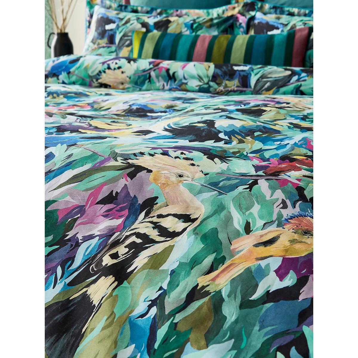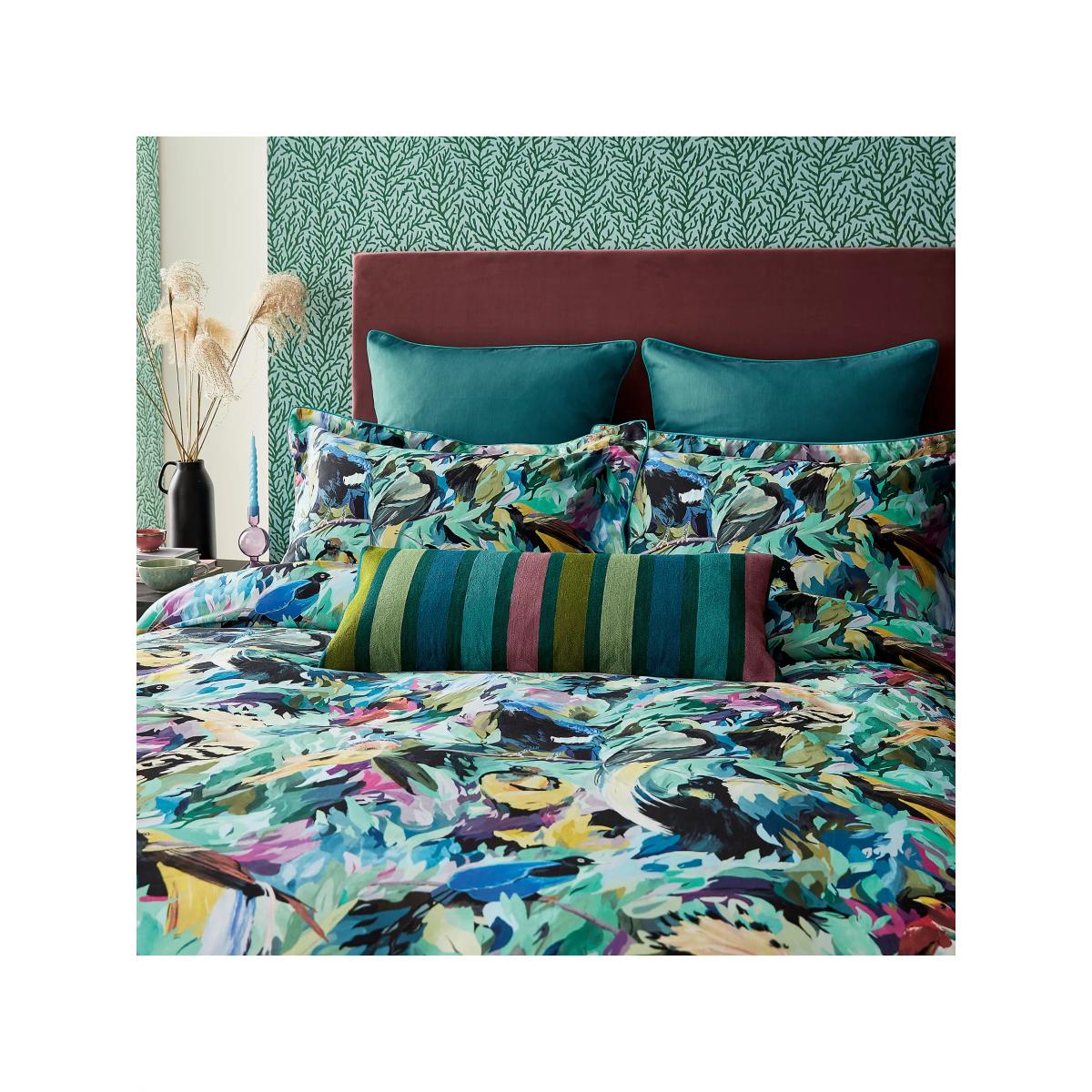 A wild, expressive dance of vibrancy, Dance of Adornment is a flurry of multicolours, with green bringing the design together in harmony. With a reverse in deep teal to offer a striking base, the abstract bird of paradise print on the front steals the show in magenta and cobalt with flashes of yellow. Please note: Duvet covers and pillowcases are available to purchase separately, and not in sets. Have you thought about sheeting? Shop here. Bedding sizes To fit duvet/pillow size (cm) Oxford pillowcase, L75 x W50cm (excluding trim) Single duvet cover, L200 x W135cm Double duvet cover, L200 x W200cm King duvet cover, L220 x W225cm Super king duvet cover, L220 x W260cm