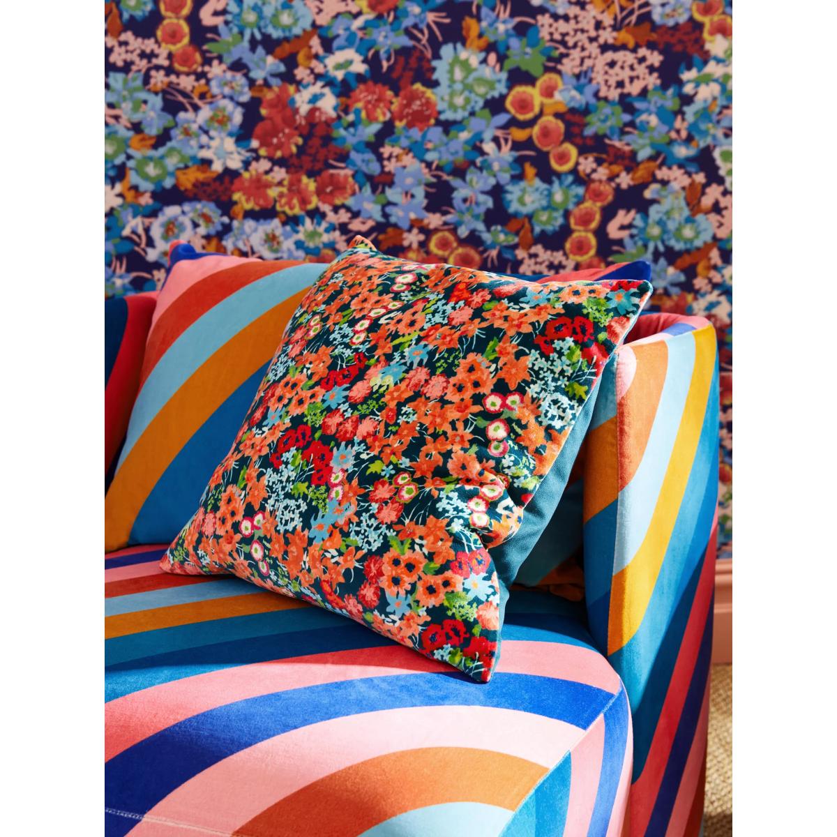 Taken from the Harlequin archive, this loosely interpreted impressionist floral cushion sings of colour confidence. Repainted in the studio, its joyous aesthetic packs a vibrant, flower-power punch. Wildflower Meadow is feather filled and ready to layer onto beds and sofas. Accessorise sofas or layer beds with this beautiful collection of nine feather-filled cushions. Available in a range of sizes and fabrics, including luxurious velvets and embroidered cotton, each vibrantly coloured design is inspired by the woodland garden of Sophie’s countryside home.
