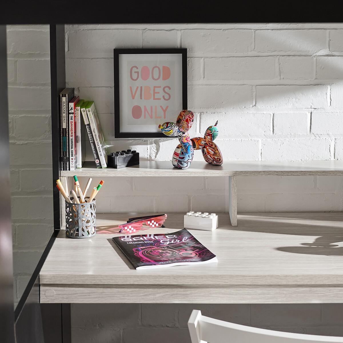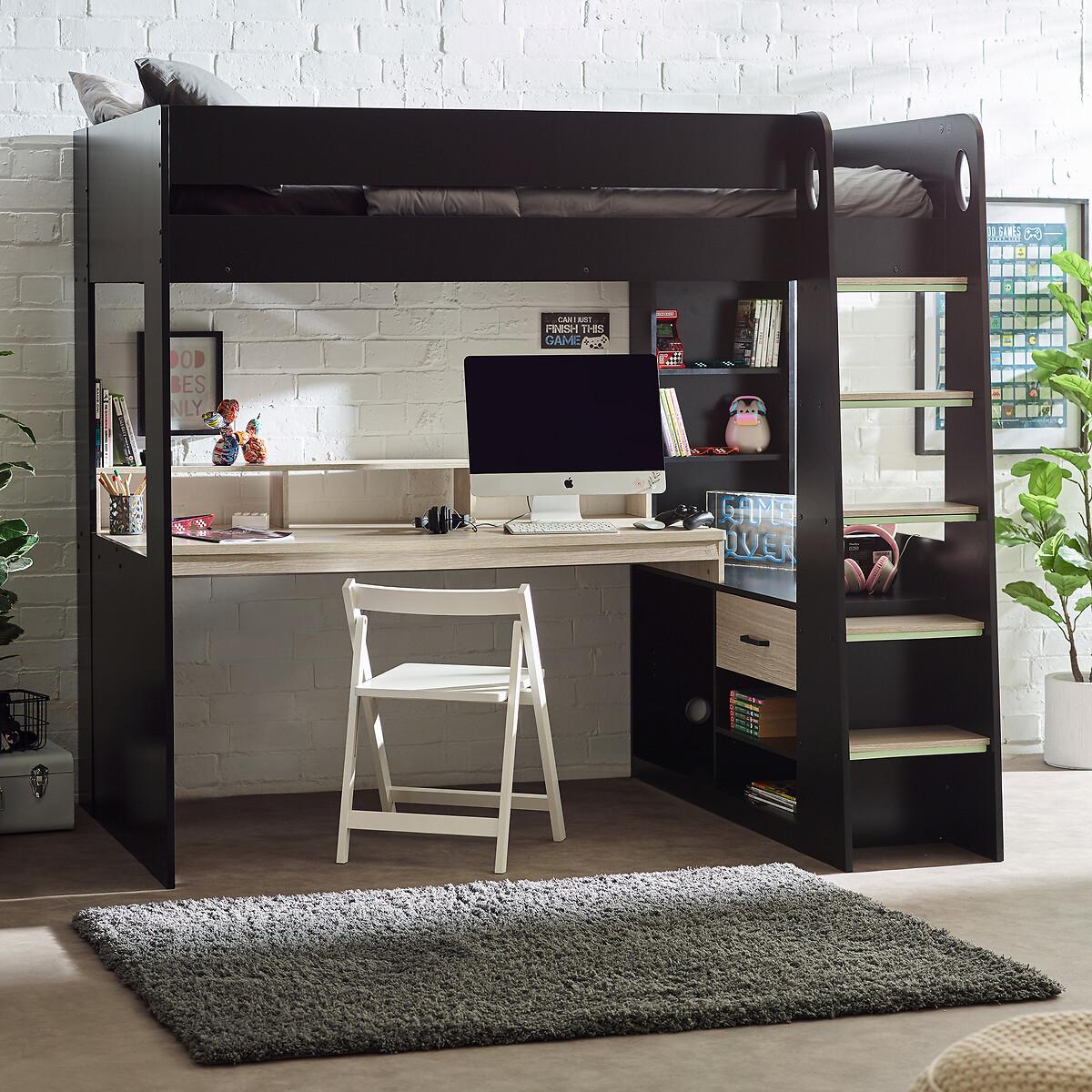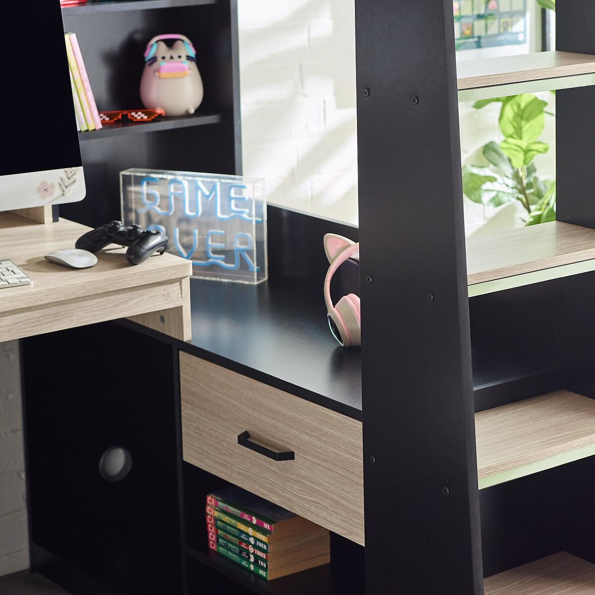 This beautiful bunk bed has built-in shelving and drawers, providing seamlessly organised storage. The wide-span desk offers abundant space for any gaming setup or homework, whilst raised platforms are perfect for accomodating extra monitors and books. Glow-in-the-dark steps help facilitate a safe access to the sleeping space. Product details• Extra wide desk included (chair not included)• Underbed storage unit under the ladder features a single deep drawer and built in shelving compartments, plus a deep storage compartment which can easily accomodate a desktop computer• Built in cable access points• Glow-in-the-dark ladder with wide steps• Assembly required• Fixings included• Max weight capacity - 14 stone• Compatible with Standard UK single 90 x 190 cm mattresses• Mattress not included• Maximum mattress height - 18cm. To minimise the danger of falling from the top bunk, we recommend that the top of the mattress should always be at least 16cm below the top of the lowest part of the guardrail. Composition - 100% Particleboard Overall Dimensions 196.6 cm x 141.1 cm x 178 cm , Weight - 123.8 KGBottom of side rail to floor - 138.5 cm Desk top shelves Dimensions• Left and Right Shelves - H15x W49 cm• Middle Shelf - H15 x W 50 cm. Shelves under drawer: H16.5 x W55 cm Desk Dimensions - Desk: H74 x W154.5 x D59 cm. Clerance under desk: 60 cm Package Dimensions:Parcel 1 Packaged Dimensions - 144.4 cm x 79.9 cm x 9.5 cm, Weight 34 KGParcel 2 Packaged Dimensions - 189.1 cm x 33.9 cm x 18 cm, Weight 36 KGParcel 3 Packaged Dimensions - 163.1 cm x 65.1 cm x 10.8 cm, Weight 37 KGParcel 4 Packaged Dimensions - 201 cm x 36.1 cm x 15 cmcm, Weight 29 KGPlease note: this product cannot be be delivered to all Offshore Islands Northern Ireland or Republic of Ireland. This product will be dispatched by one of our trusted suppliers. You’ll be contacted by their selected courier about your delivery.