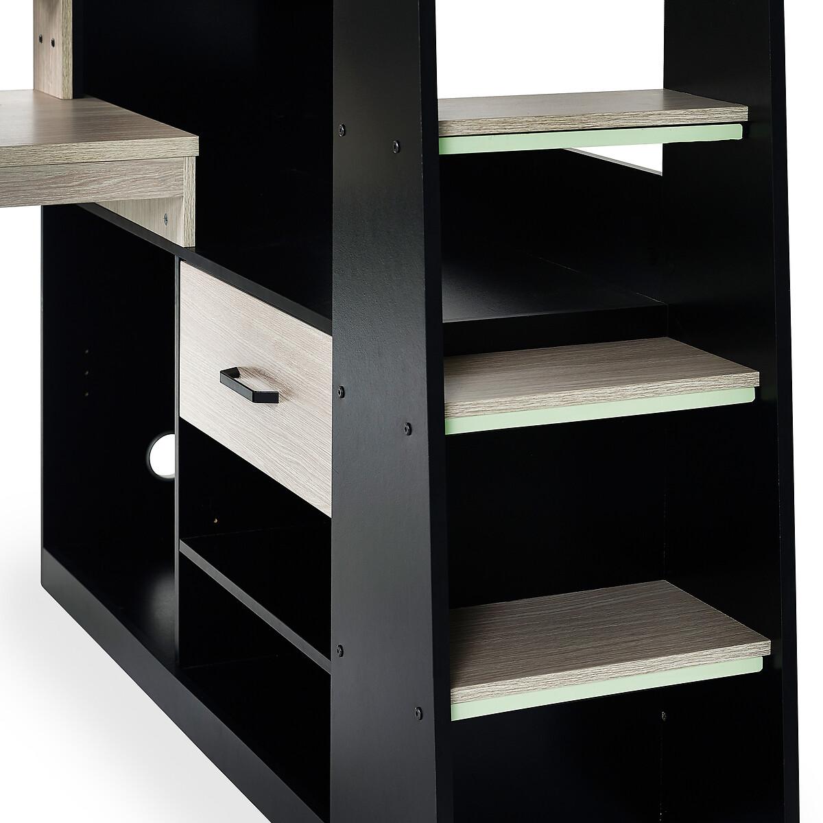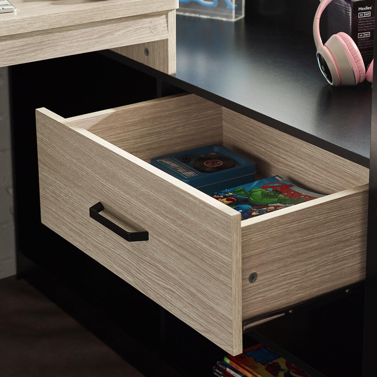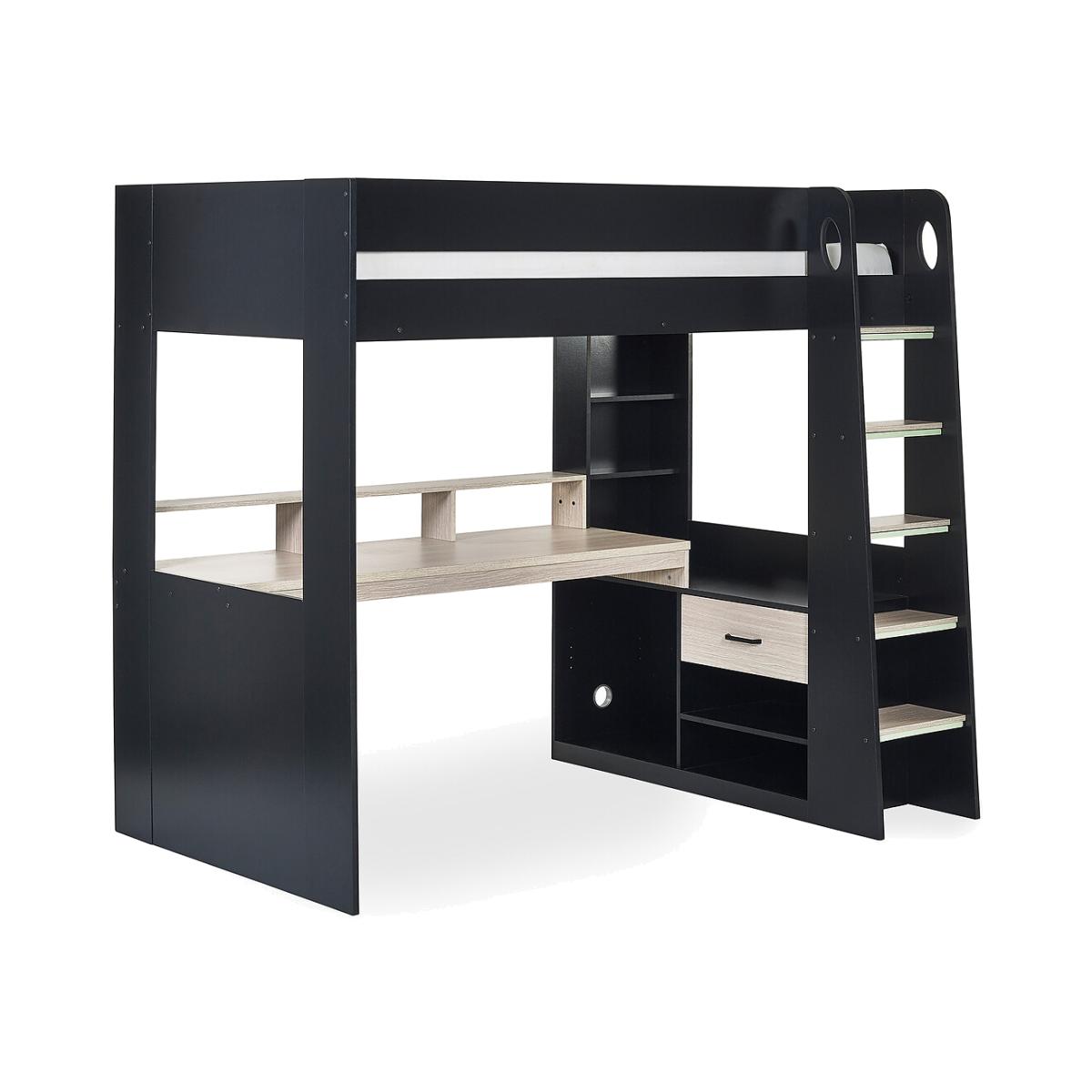 This beautiful bunk bed has built-in shelving and drawers, providing seamlessly organised storage. The wide-span desk offers abundant space for any gaming setup or homework, whilst raised platforms are perfect for accomodating extra monitors and books. Glow-in-the-dark steps help facilitate a safe access to the sleeping space. Product details• Extra wide desk included (chair not included)• Underbed storage unit under the ladder features a single deep drawer and built in shelving compartments, plus a deep storage compartment which can easily accomodate a desktop computer• Built in cable access points• Glow-in-the-dark ladder with wide steps• Assembly required• Fixings included• Max weight capacity - 14 stone• Compatible with Standard UK single 90 x 190 cm mattresses• Mattress not included• Maximum mattress height - 18cm. To minimise the danger of falling from the top bunk, we recommend that the top of the mattress should always be at least 16cm below the top of the lowest part of the guardrail. Composition - 100% Particleboard Overall Dimensions 196.6 cm x 141.1 cm x 178 cm , Weight - 123.8 KGBottom of side rail to floor - 138.5 cm Desk top shelves Dimensions• Left and Right Shelves - H15x W49 cm• Middle Shelf - H15 x W 50 cm. Shelves under drawer: H16.5 x W55 cm Desk Dimensions - Desk: H74 x W154.5 x D59 cm. Clerance under desk: 60 cm Package Dimensions:Parcel 1 Packaged Dimensions - 144.4 cm x 79.9 cm x 9.5 cm, Weight 34 KGParcel 2 Packaged Dimensions - 189.1 cm x 33.9 cm x 18 cm, Weight 36 KGParcel 3 Packaged Dimensions - 163.1 cm x 65.1 cm x 10.8 cm, Weight 37 KGParcel 4 Packaged Dimensions - 201 cm x 36.1 cm x 15 cmcm, Weight 29 KGPlease note: this product cannot be be delivered to all Offshore Islands Northern Ireland or Republic of Ireland. This product will be dispatched by one of our trusted suppliers. You’ll be contacted by their selected courier about your delivery.