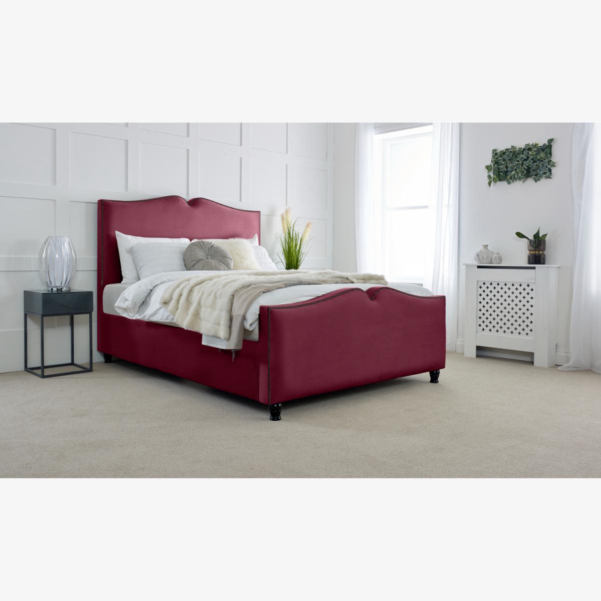 Sleep in style with this beautifully designed bed frame. Available in various velvet fabrics, the Harling features a heart-shaped headboard and footboard, expertly constructed with plush foam padding that is perfect as a headrest when sitting up and reading in bed. Harling is stylishly handcrafted and features gold and black side studding with a plush velvet fabric for a perfect aesthetic feel. It also comes with a solid board base and wooden feet that ensure stability and utmost support. This piece will transform your bedroom into a luxurious palace and somewhere you would look forward to ending your day in. the mattress and other accessories in the image are not included in the package.