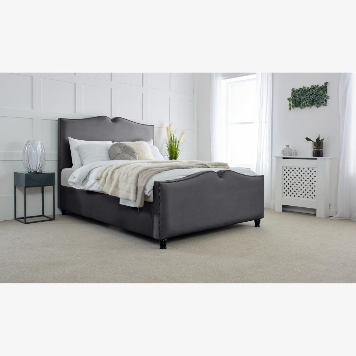 Sleep in style with this beautifully designed bed frame. Available in various velvet fabrics, the Harling features a heart-shaped headboard and footboard, expertly constructed with plush foam padding that is perfect as a headrest when sitting up and reading in bed. Harling is stylishly handcrafted and features gold and black side studding with a plush velvet fabric for a perfect aesthetic feel. It also comes with a solid board base and wooden feet that ensure stability and utmost support. This piece will transform your bedroom into a luxurious palace and somewhere you would look forward to ending your day in. the mattress and other accessories in the image are not included in the package.