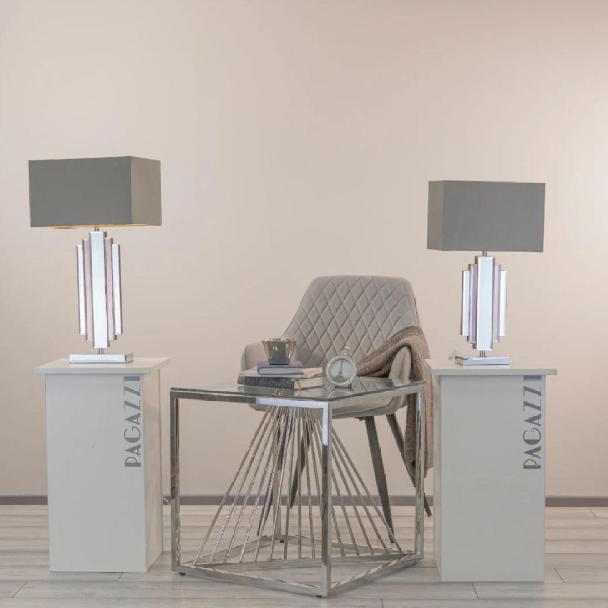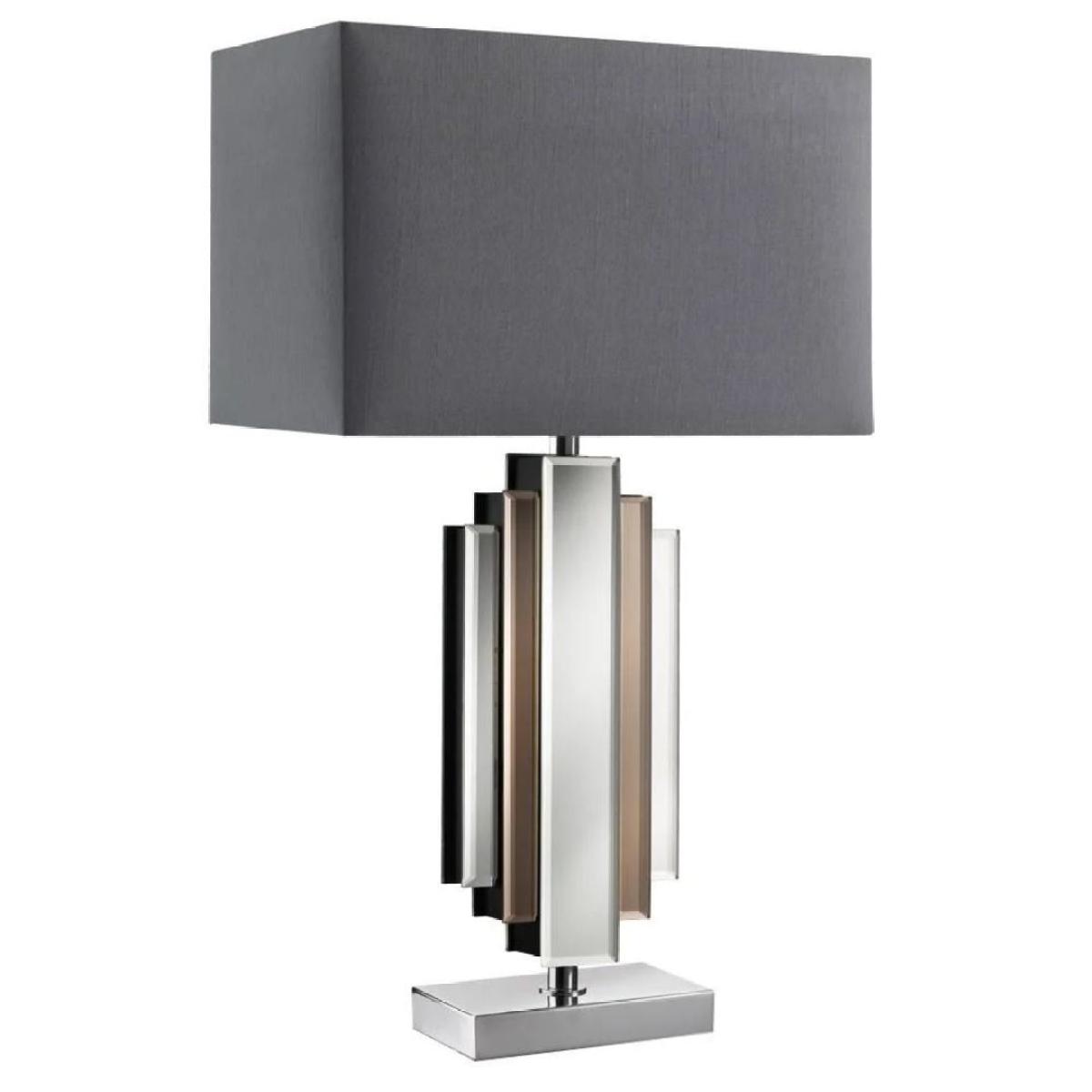 Contemporary Silver Table Lamp with Rectangular Shade. The Harlow table lamp is a gorgeous piece exclusive to PAGAZZI Lighting. This uniquely designed lamp features a polished chrome finish throughout as well as boasting both mirrored and smoked mirrored sections on its base. Style this light with one of our vast selection of LED E27 light bulbs Contemporary Silver Table Lamp with Rectangular Shade. The Harlow table lamp is a gorgeous piece exclusive to PAGAZZI Lighting. This uniquely designed lamp features a polished chrome finish throughout as well as boasting both mirrored and smoked mirrored sections on its base. Style this light with one of our vast selection of LED E27 light bulbs