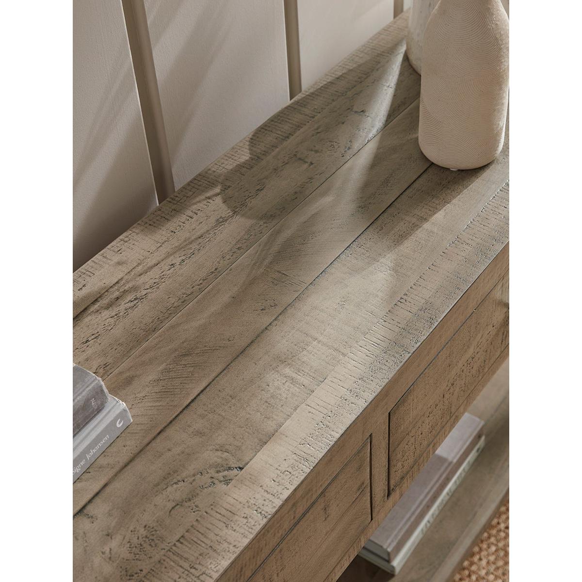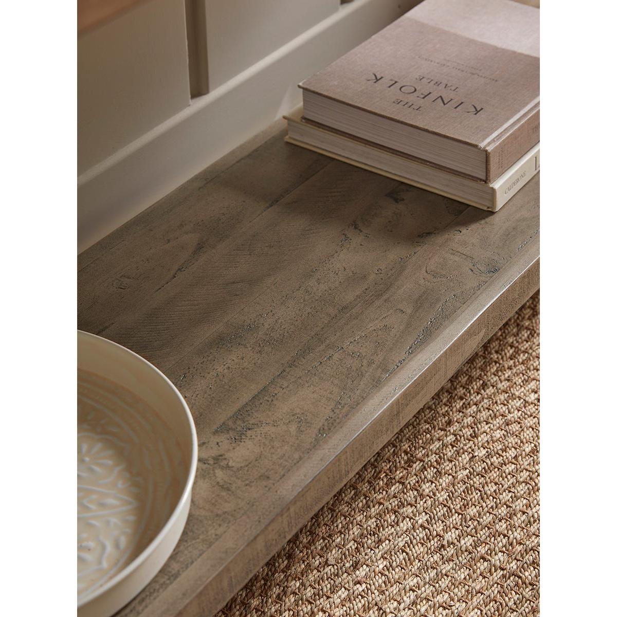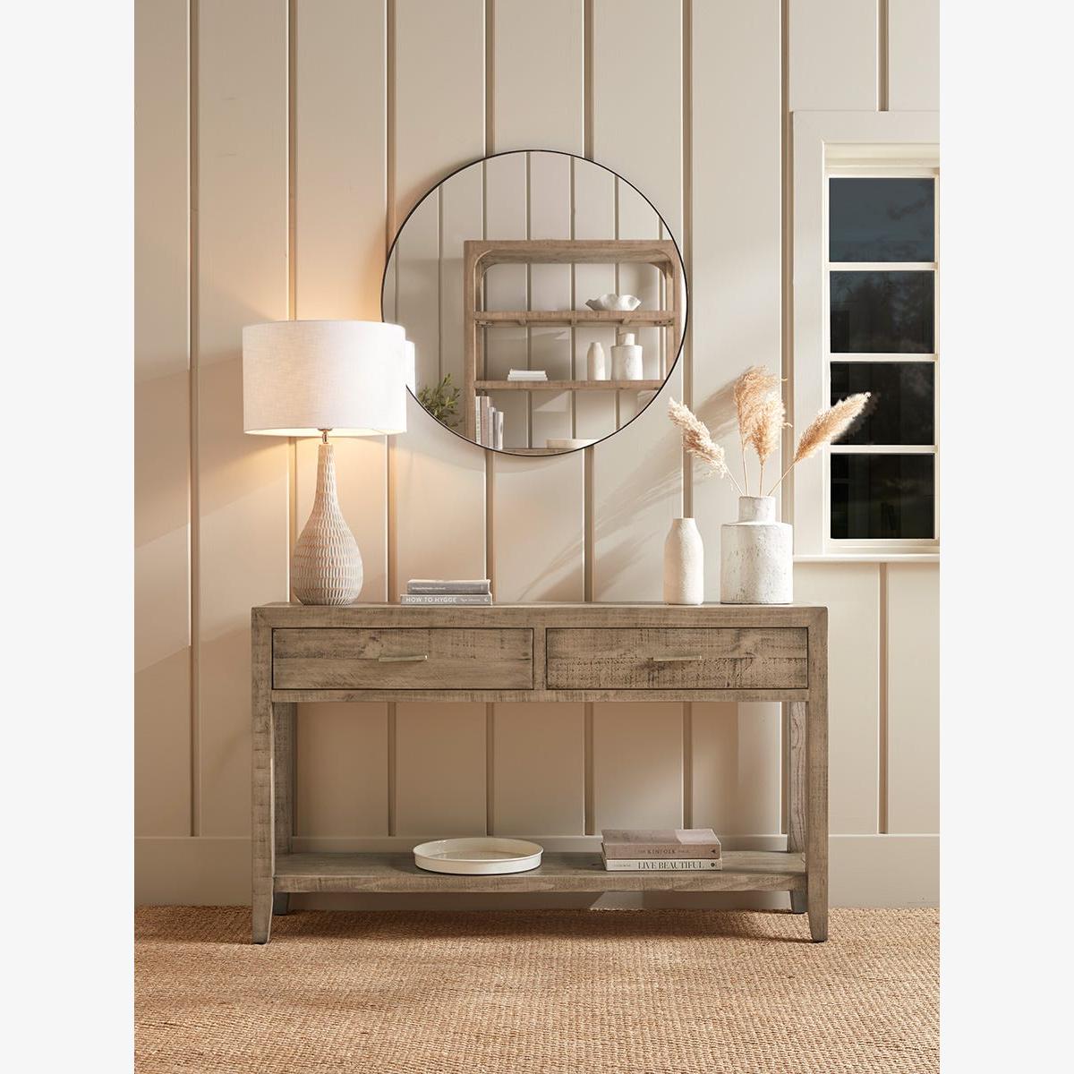 I’m drawn to the Harlow console’s gently weathered oak finish and clean-lined silhouette - it sits equally well in a coastal cottage hallway, a relaxed Scandinavian-inspired living space or a pared-back modern farmhouse. Its slim depth makes it ideal for narrow corridors or behind a sofa, and the lower shelf adds useful display or storage without feeling bulky. For styling, start with a round mirror or simple artwork centred above, then balance a lamp on one side with a sculptural vase or small plant on the other. Use a shallow tray for keys or loose bits, and introduce texture by stacking a couple of books or adding a woven basket on the bottom shelf. Keep accessories to a minimum and vary heights for a calm yet collected look.