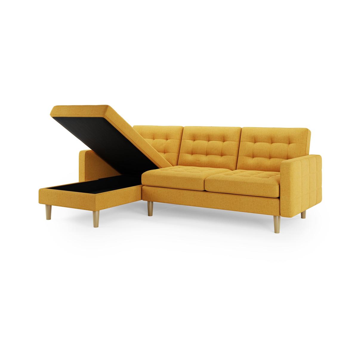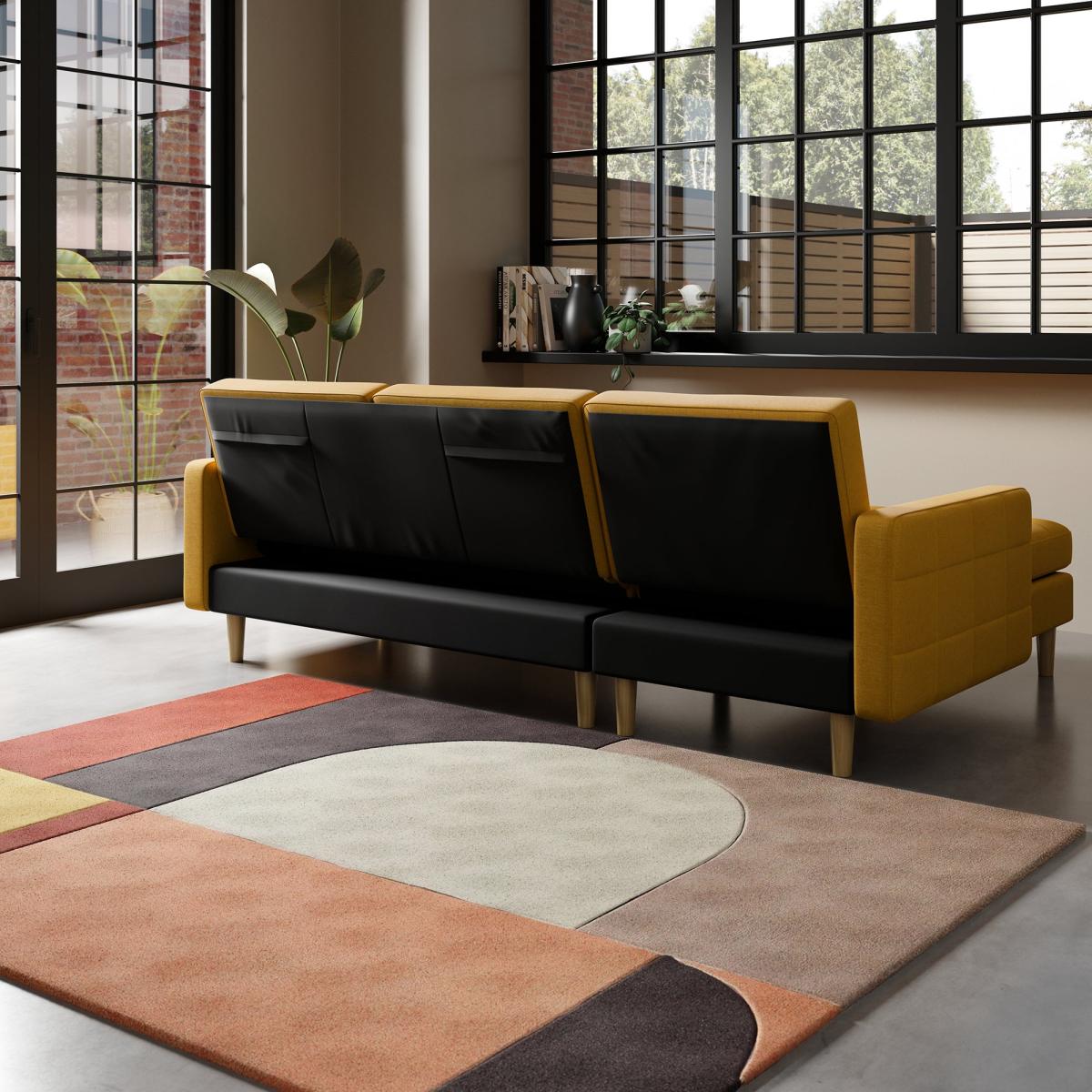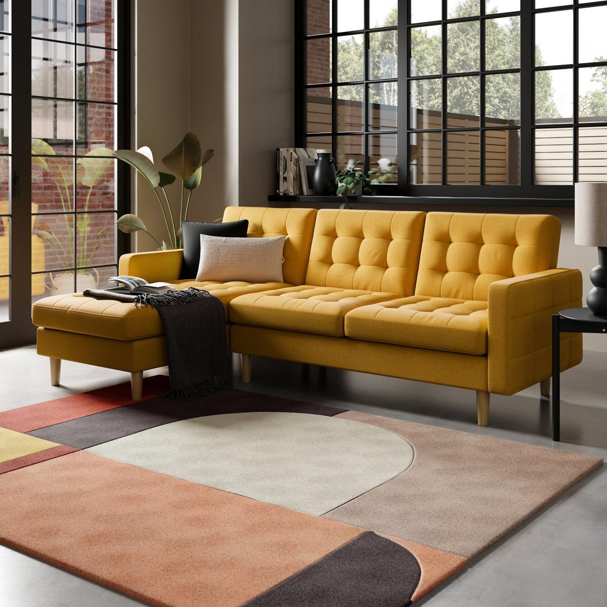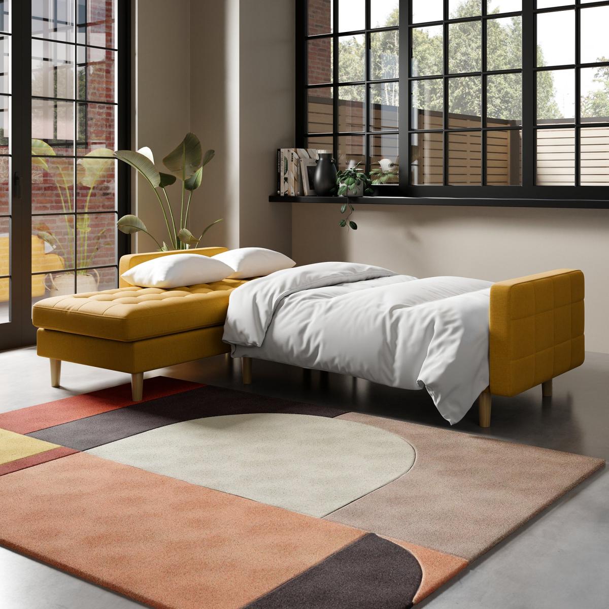 I love this sofa for its bold ochre colour and sleek, modern silhouette, which instantly adds warmth and personality to a space. It works particularly well in contemporary or mid-century inspired interiors, where clean lines and vibrant accents make a statement. Practical styling tips include pairing it with neutral or muted-toned cushions to balance the colour, and grounding the look with a layered rug, like the one in the picture. Its corner design is ideal for maximising seating in compact spaces or creating a cosy lounge area in open-plan rooms. As a sofa bed, it also offers versatility-perfect for hosting overnight guests without compromising style.
