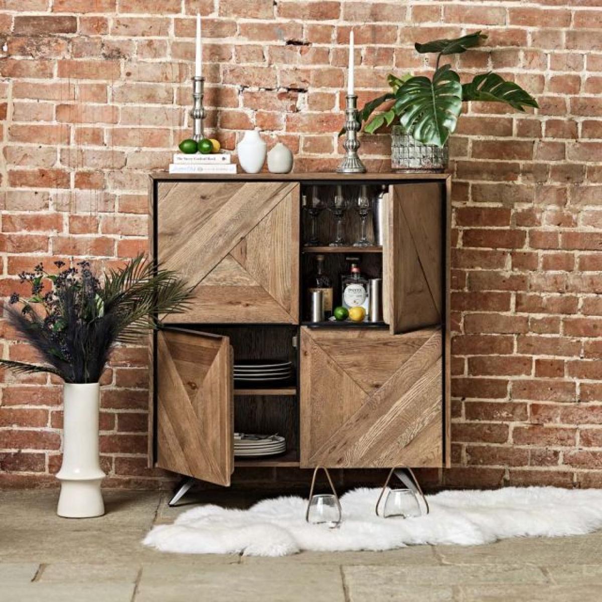 The Harlow Highboard is a great storage option for any kitchen or dining room. Showcasing the gorgeous timber in the Harlow range, this unit features four large cupboards in a two over two configuration. The timber is cut on the bias allowing for a great geometric pattern across the doors. Thin metal handles allow for easy access, and the whole unit is supported by sturdy industrial style metal legs.