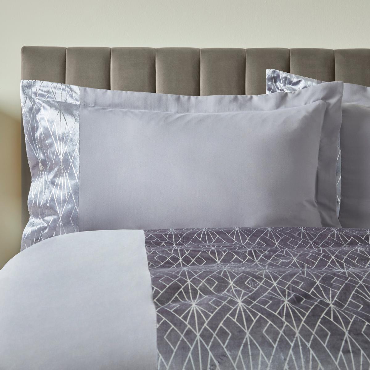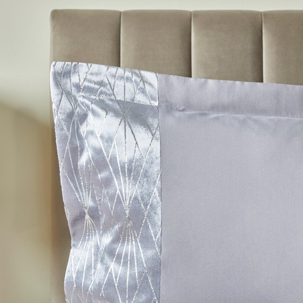 Our Harlow Oxford Pillowcase features a solid silver velvet panel which is perfect for a bedroom with a glam style. A 100% polyester composition gives the material a soft hand feel. Fully machine washable. This collection is verified by OEKO-TEX® and independently tested for harmful substances as well as manufactured using sustainable processes under socially responsible working conditions. MADE IN GREEN by OEKO-TEX® is a unique product label to trace the countries and production facilities - search the product label for more information.