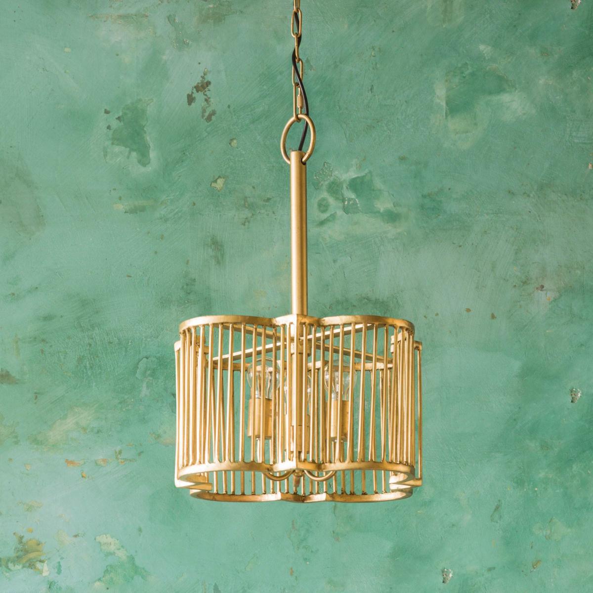 A striking ceiling light with a scalloped-cage design encasing three bulbs. Handcrafted from iron by talented artisans with a shiny brass finish.