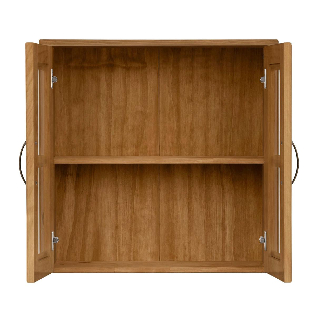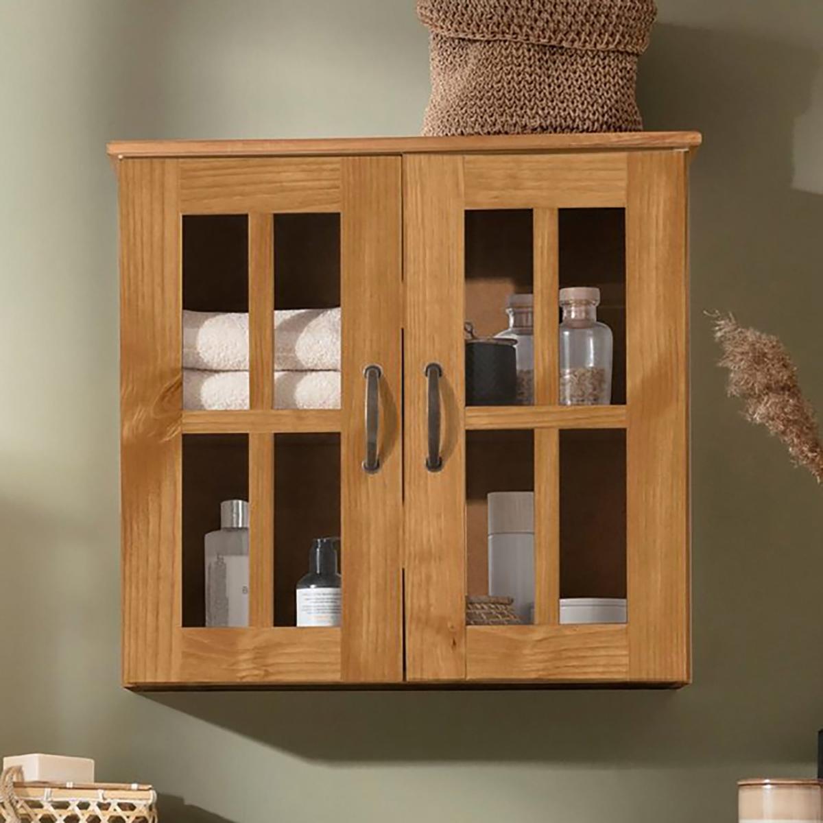 * Glass and Wood Cabinet* Large Shelves for Storage* Metal Handles* Wall Mounted Designed with two glass front doors and shelves behind them, this wall-mounted cabinet offers an elegant solution for organising bathroom essentials. Crafted with durable materials, metal handles, and easy-to-clean surfaces, it effortlessly blends functionality with a contemporary look, providing a refined addition to your bathroom decor. Click [here](https://www. dunelm. com/info/buying-guides/bathroom-furniture-buying-guide) to view the Bathroom Furniture buying guide.