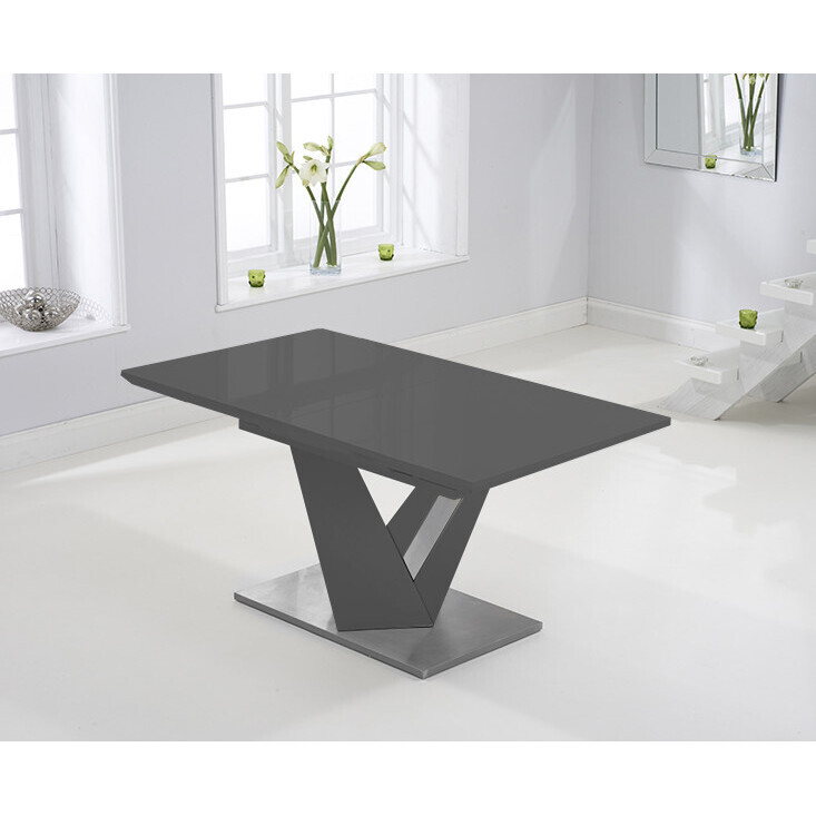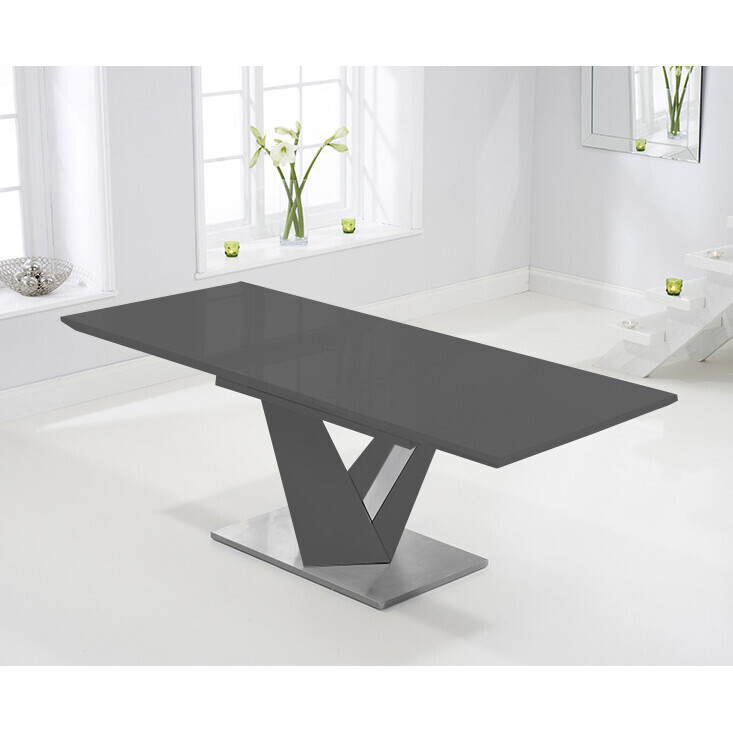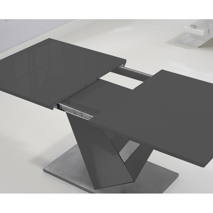 The Harmony 160cm Extending Dark Grey High Gloss Dining Table brings sleek contemporary style to your dining area. Seating 6 people, the dark grey gloss dining table extends via an inbuilt butterfly feature to seat 10 making it a stylish and practical setting for every occasion. Smooth and modern extending dark grey high gloss dining table. Seats 6 people and extends to seat 10; perfectly practical and ideal for every occasion. Extends from 160cm to 220cm in length via convenient inbuilt butterfly feature. Solid wood construction with wipe-clean high gloss finish. Unique V pedestal with chrome strips supports the table and completes the look. Also available to purchase with Malaga Chairs or Hampstead Z Chairs