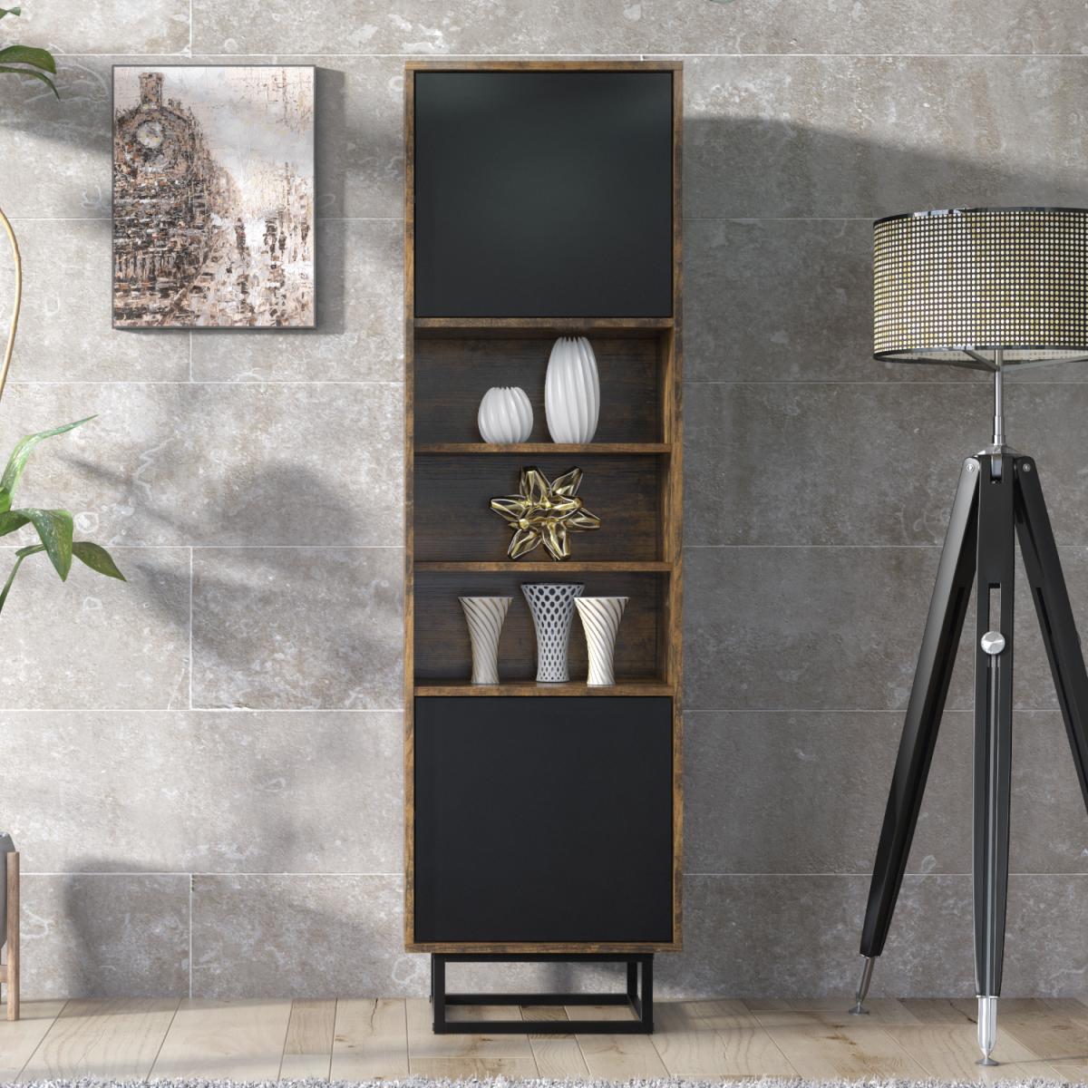 The Harmony Loft Display Cabinet elevates your living space with its sleek design and practical functionality, making it an ideal storage solution for modern interiors. Measuring 50cm (W) x 175cm (H) x 35cm (D), this tall and elegant cabinet perfectly blends industrial-inspired aesthetics with everyday usability. Featuring two push-to-open doors, it offers spacious compartments with internal shelves, providing ample room to neatly organize essentials or conceal clutter. Between the doors are three open compartments, perfect for displaying decorative items, books, or collectibles, allowing you to add a personal touch to your space. Supported by sturdy black metal legs, the cabinet combines stability with a contemporary, industrial flair, while its clean lines and minimalist design make it a versatile addition to any room. Crafted from durable MDF and chipboard, the Harmony Loft Display Cabinet is built to last without compromising on style. Available in Dark Oak, Dark Oak Black Matte Doors, and Rustic Black Matte Doors.