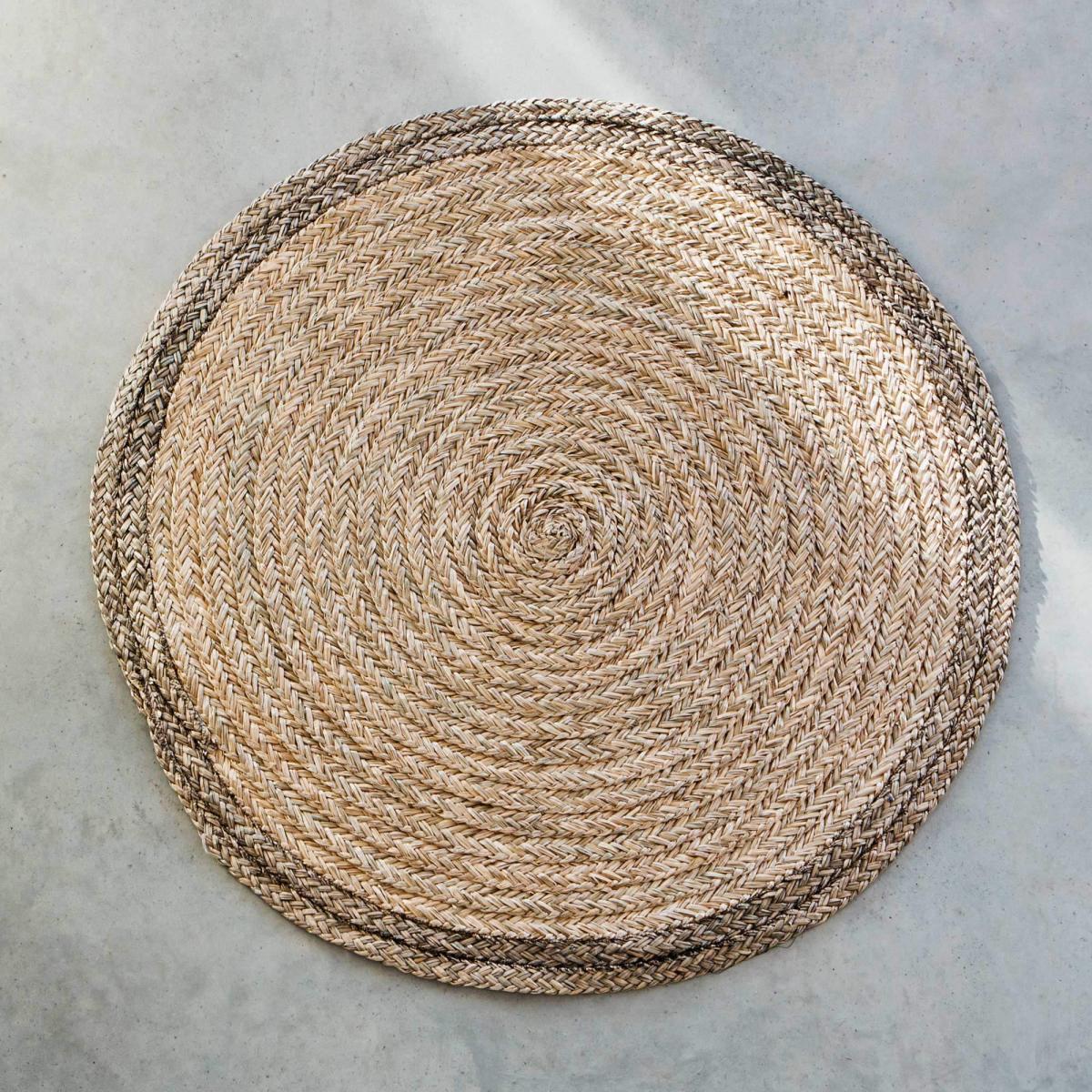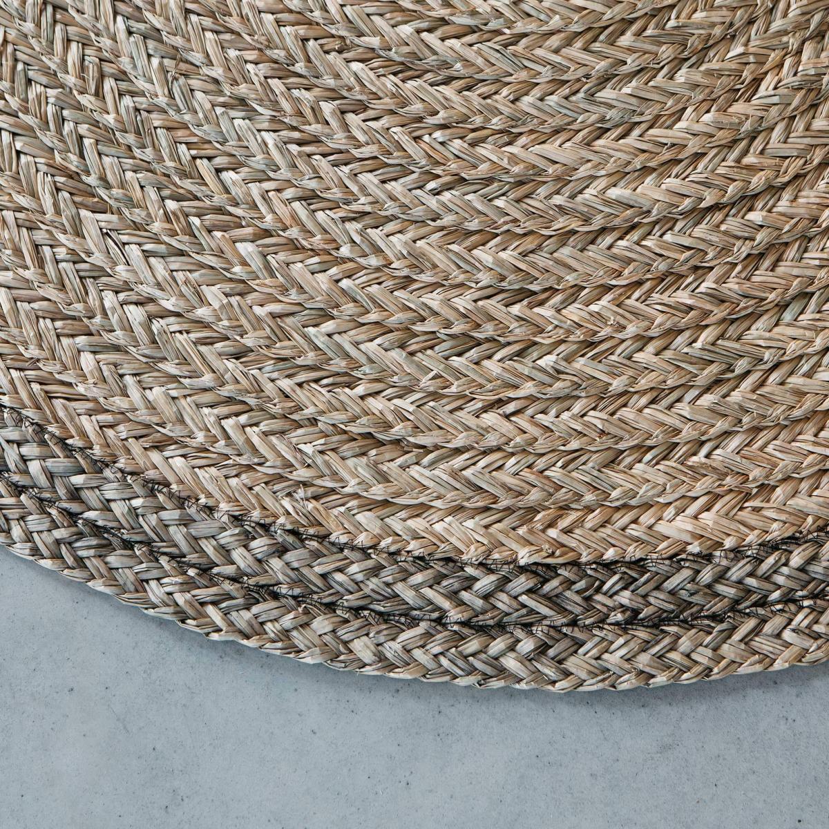 A natural round rug braided from natural seagrass with a grey border to introduce organic texture to your bedroom or sitting room.