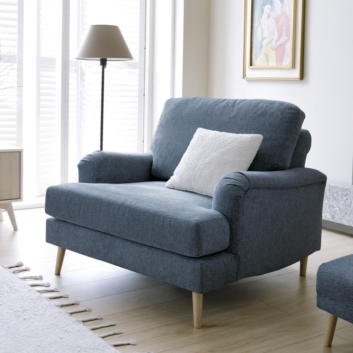 I’m a fan of this Harper armchair for its deep-blue chenille upholstery and clean lines - it brings texture without overwhelming a room. The slim, natural-wood legs give it a light, Scandi feel, so it sits just as comfortably in a pared-back, contemporary living room as it does in a cosy, coastal-inspired space. For styling, layer a pale linen or ivory cushion against the back for contrast, then drape a neutral throw over one arm to soften the look. Pair it with a simple side table and a tall floor lamp to create a reading nook, or float two either side of a low-profile sofa to anchor a conversation area. The durable fabric makes it ideal for high-traffic spots, and the dark blue hue works well with muted greys, warming brass accents or natural timber finishes.
