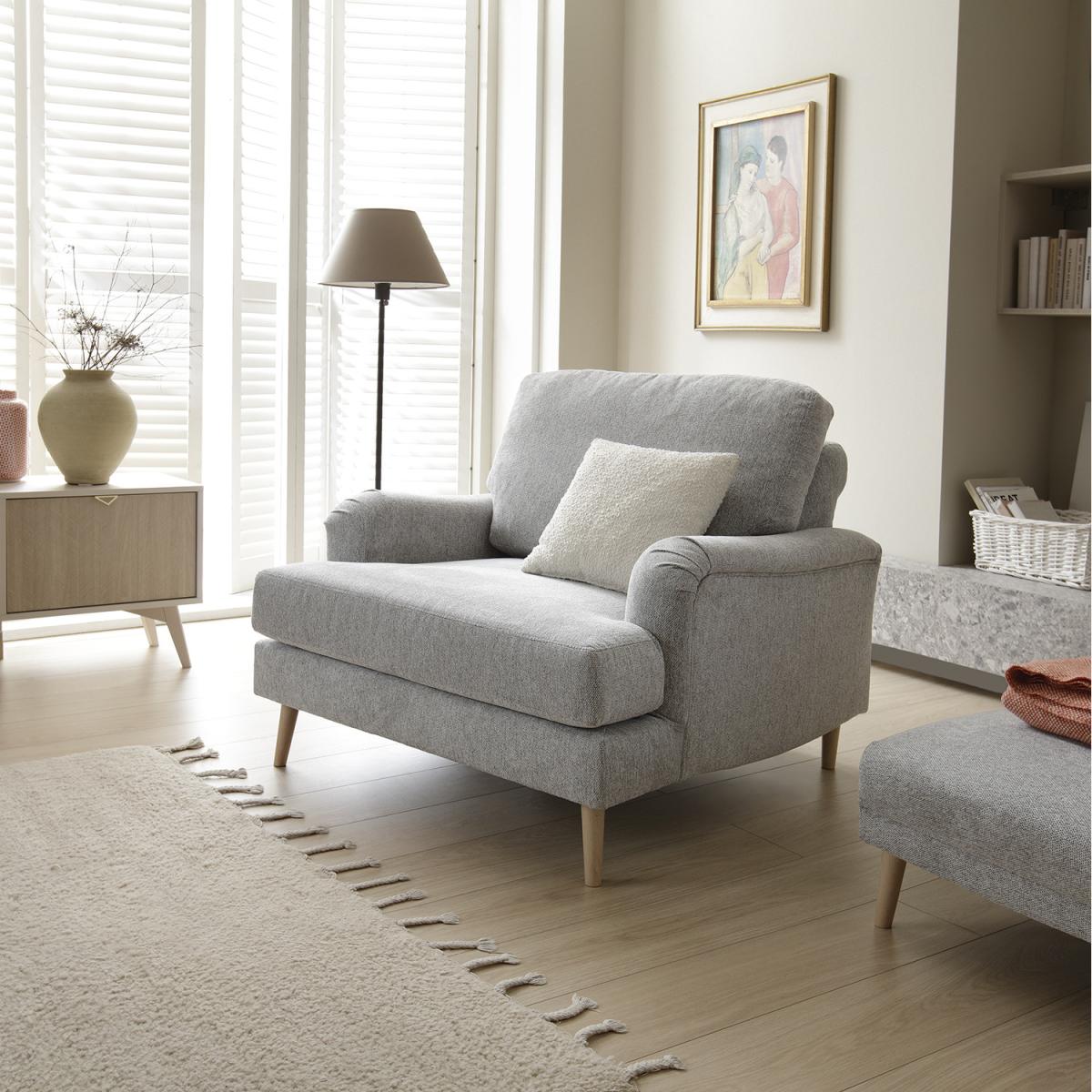I love how the Harper chair’s soft chenille upholstery and pared-back silhouette work equally well in Scandi-inspired, modern farmhouse or contemporary settings. The light-grey hue provides a versatile neutral base that you can warm up with timber accents or keep crisp with monochrome décor. For styling, layer a textured cushion in slate blue or muted ochre and drape a chunky knit throw over one arm to create a cosy reading nook. Its compact scale makes it ideal for smaller rooms, while the turned legs and rolled arms give it enough presence to stand alone - simply add a slimline floor lamp and a neat side table for a perfectly balanced look.