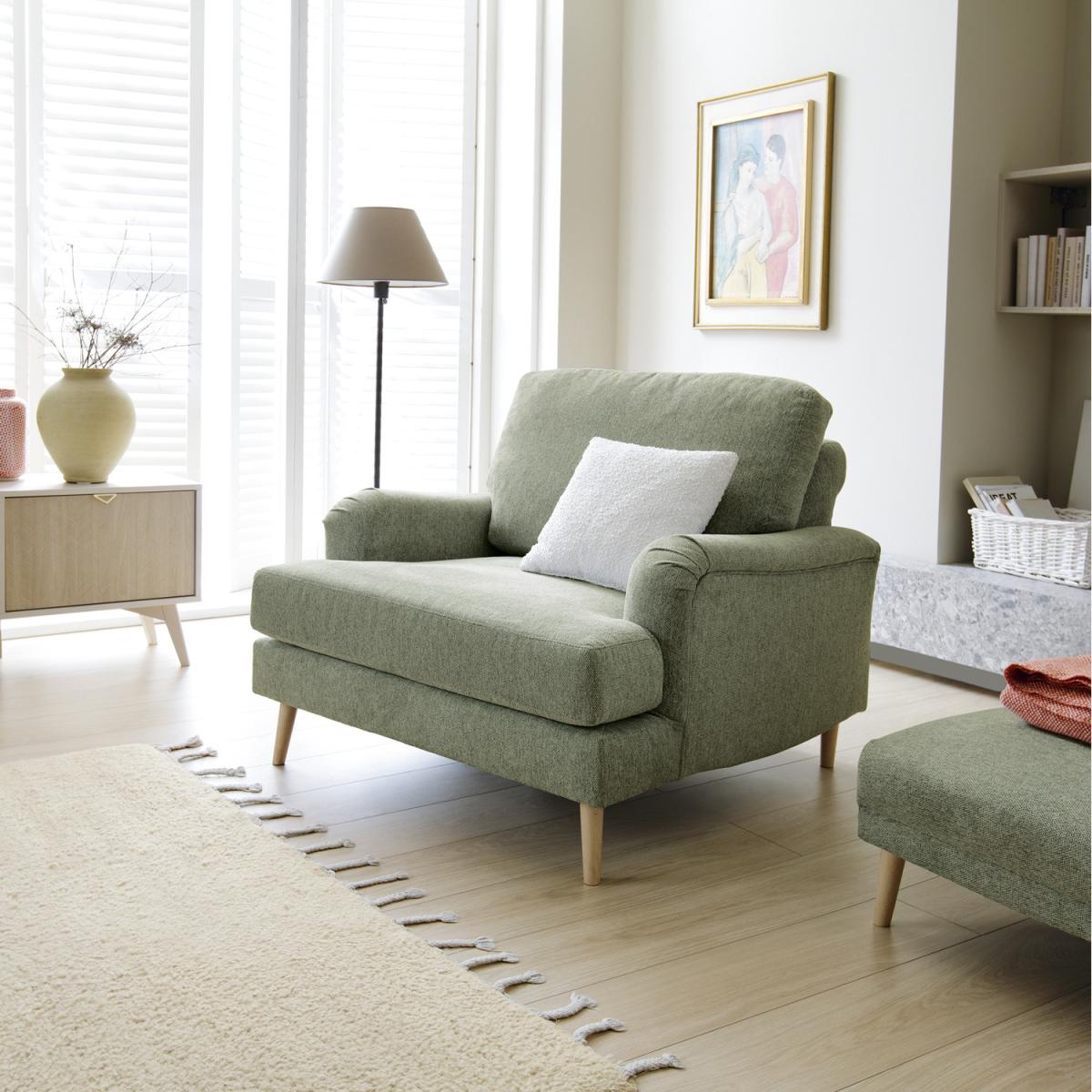 I’m a fan of this pickle-green armchair for its neat, compact proportions and softly textured fabric - it adds just the right hit of colour without overwhelming a room. The clean lines and beech legs suit Scandi, contemporary or mid-century spaces equally well, and the smart chenille cover is hard-wearing and simple to keep looking fresh. For styling, balance the green with warm neutrals - think woven rugs, a couple of linen cushions in natural tones and a slim, light-wood side table. Tuck it into a reading corner with a floor lamp, or pair two together in a living area with a low coffee table to create a cosy, laid-back seating spot.