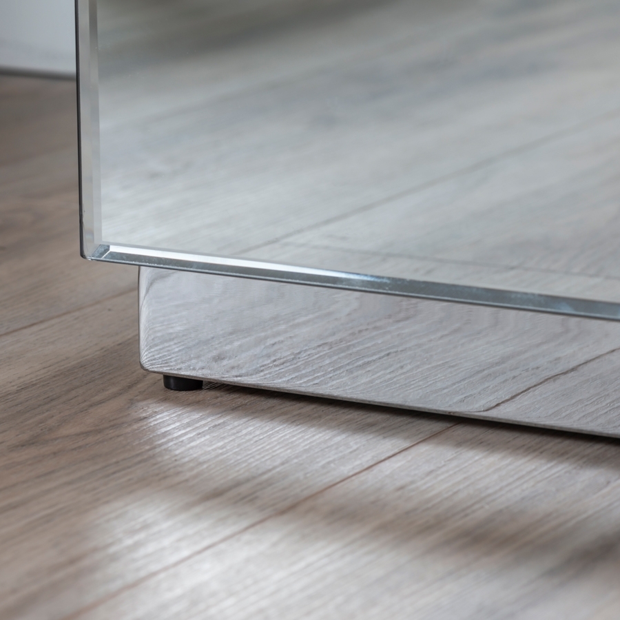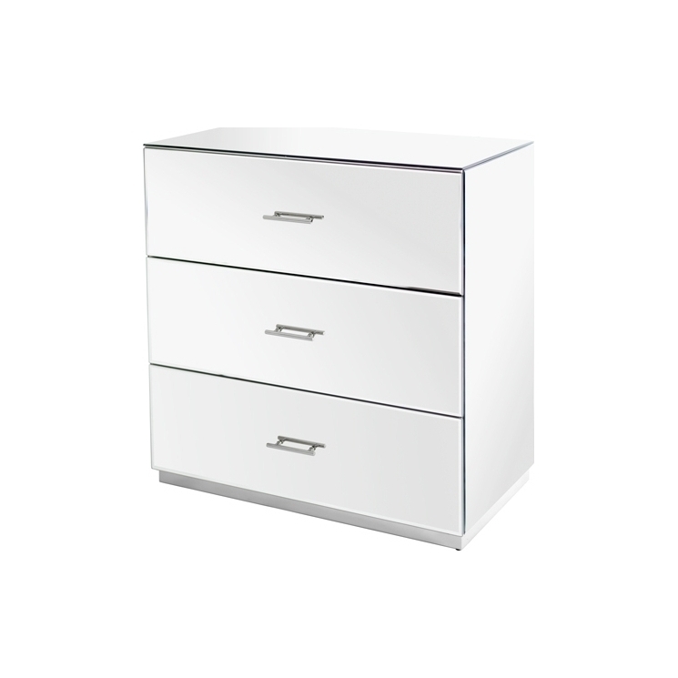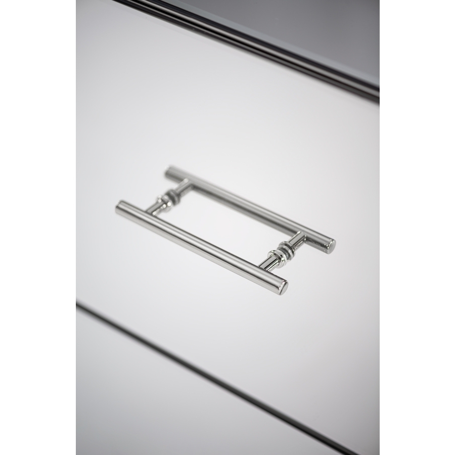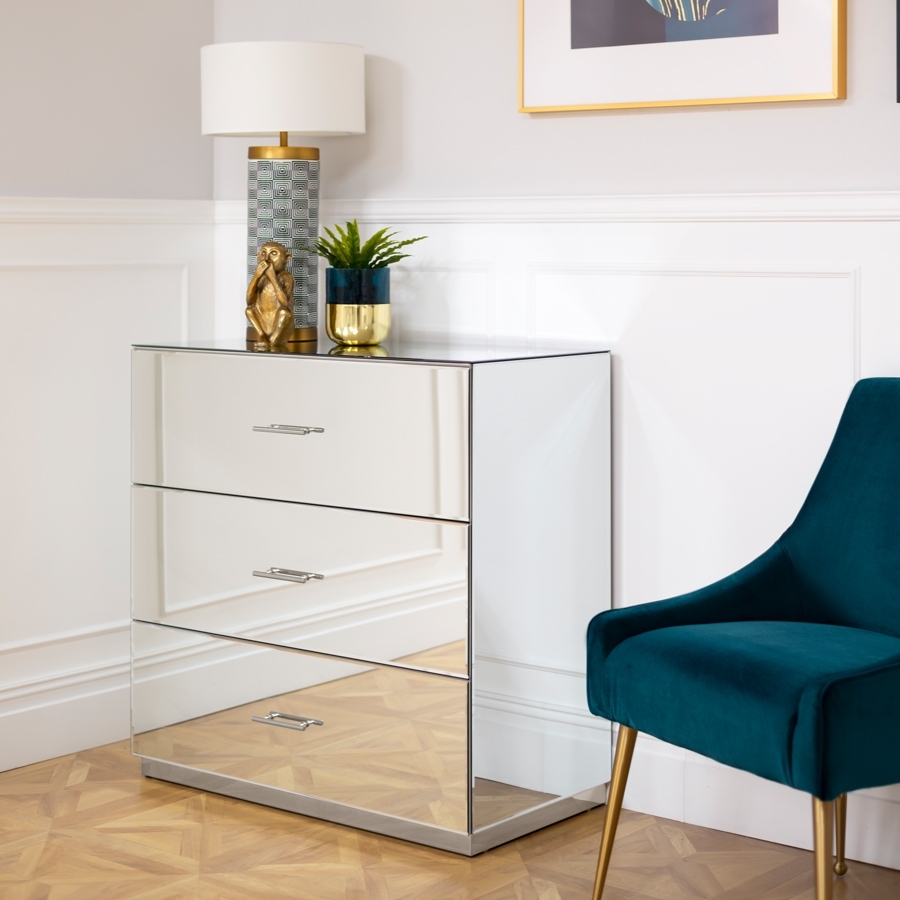 An understated, elegant chest suitable for any style interior. Three spacious drawers with high quality drawer runners. Toughened mirrored glass. Polished chrome handles and base. Pale grey painted drawer boxes. Simple assembly Required.