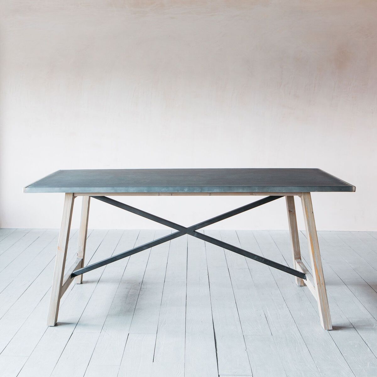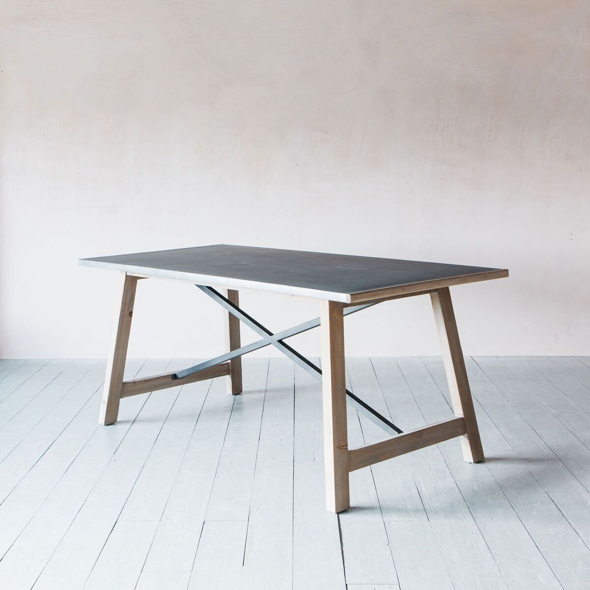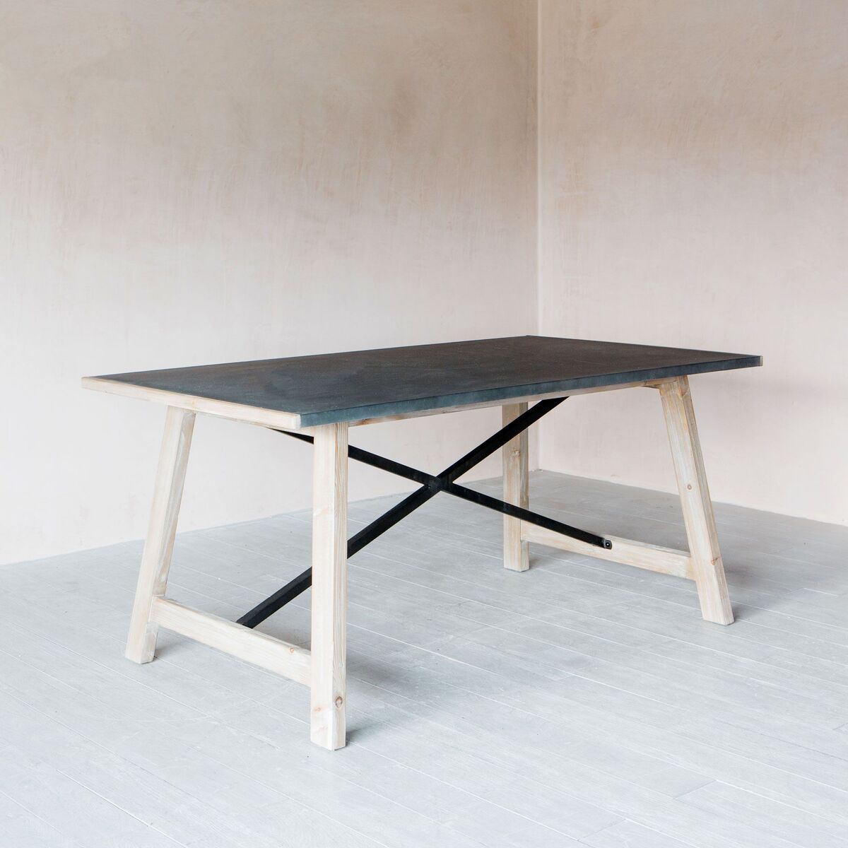A contemporary dining table inspired by industrial design, featuring a reclaimed pine frame and a zinc top. The Harper is finished with beautiful attention to detail, including a pine edging along the table top that softens the metallic finish.