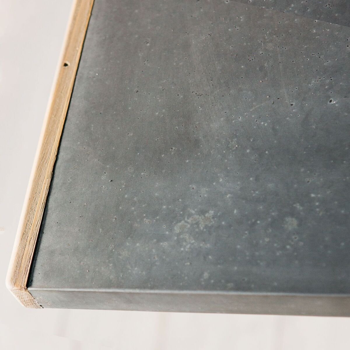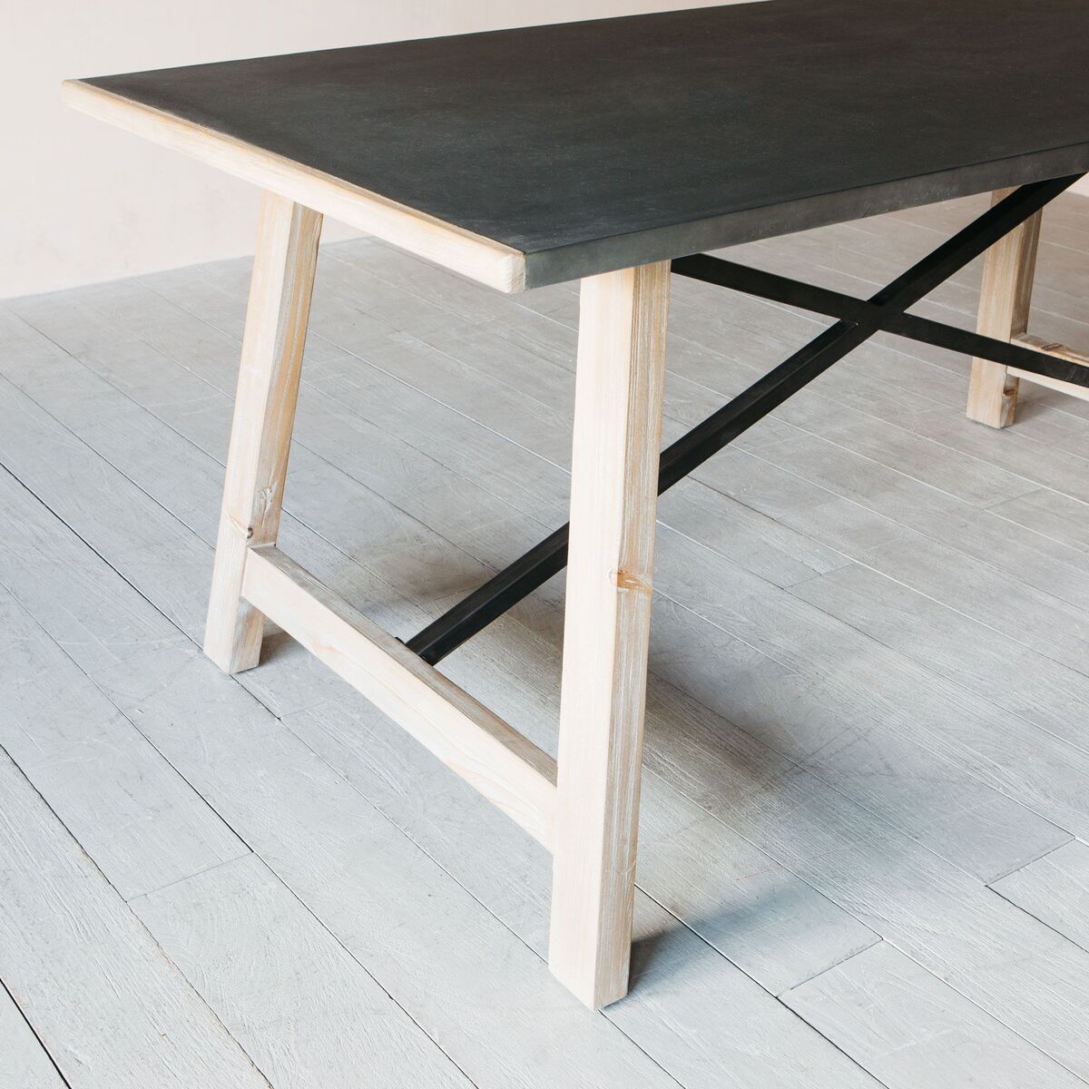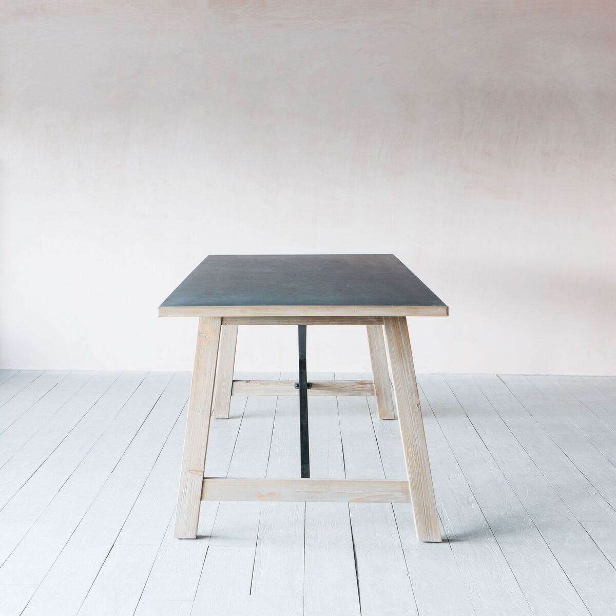 A contemporary dining table inspired by industrial design, featuring a reclaimed pine frame and a zinc top. The Harper is finished with beautiful attention to detail, including a pine edging along the table top that softens the metallic finish.