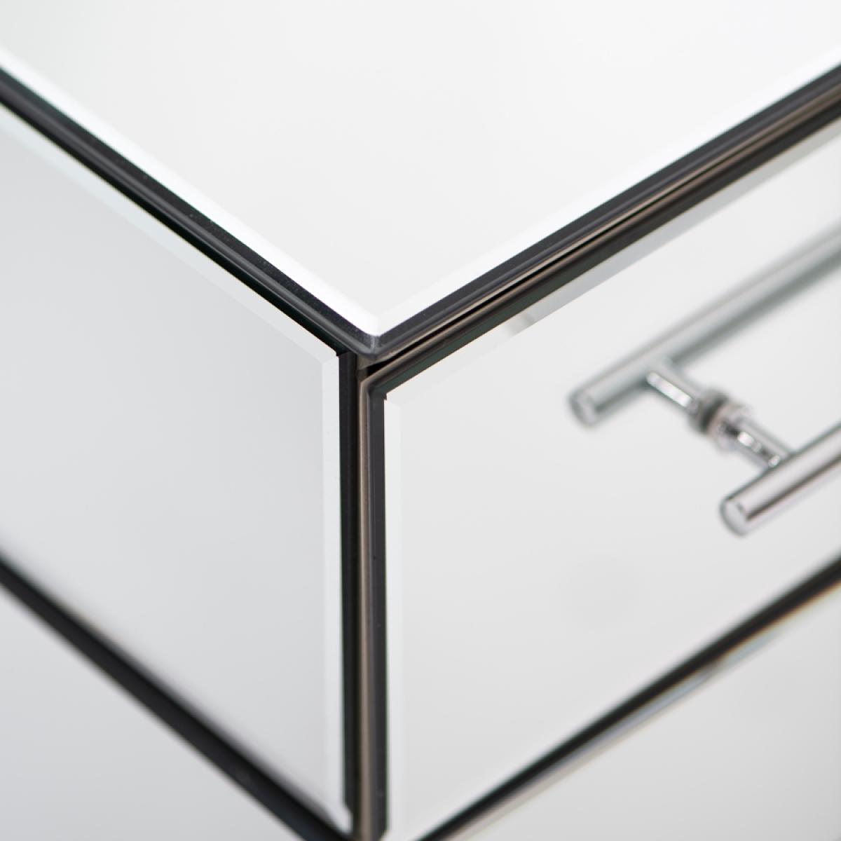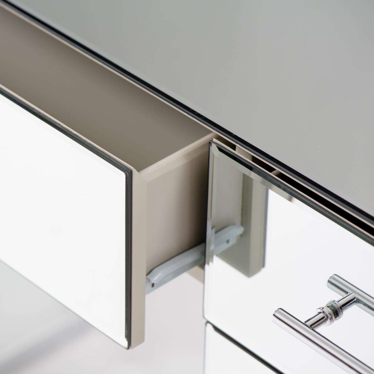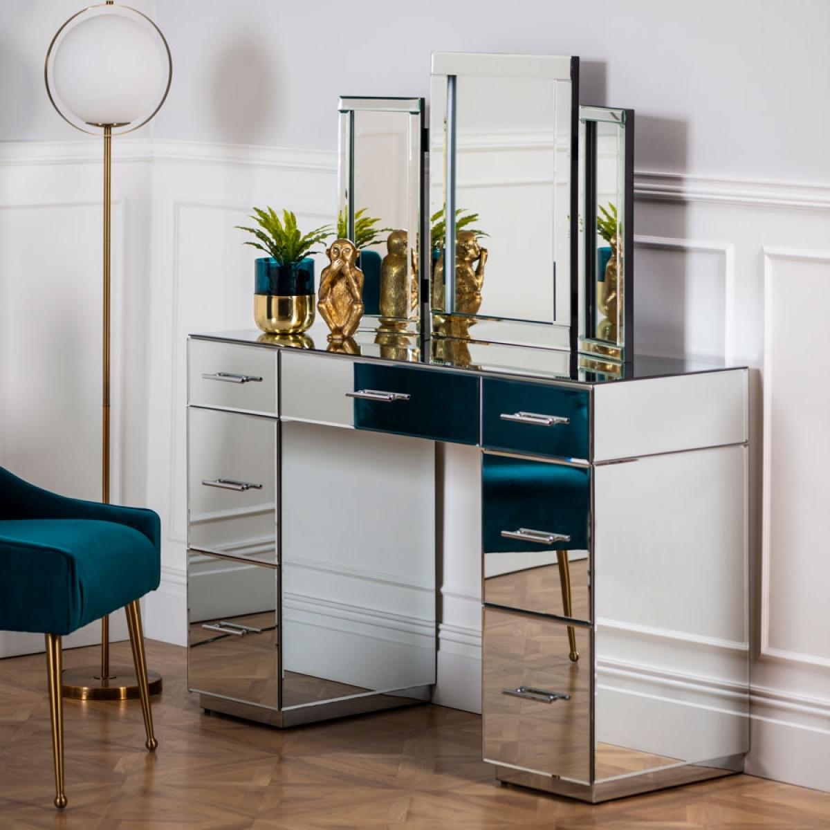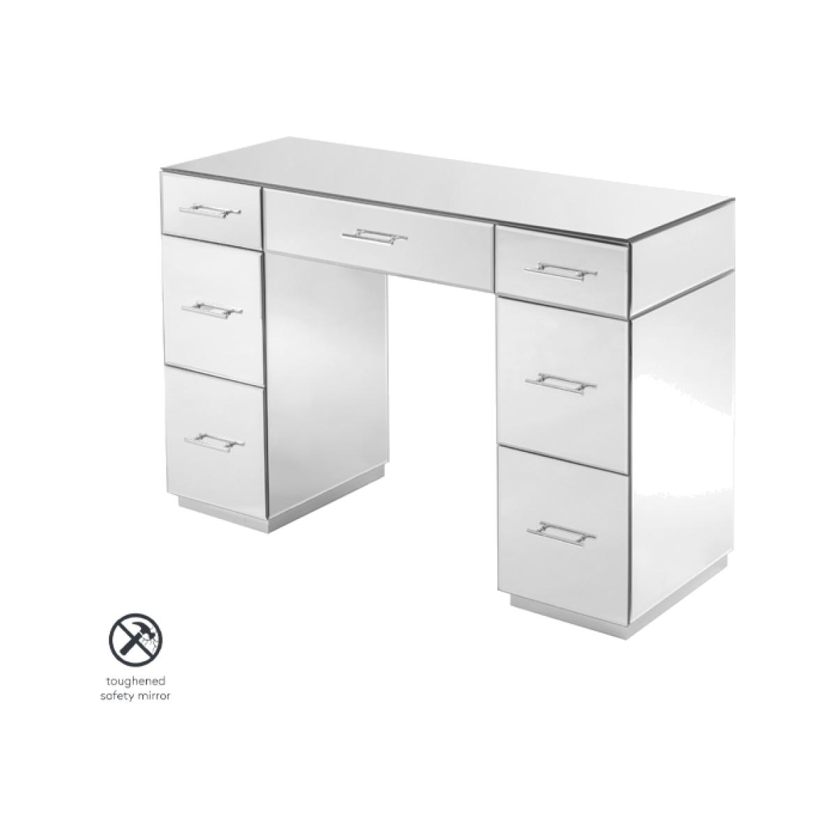 A large, elegant dressing table suitable for any style interior. Seven spacious drawers with high quality drawer runners. Toughened mirrored glass. Polished chrome handles and base. Pale grey painted drawer boxes. Simple assembly Required.
