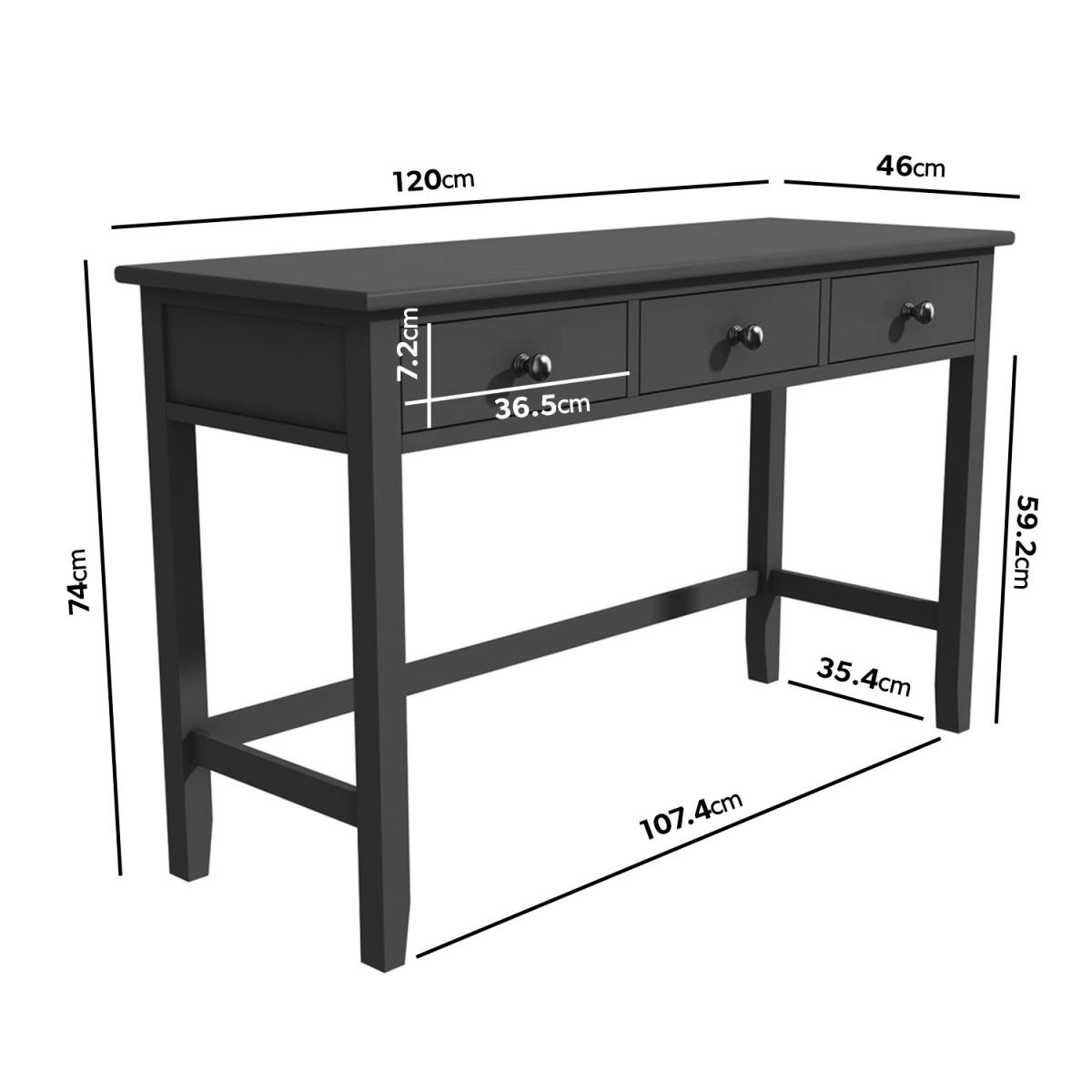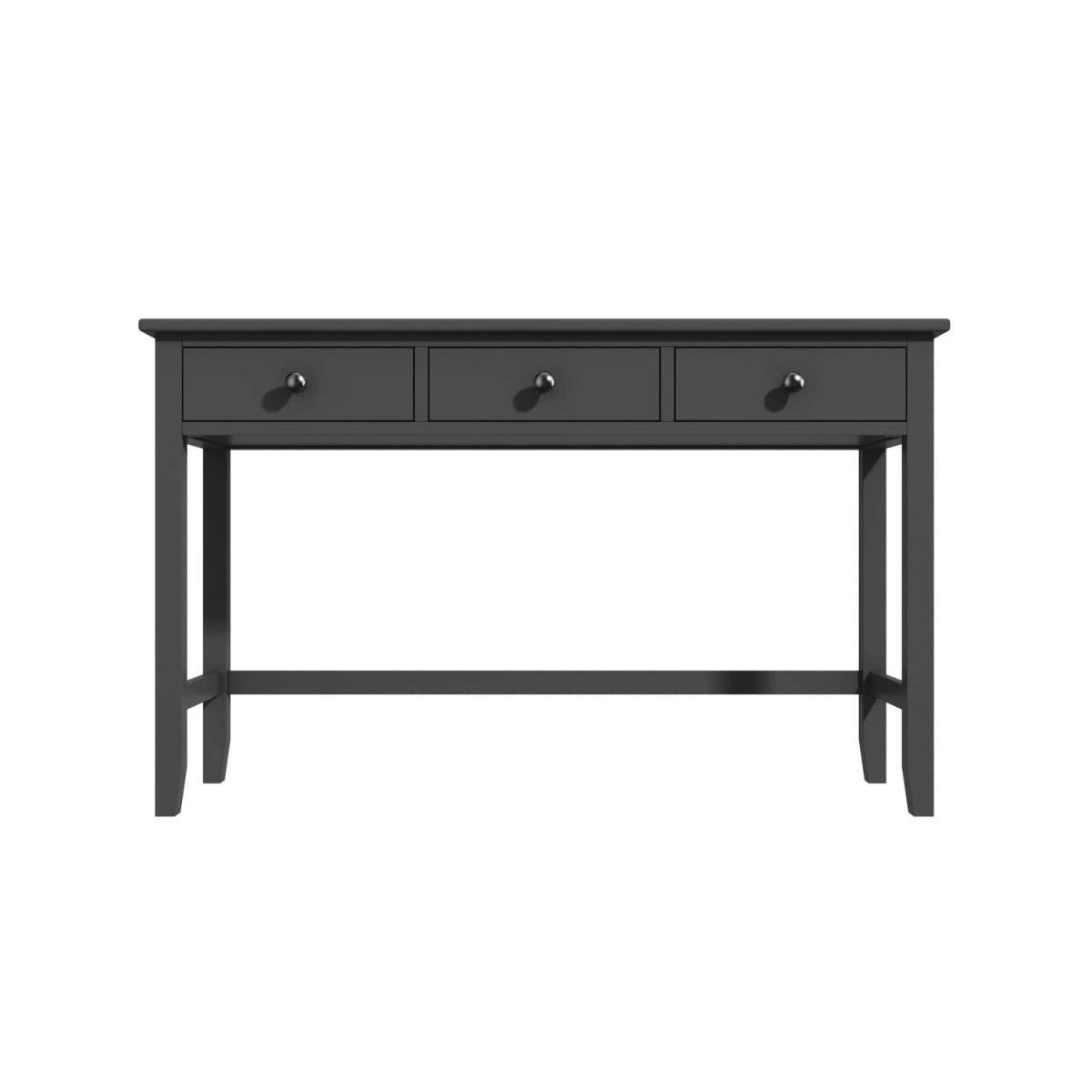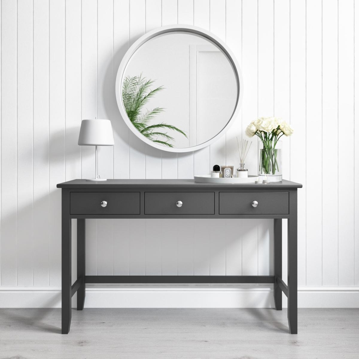 The Harper range has an understated design that will compliment both modern and traditional interior décor schemes. Its characterised by clean edges and simple lines, finished in crisp anthracite grey it brings a trendy look to the bedroom. This practical dressing table is durable and visually appealing with its clean and classic aesthetic. It's been crafted from solid wood with a grey painted and lacquered finish. It houses three drawers, giving plenty of storage space for make-up, cosmetics and essentials. The drawers have durable wooden runners and have been finished beautifully with simple knob handles in shiny chrome.