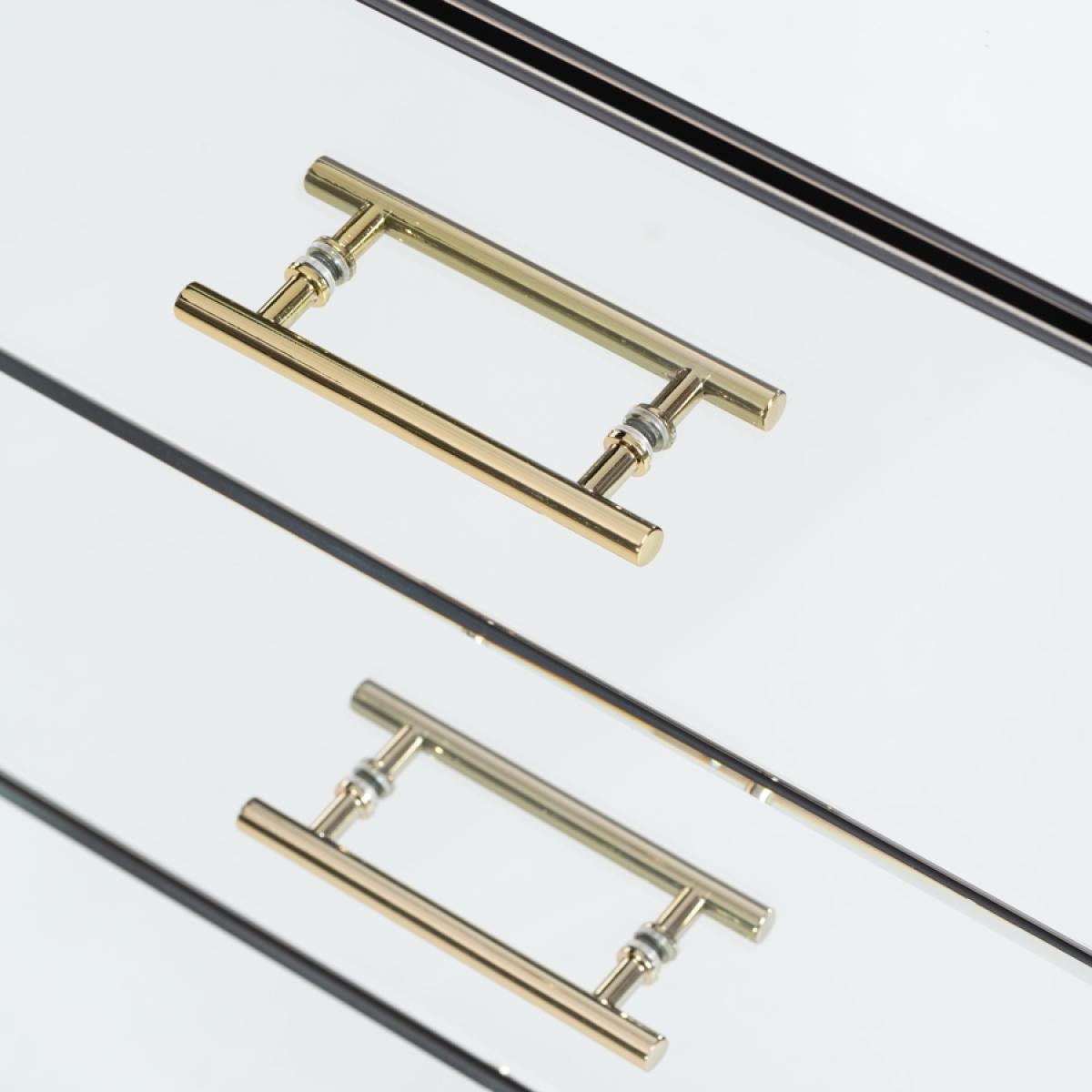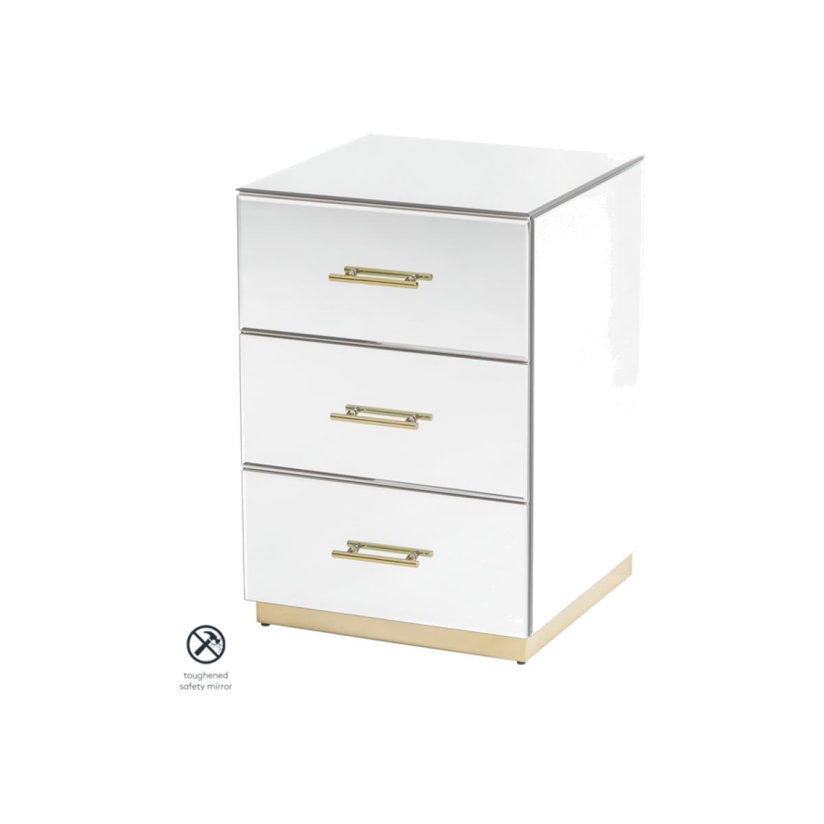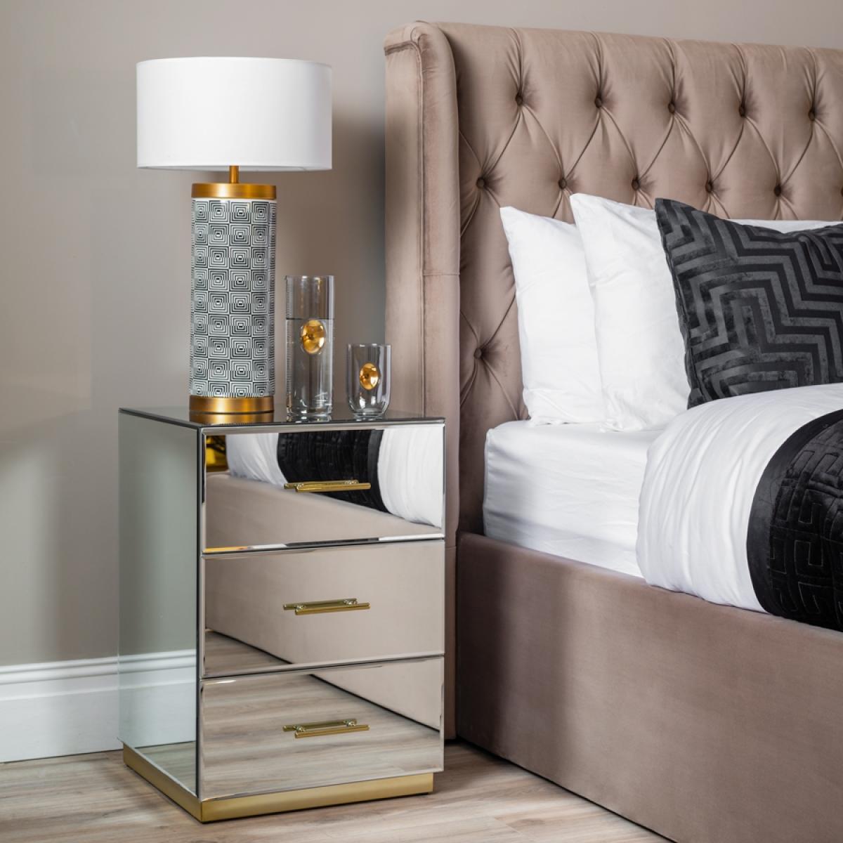 An understated, elegant bedside table suitable for any style interior. Three spacious drawers with high quality drawer runners. Toughened mirrored glass. Polished champagne gold coloured handles and base. Pale grey painted drawer boxes.