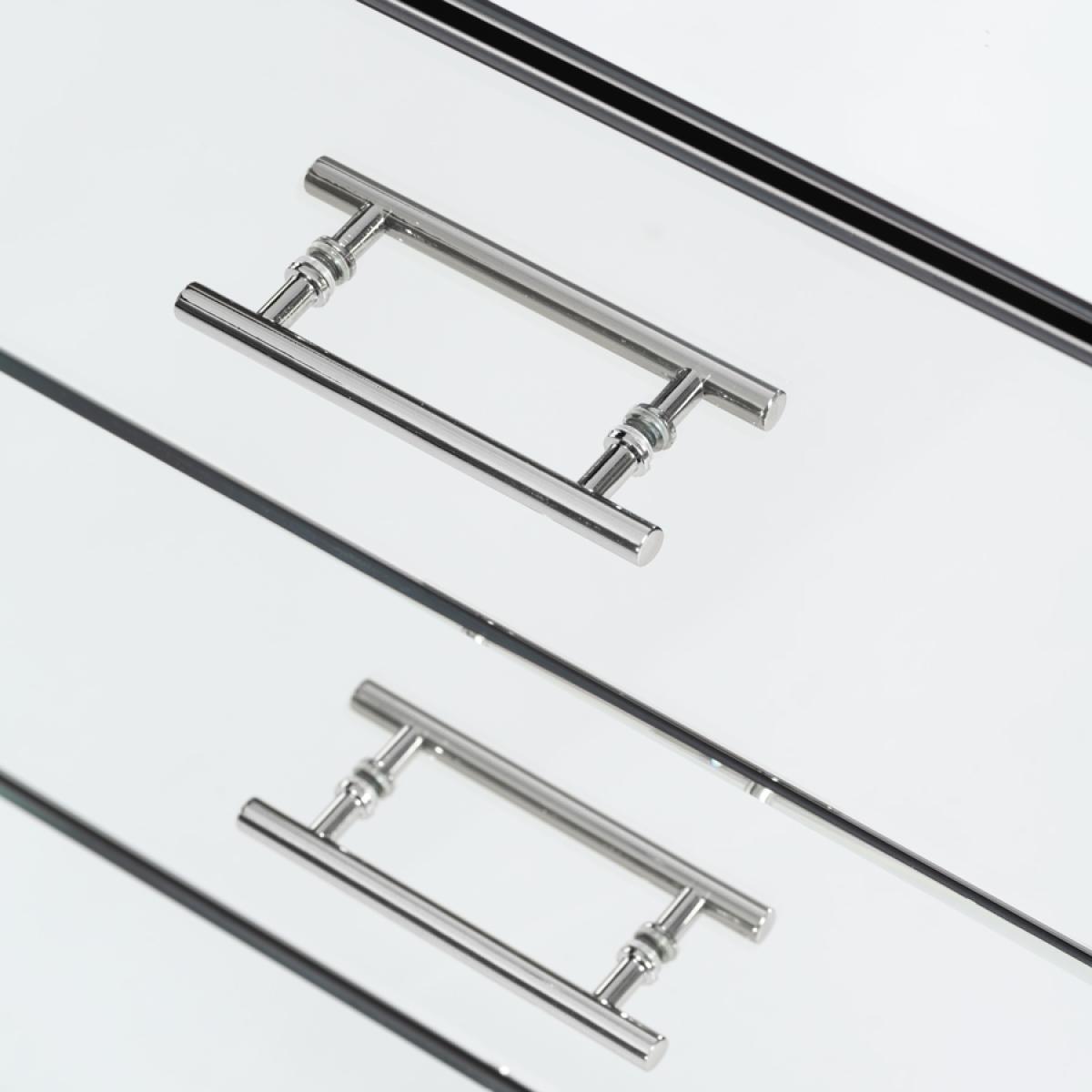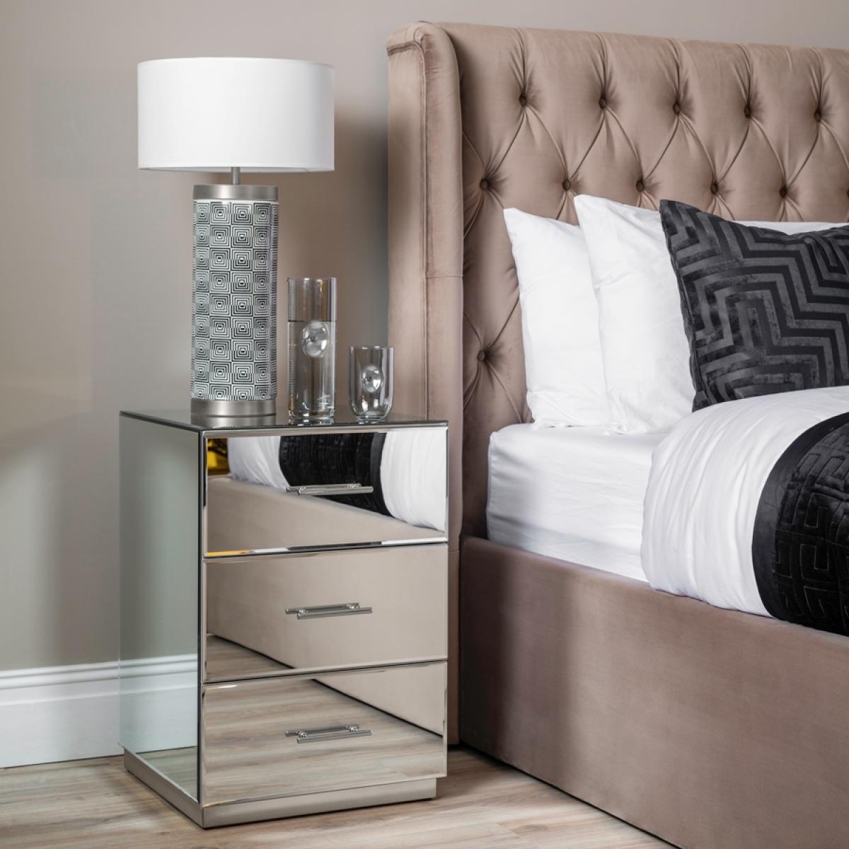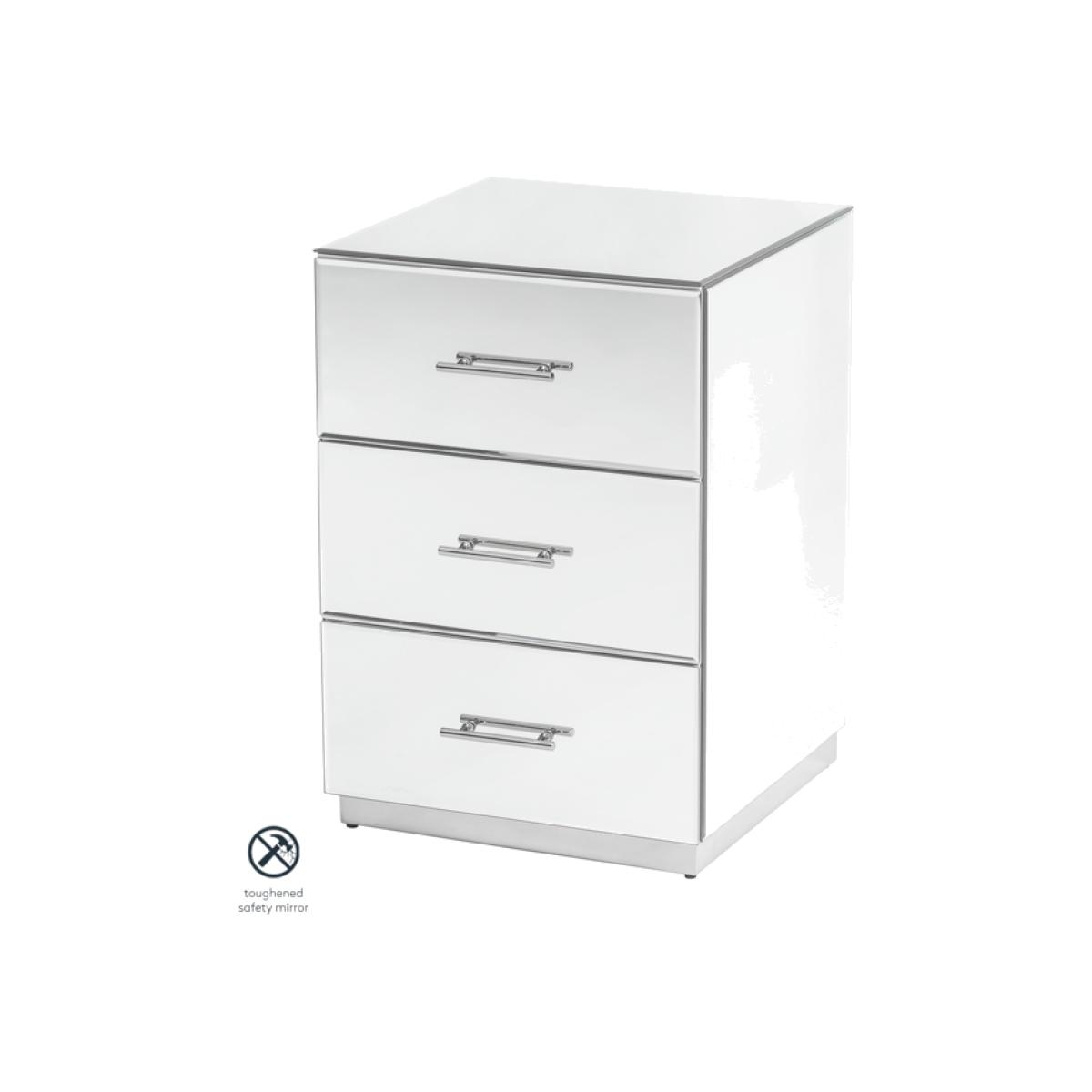 An understated, elegant bedside table suitable for any style interior. Three spacious drawers with high quality drawer runners. Toughened mirrored glass. Polished chrome handles and base. Pale grey painted drawer boxes.
