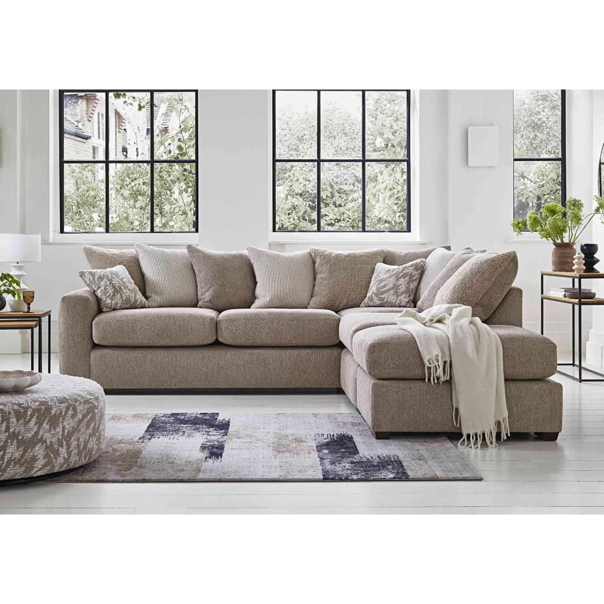 Ready for some serious lounging? Meet our Harper range of sofas, armchairs and sofa beds. The look is clean and modern with wide square-edged arms and deep seats which help fulfil this range's commitment to comfort. Seats and backs are sprung and seat cushioning is high-quality foam with a five-year plumpness guarantee. Back cushions are filled with squishier fibre – or feather if you opt for one of the range’s pillow back sofas. Together they promise that perfect balance of softness and support. Beautifully upholstered in a choice of fabrics including a lovely boucle-effect chenille, these corner sofas, sofas, chairs and footstools are entirely handcrafted in the UK and exclusively available at Furniture Village. It’s easy to picture the family relaxing on this large scatter back corner sofa with separate footstool. There's plenty of room for everybody to lean back in comfort on its nine pillow back cushions. Why you’ll love it Relaxed modern style invites some serious lounging. Wide arms, deep seats and fabulous cushioning for top-to-toe comfort. Includes a large footstool that you can use to make a luxurious chaise end. Sprung seats and back for even weight distribution and all-over support. Foam seat cushioning comes with a 5-year plumpness guarantee. Pillow back is composed of 9 feather-filled scatter cushions. High-quality craftsmanship with a sturdy wooden frame. Upholstery fabrics include soft, boucle-effect chenille. Wood feet in a choice of finishes. Handmade in the UK. A Furniture Village exclusive. This corner sofa with footstool is part of our Harper range. What you need to know Medium comfort level. Seat suspension: spring. Seat cushioning: Duo Flex foam. Cushions are reversible. Back suspension: spring. Back cushioning: feather-filled scatter cushions. Cushions are reversible. Available as both a left-hand facing and a right-hand facing corner sofa. Clean regularly using a soft brush or vacuum with the curtain attachment. Deal with any spills promptly. Professional cleaning advised for oil- and grease-based stains. Please read our upholstery care guide for more advice.