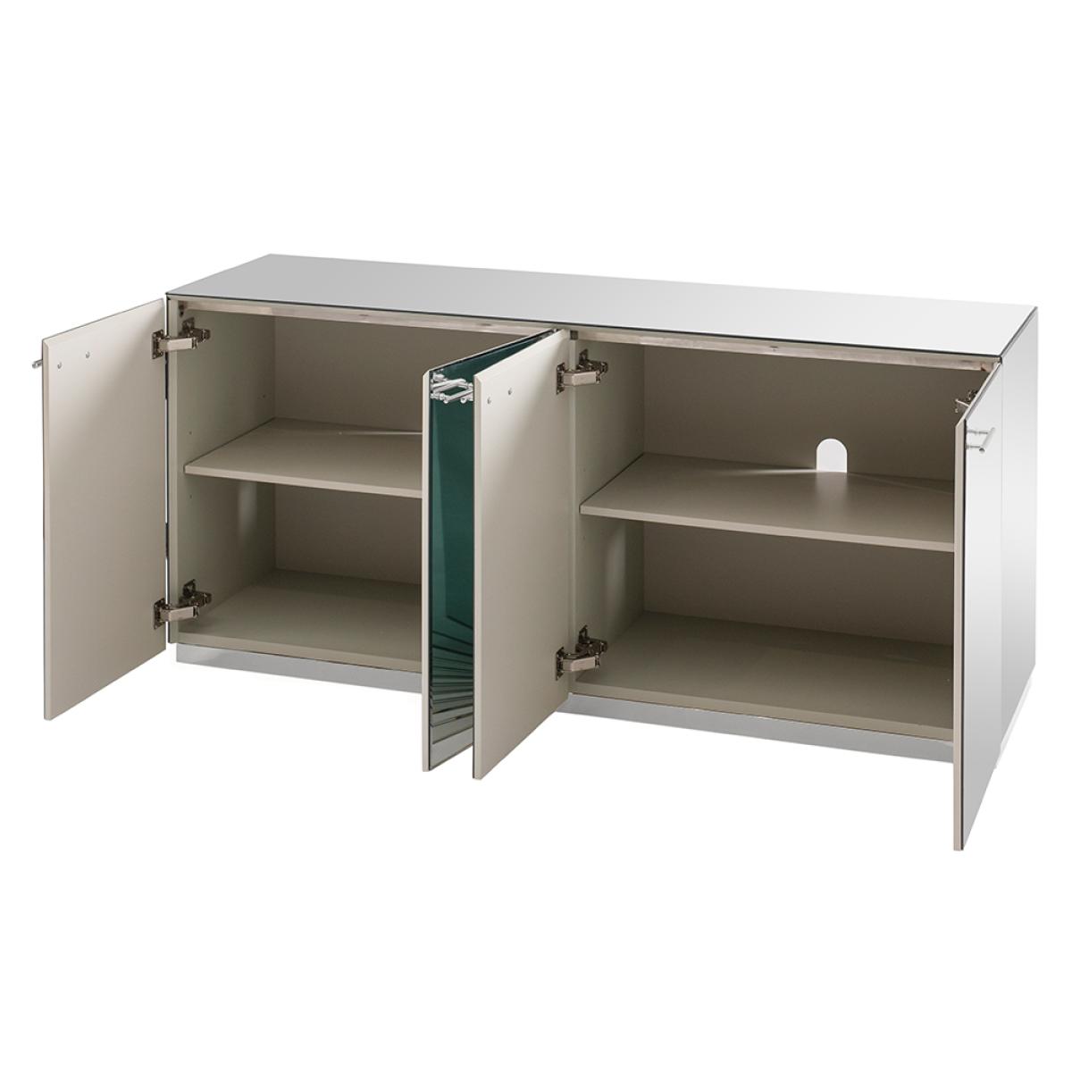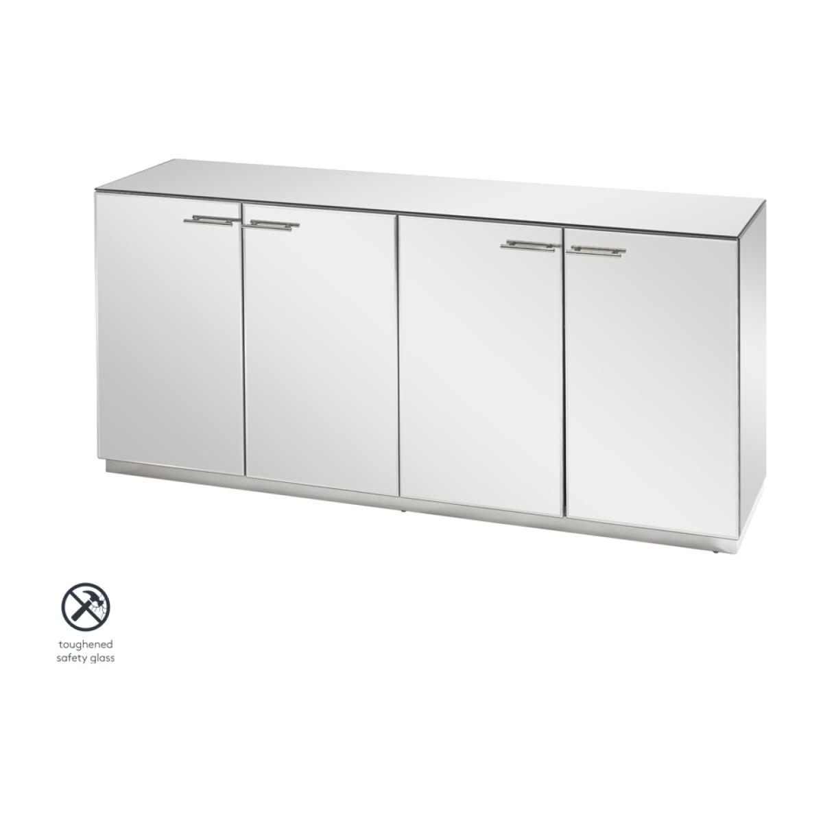 A timeless elegant sideboard suitable for any style interior. 2 cupboard sections with doors and cable ports to the rear for housing media equipment. Toughened mirrored glass. Polished chrome handles and base. Pale grey painted interior. Simple assembly required.