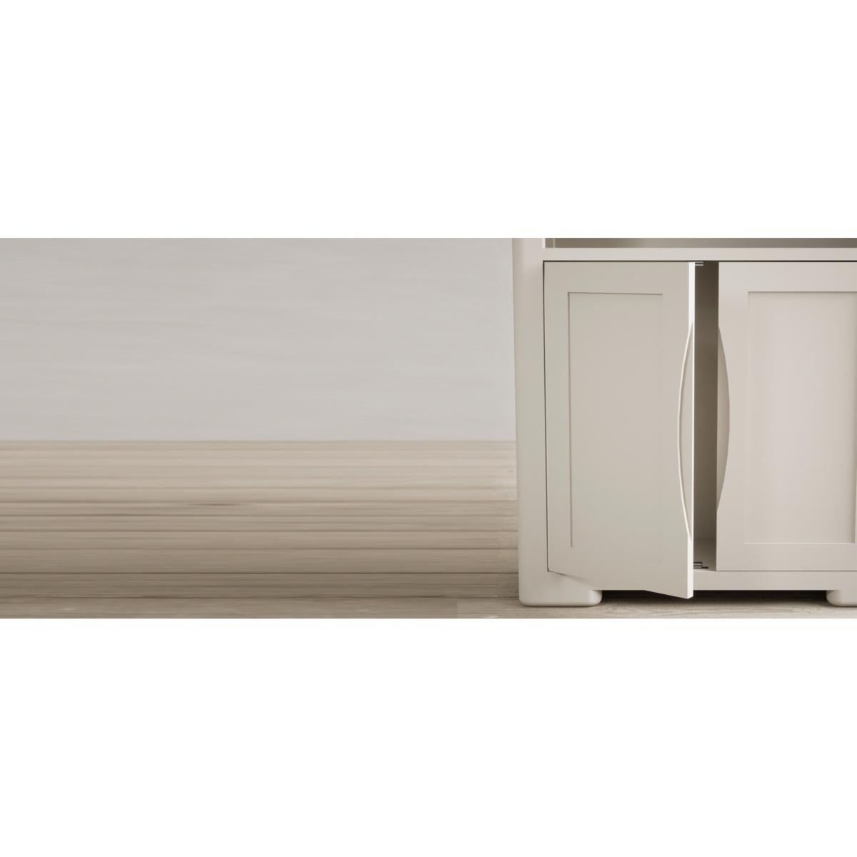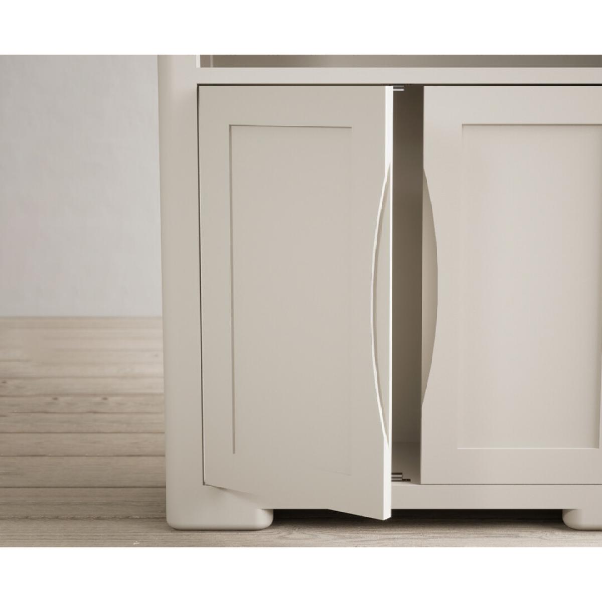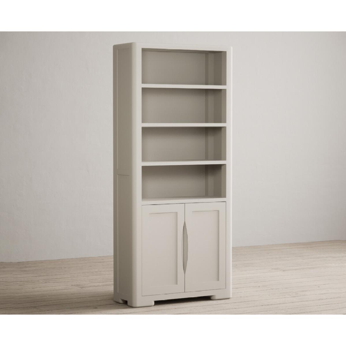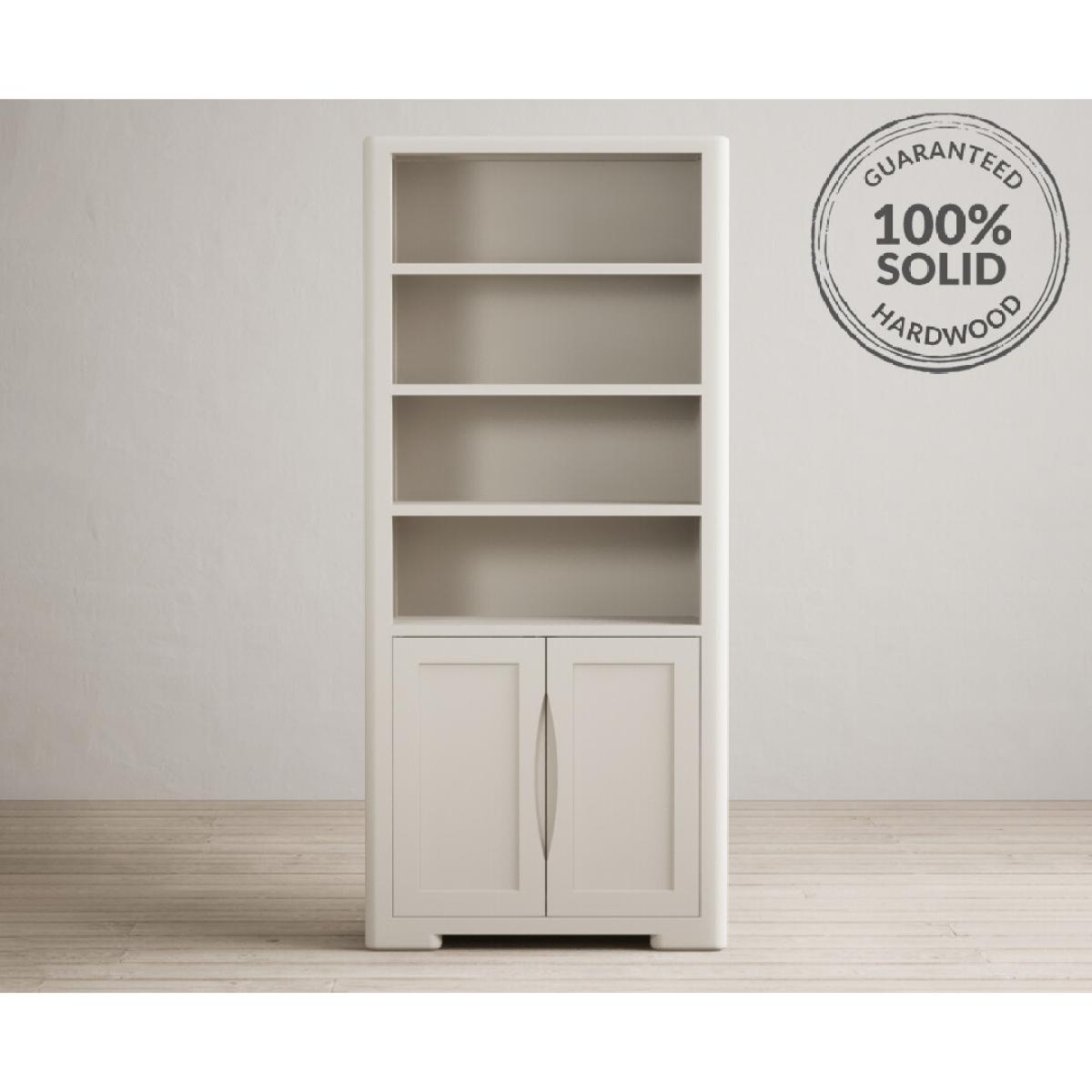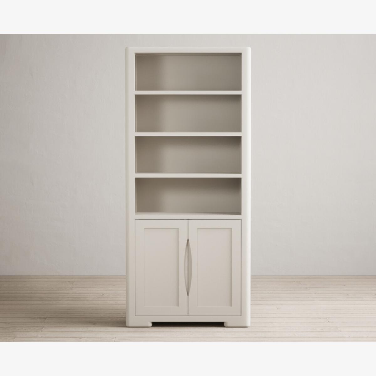 The Harper Soft White Tall Bookcase features curved edges and sturdy shelves and is complete with a lower cupboard with recessed handles on the doors.