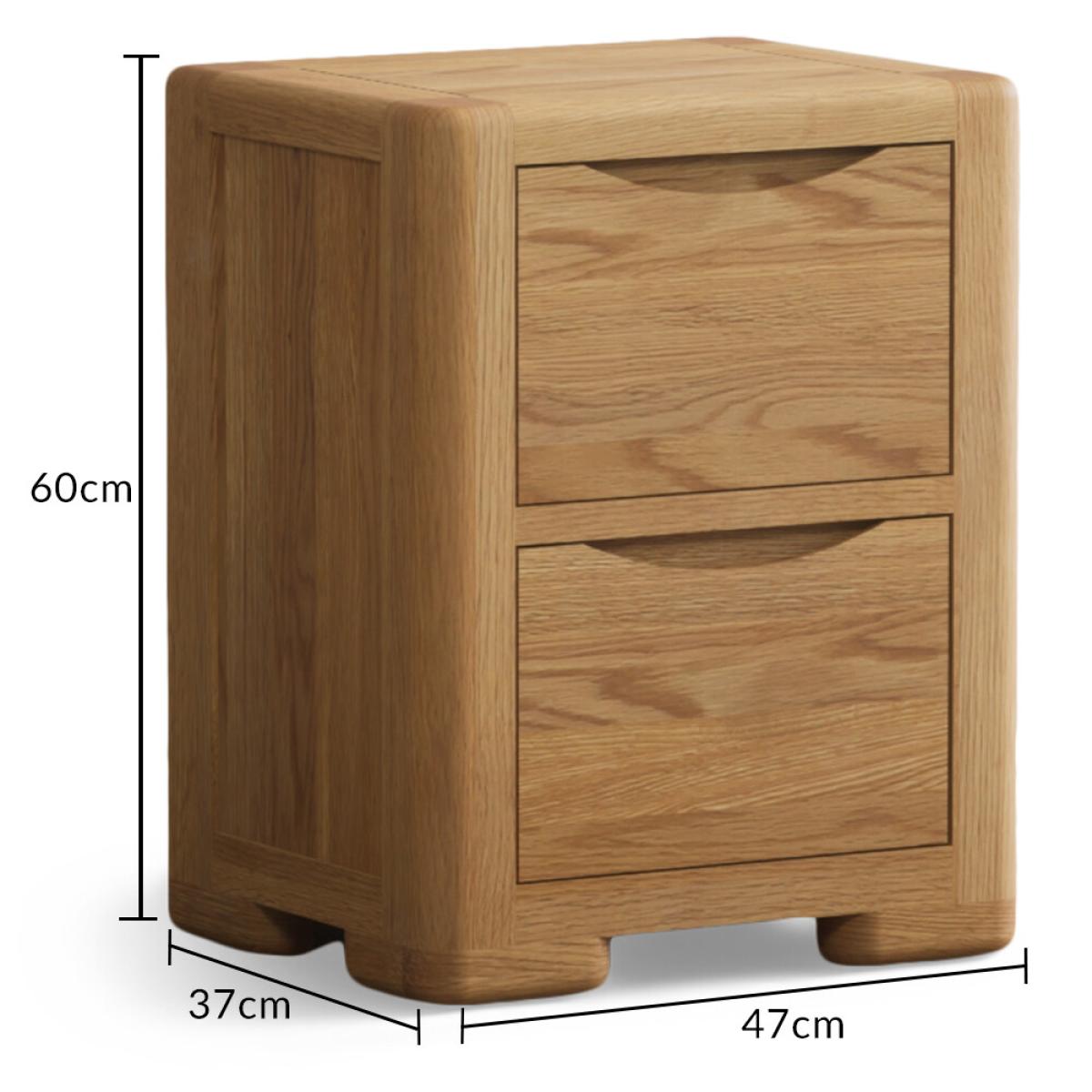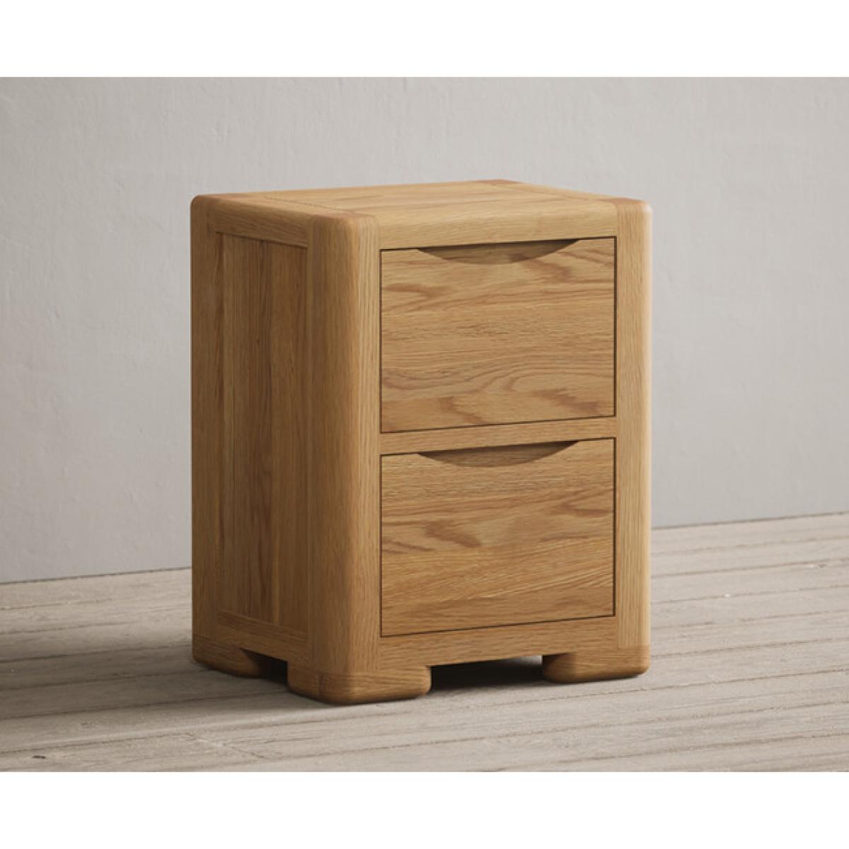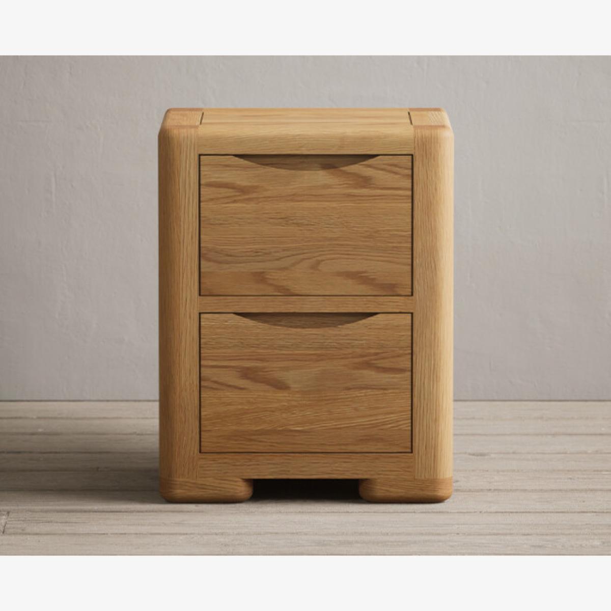 The Harper Solid Oak 2 Drawer Bedside Chest is stylish and durable, with modern curved edges and a natural finish and 2 drawers finished with inbuilt recessed handles.
