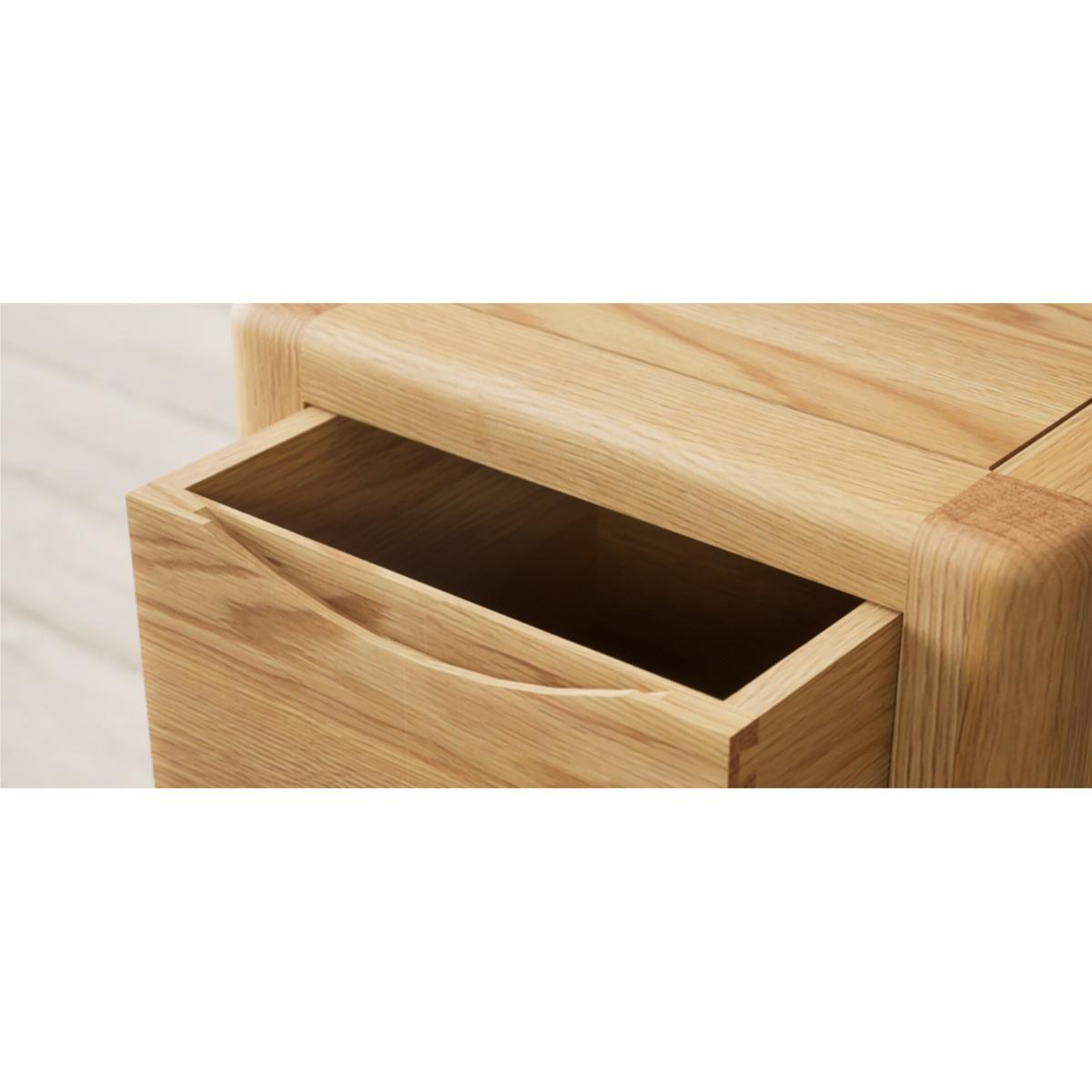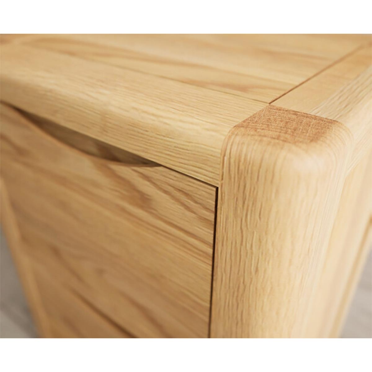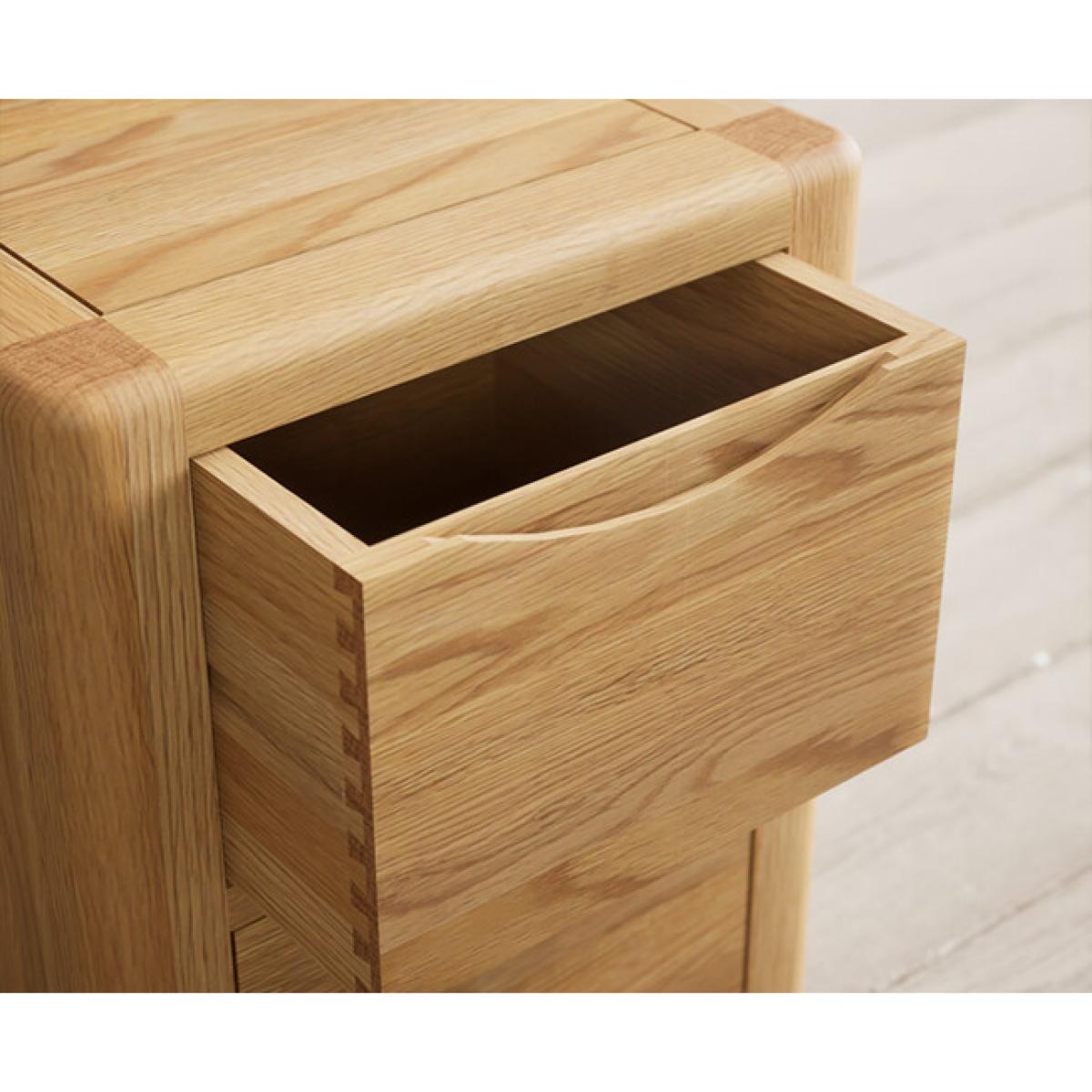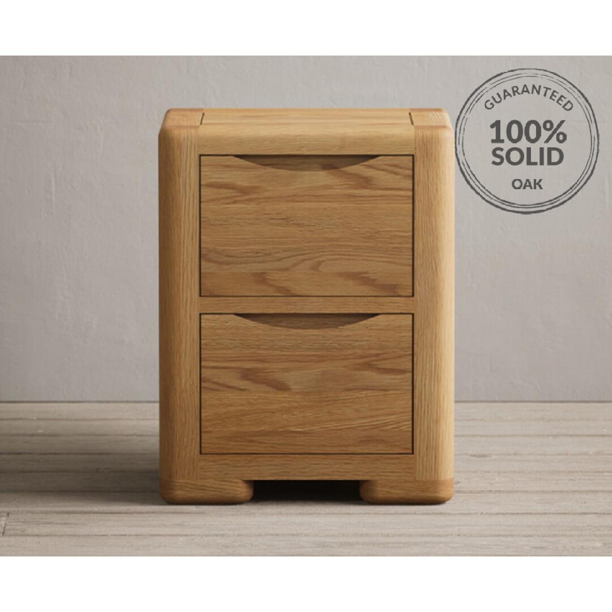 The Harper Solid Oak 2 Drawer Bedside Chest is stylish and durable, with modern curved edges and a natural finish and 2 drawers finished with inbuilt recessed handles.