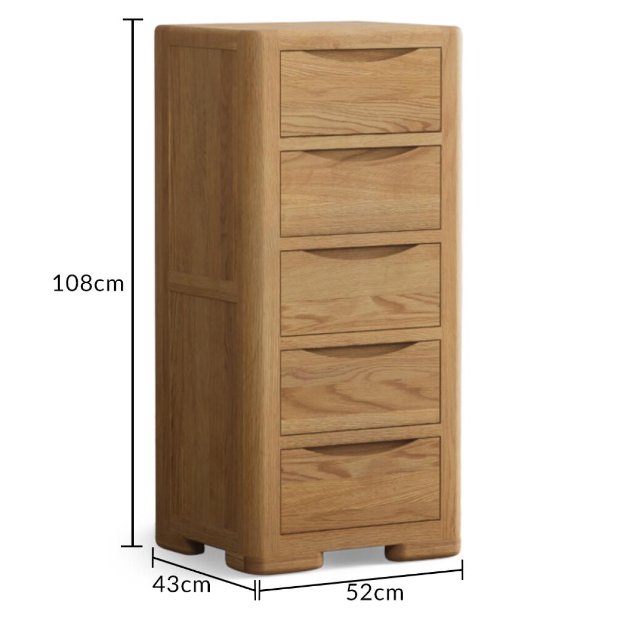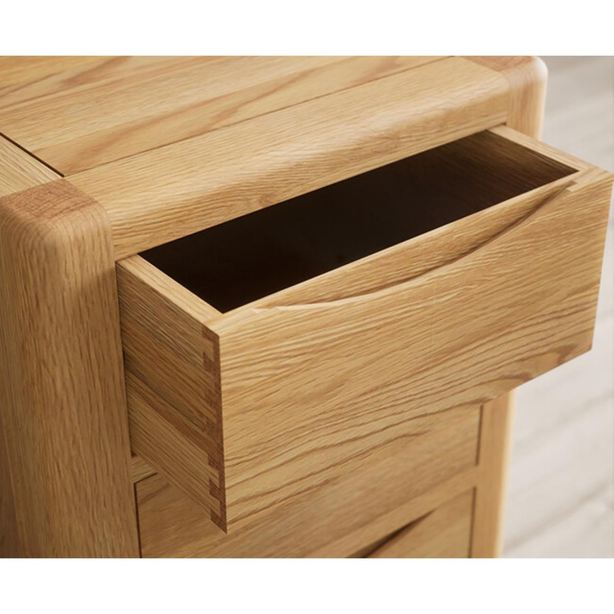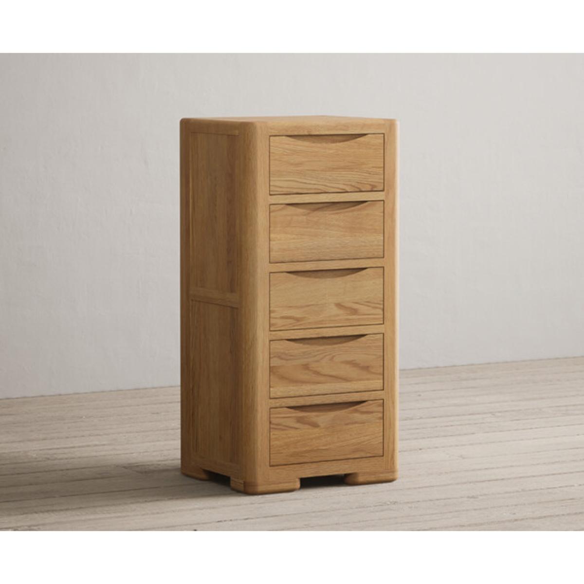 The Harper Solid Oak 5 Drawer Tallboy is rustic and modern, with rounded edges and five spacious Dovetail drawers complete with recessed handles.