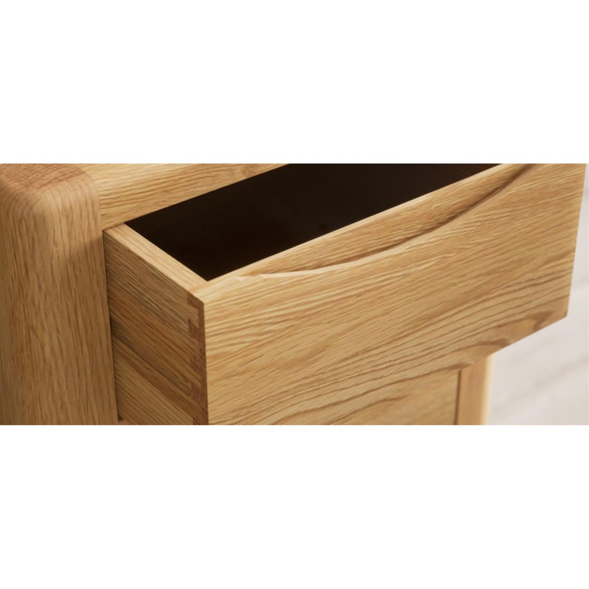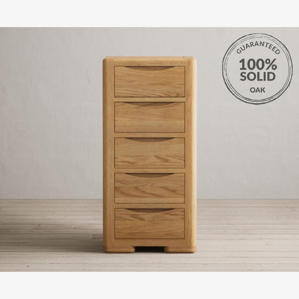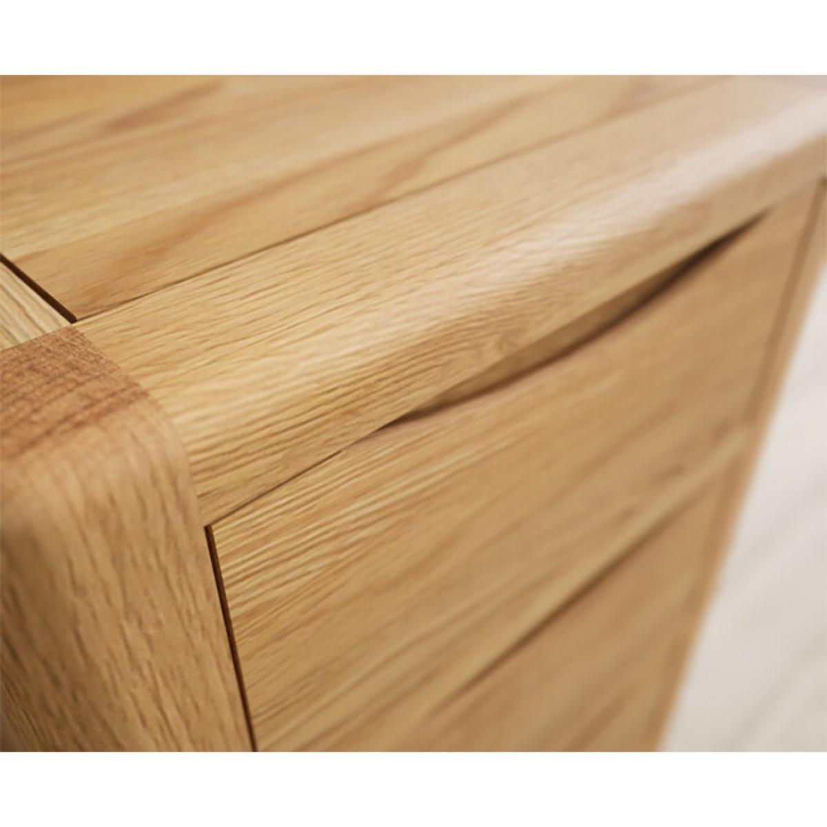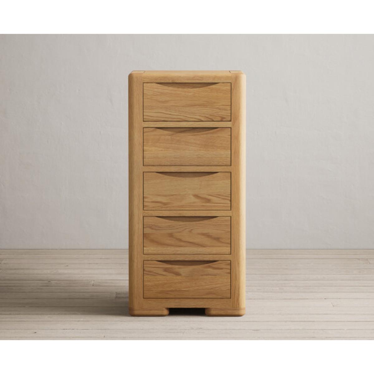 The Harper Solid Oak 5 Drawer Tallboy is rustic and modern, with rounded edges and five spacious Dovetail drawers complete with recessed handles.