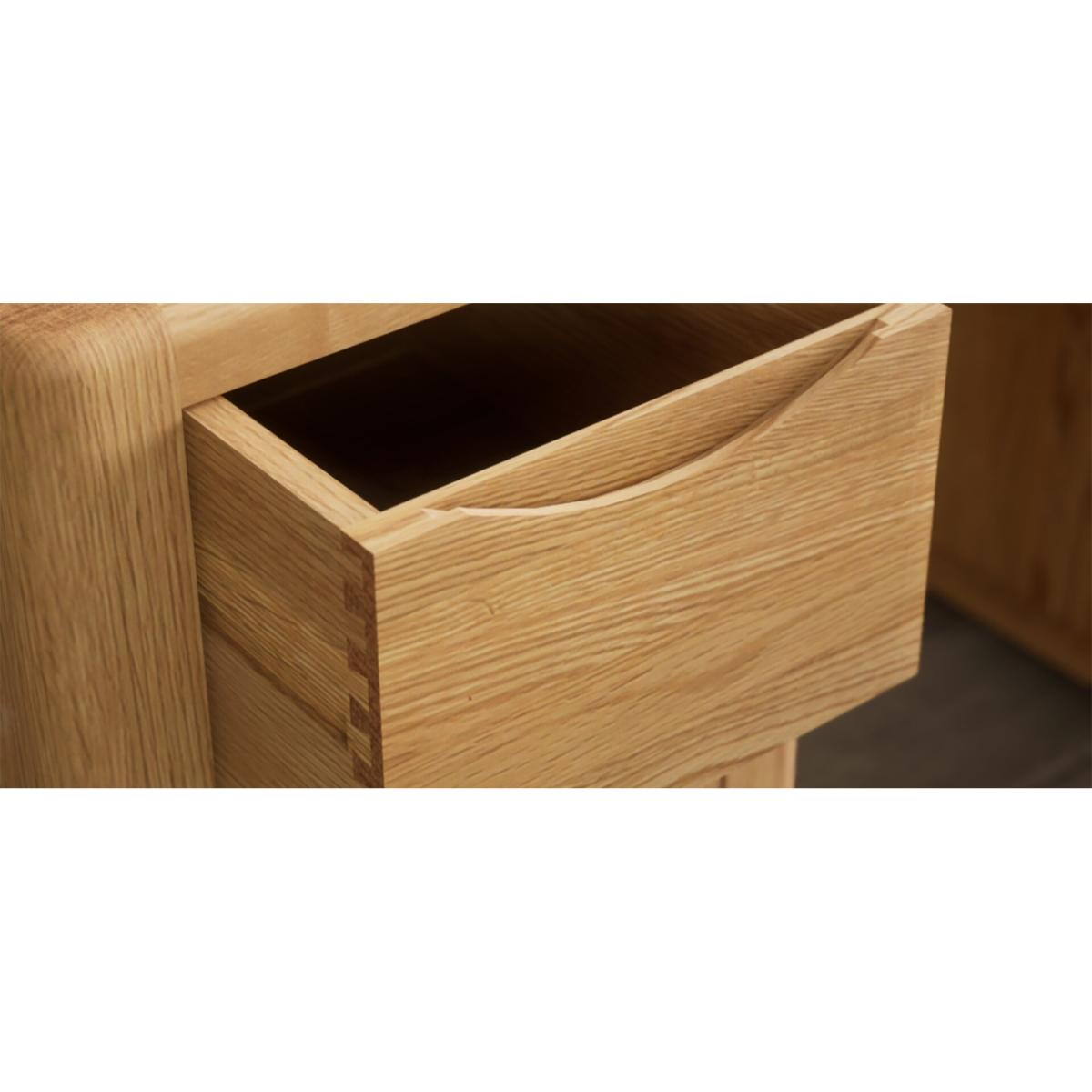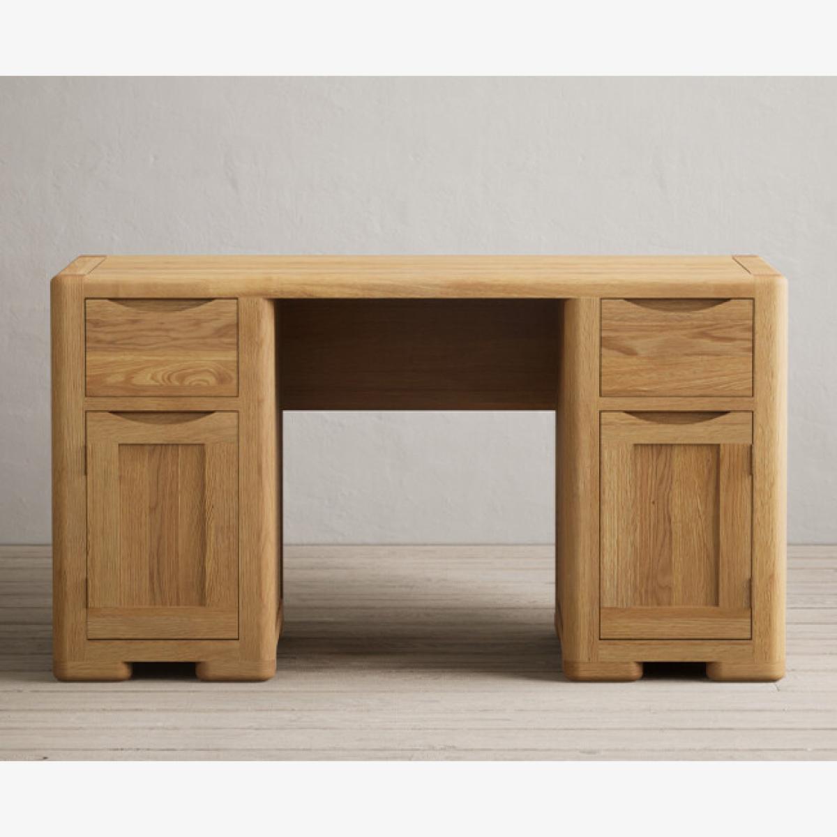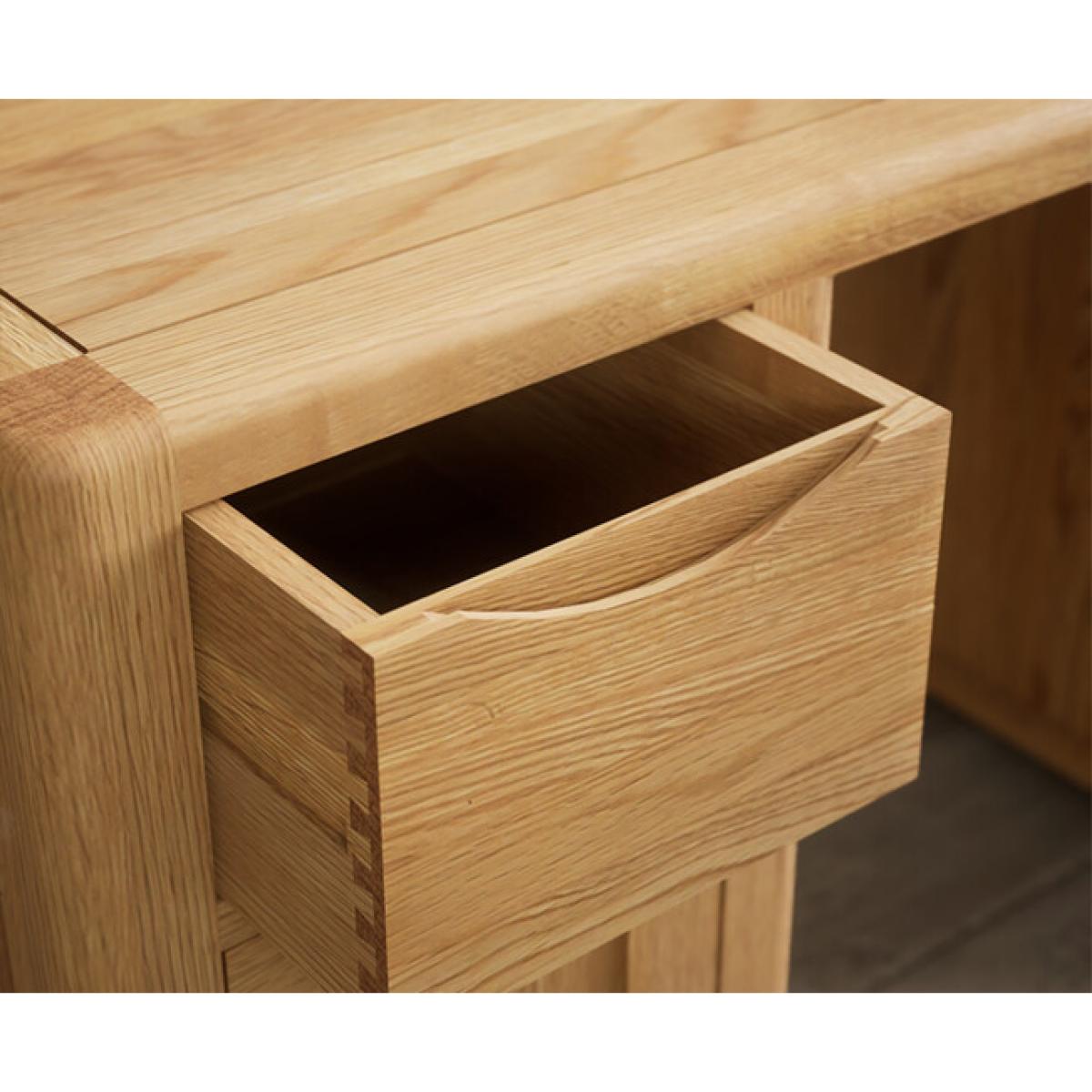 The Harper Solid Oak Computer Desk features stylish curved edges and offers handy storage with two cupboards and two Dovetail drawers.