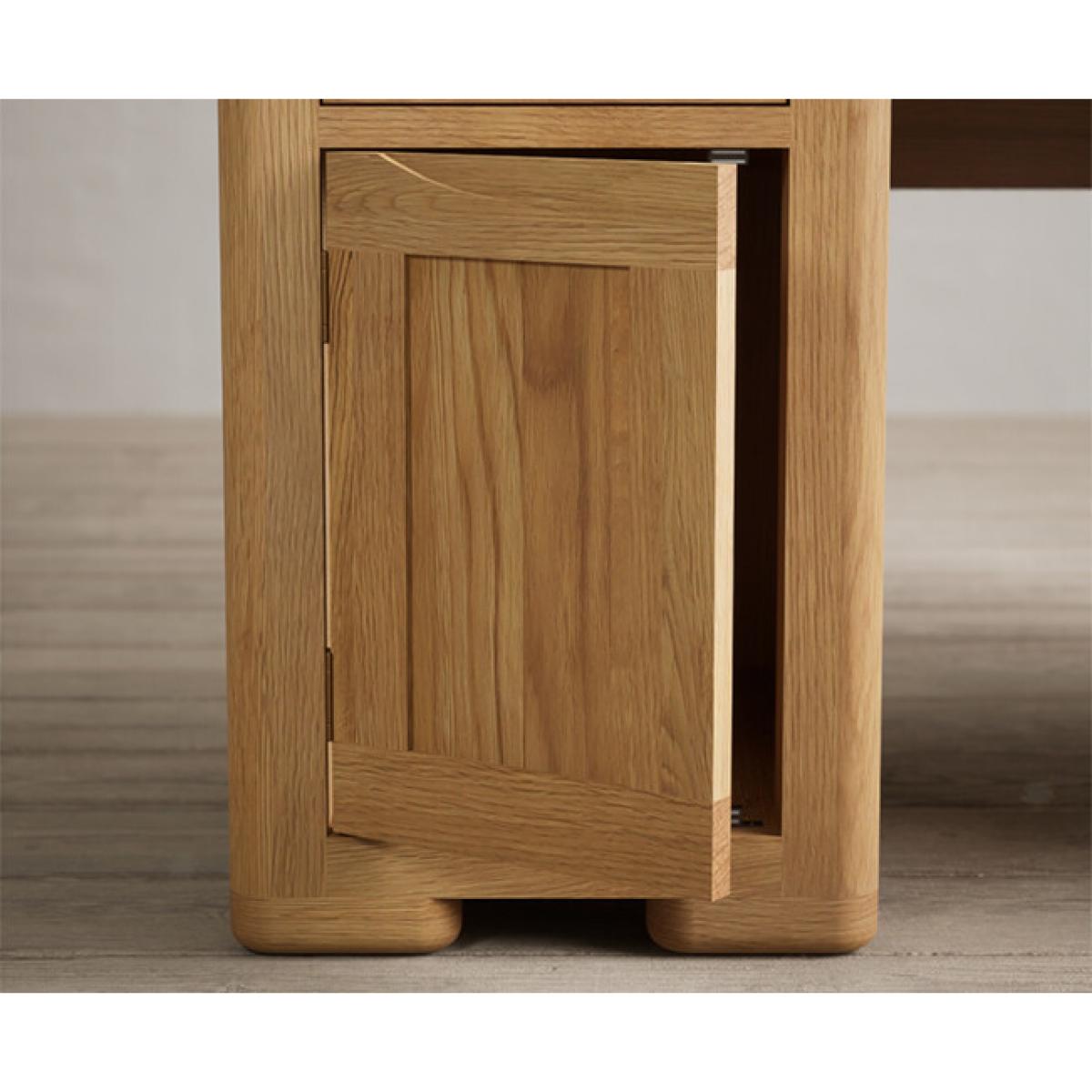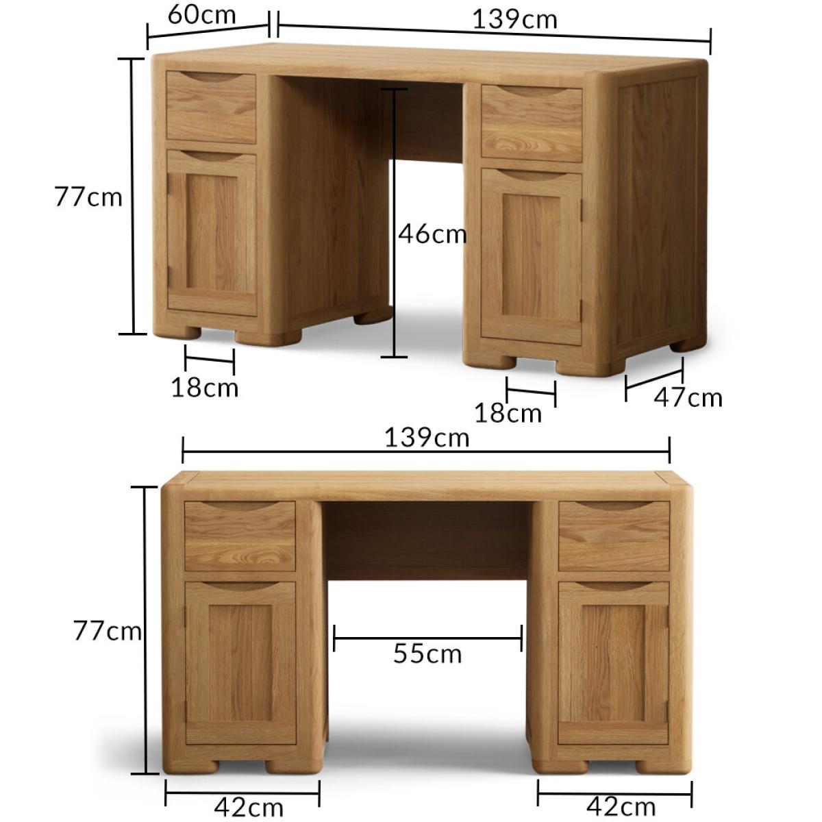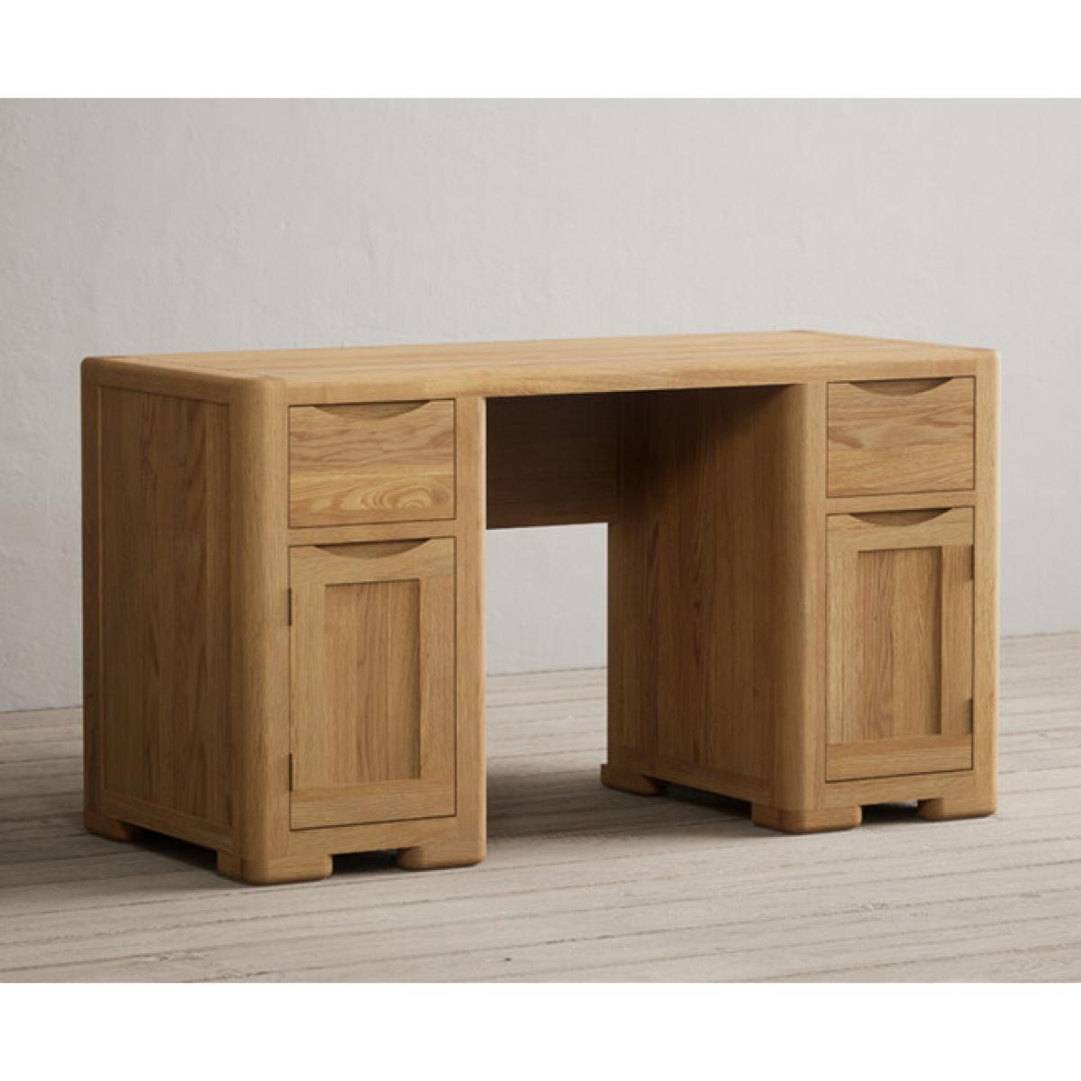 The Harper Solid Oak Computer Desk features stylish curved edges and offers handy storage with two cupboards and two Dovetail drawers.