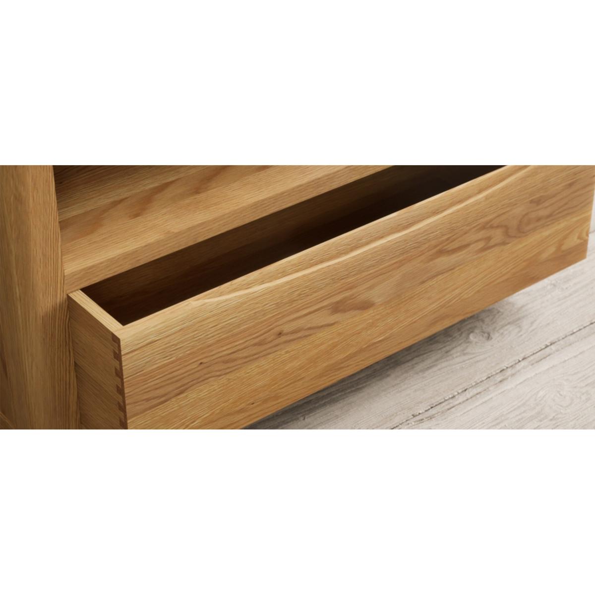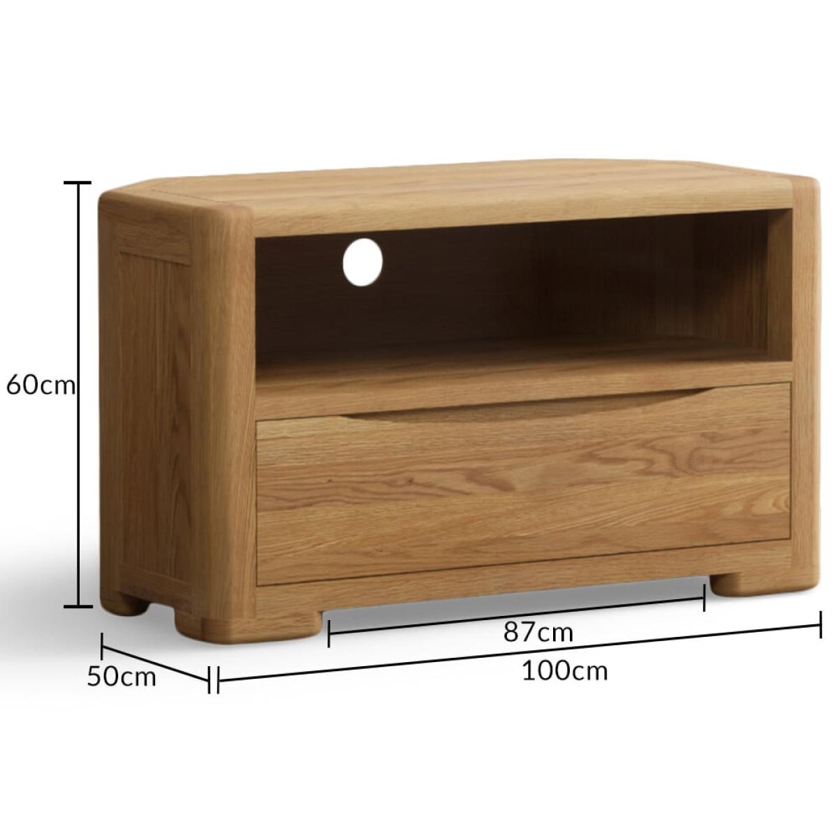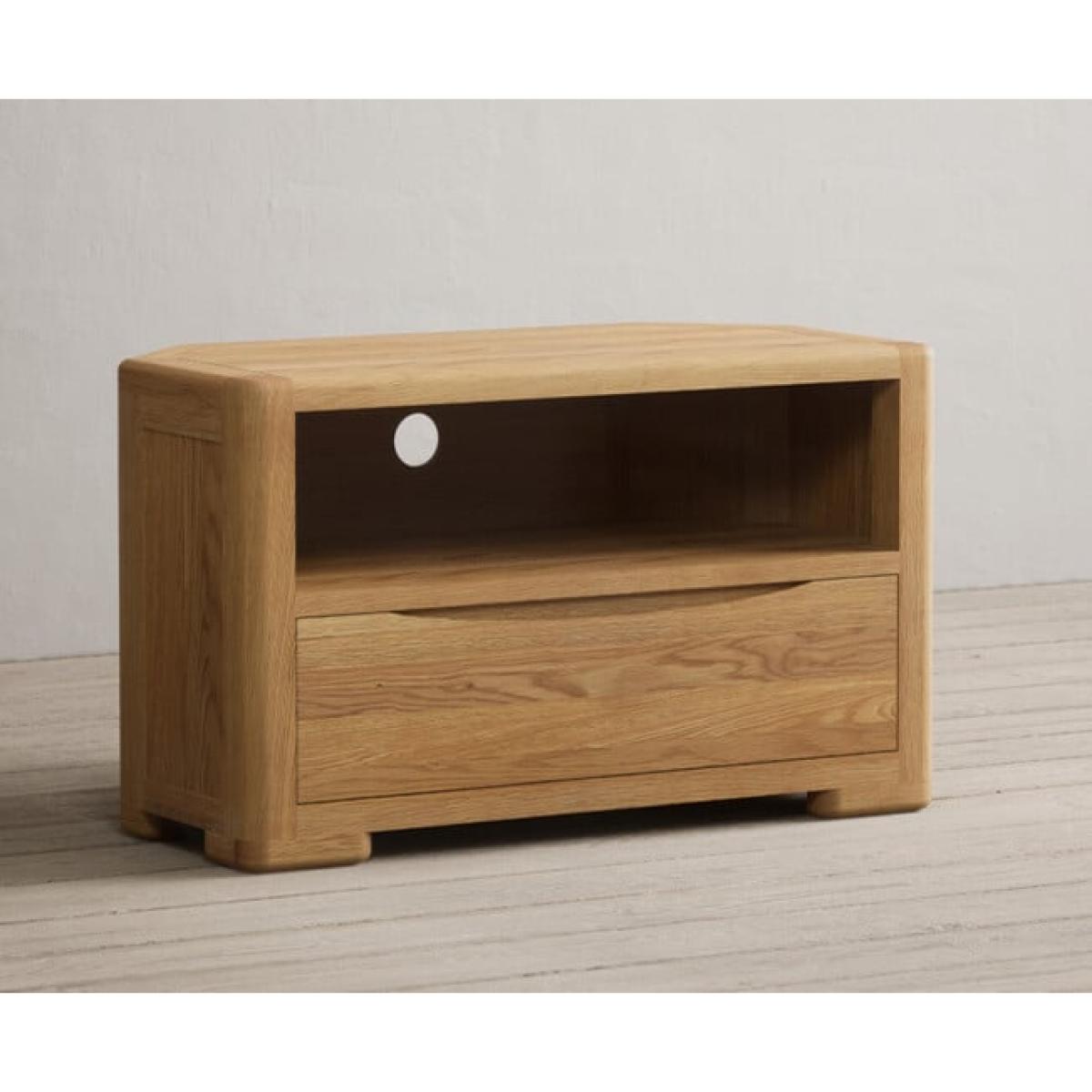 The Harper Solid Oak Corner TV Cabinet features a natural finish and smooth edges for a modern look, complete with a Dovetail drawer with a recessed handle and cable management hole.