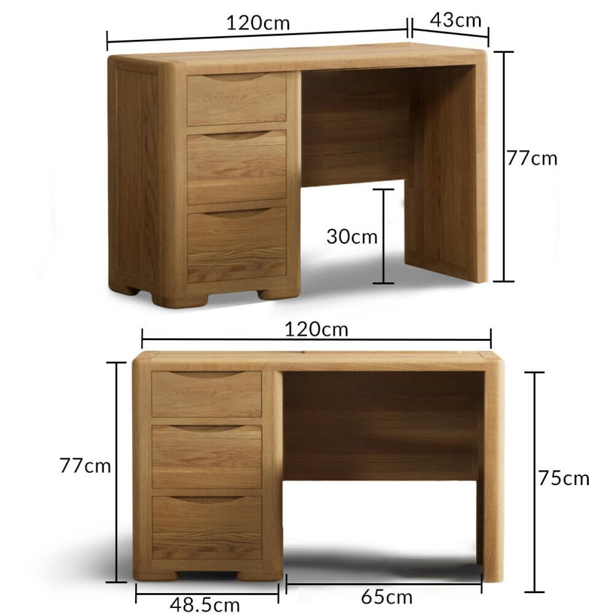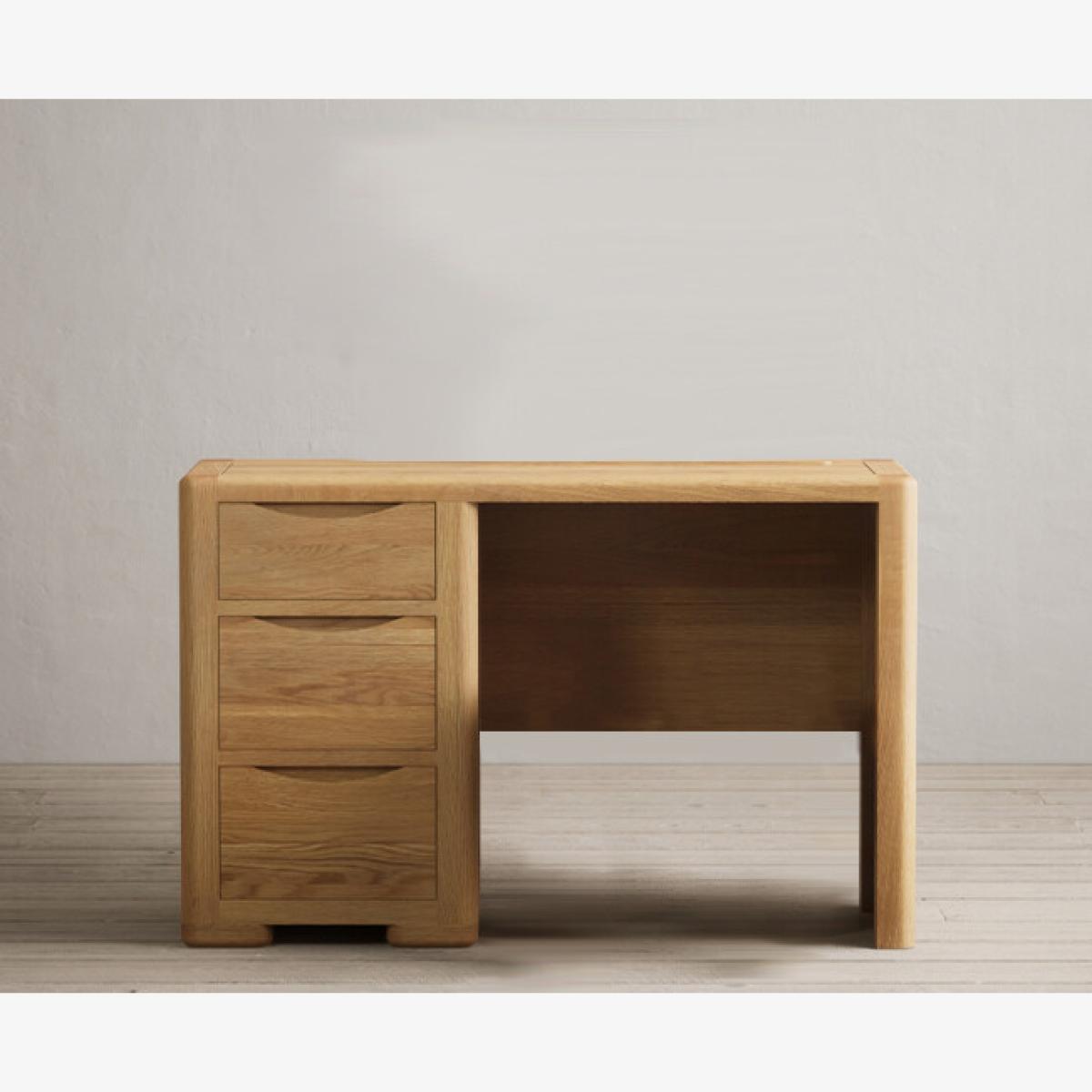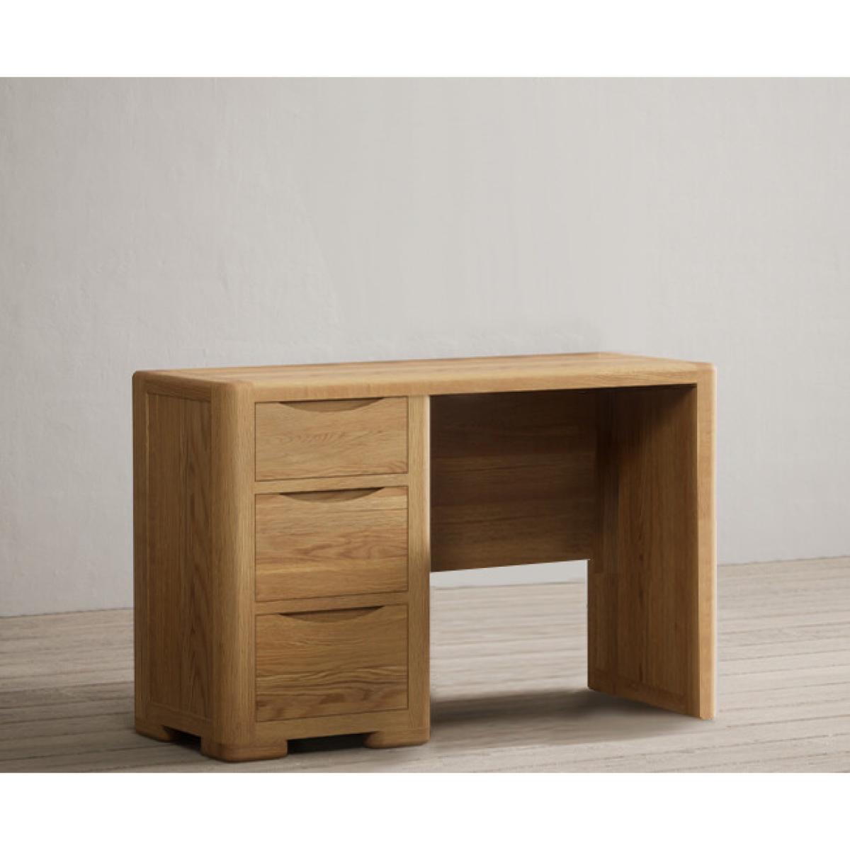 The Harper Solid Oak Dressing Table features a minimalist modern design, crafted from durable oak and featuring rounded edges and three drawers with recessed handles for handy storage.