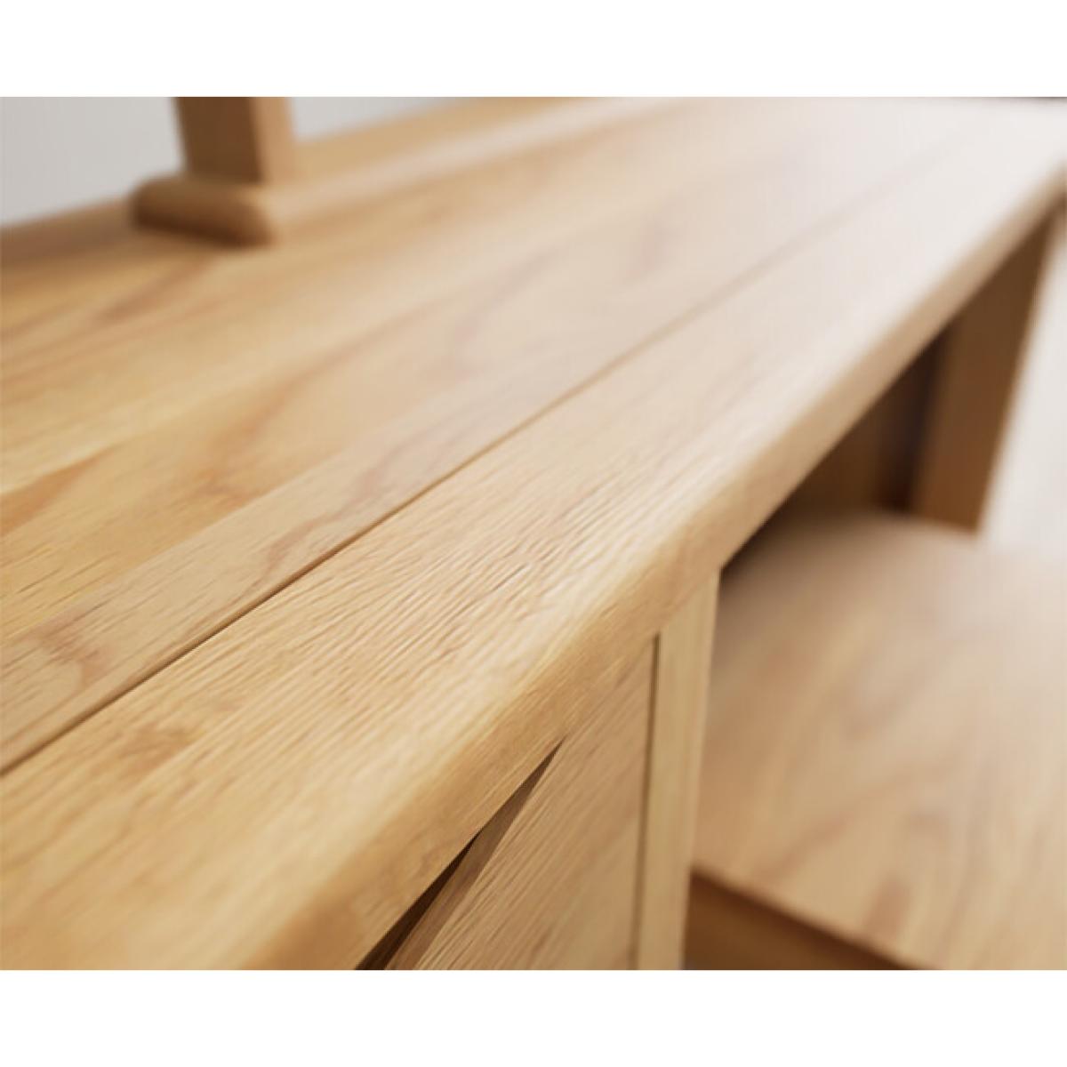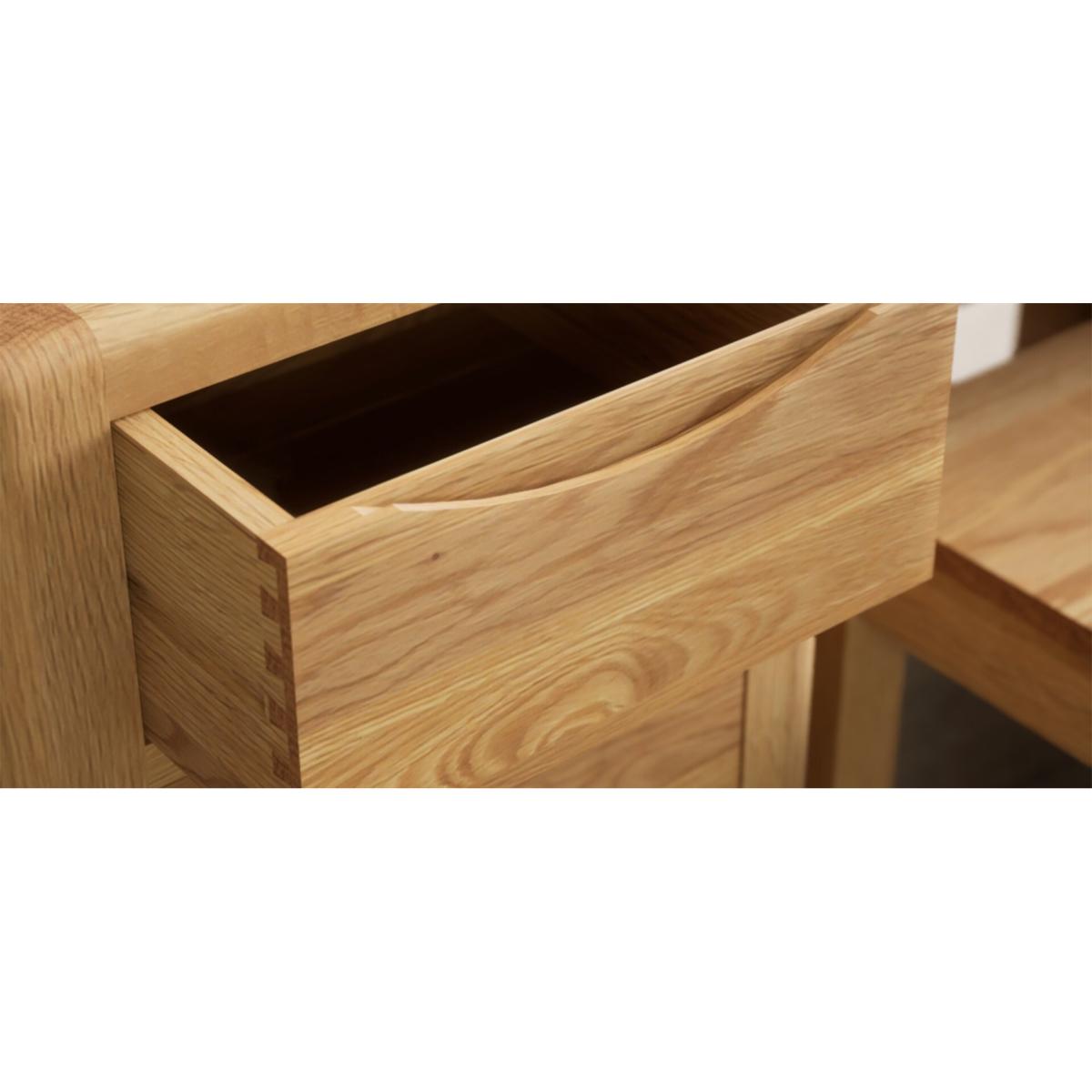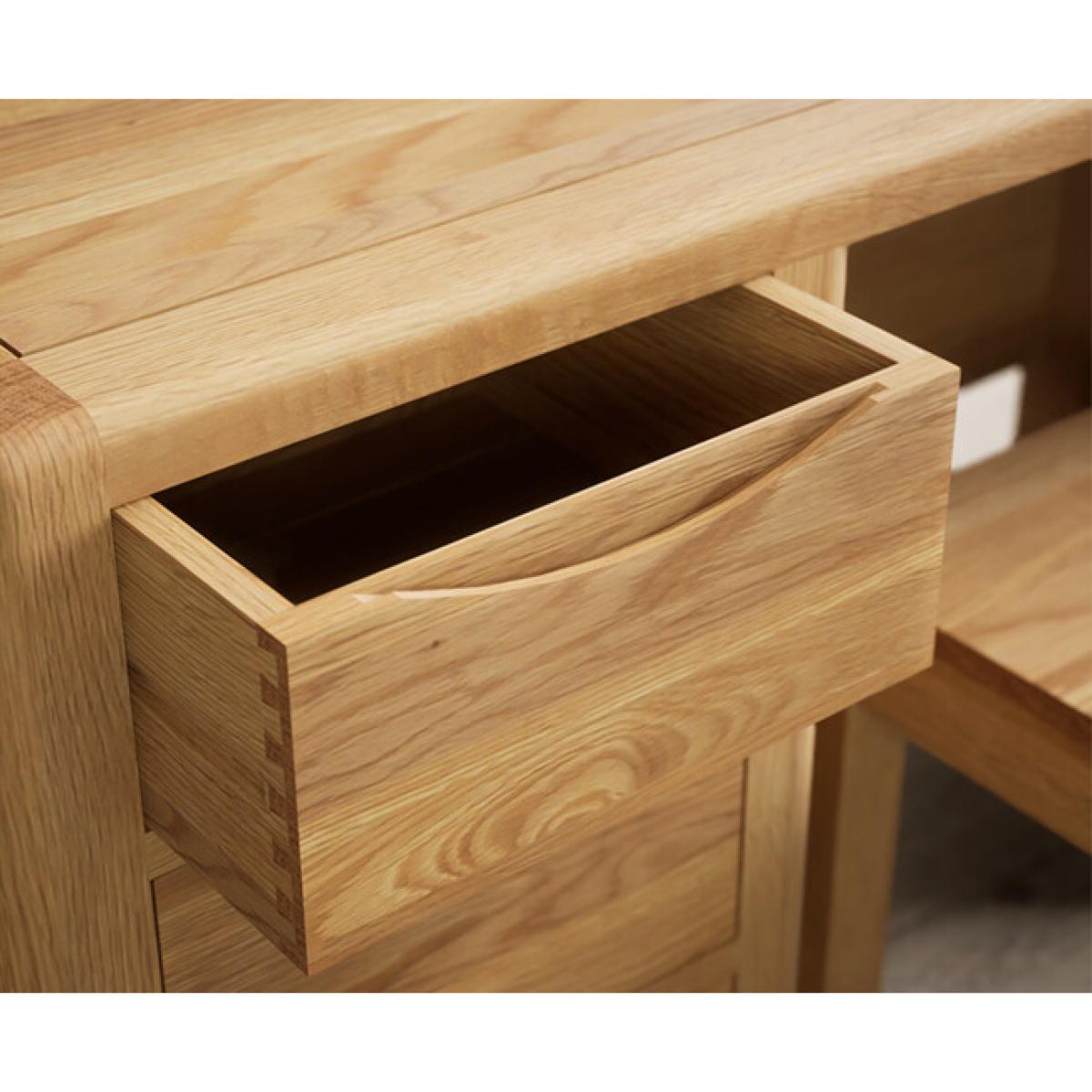 The Harper Solid Oak Dressing Table features a minimalist modern design, crafted from durable oak and featuring rounded edges and three drawers with recessed handles for handy storage.