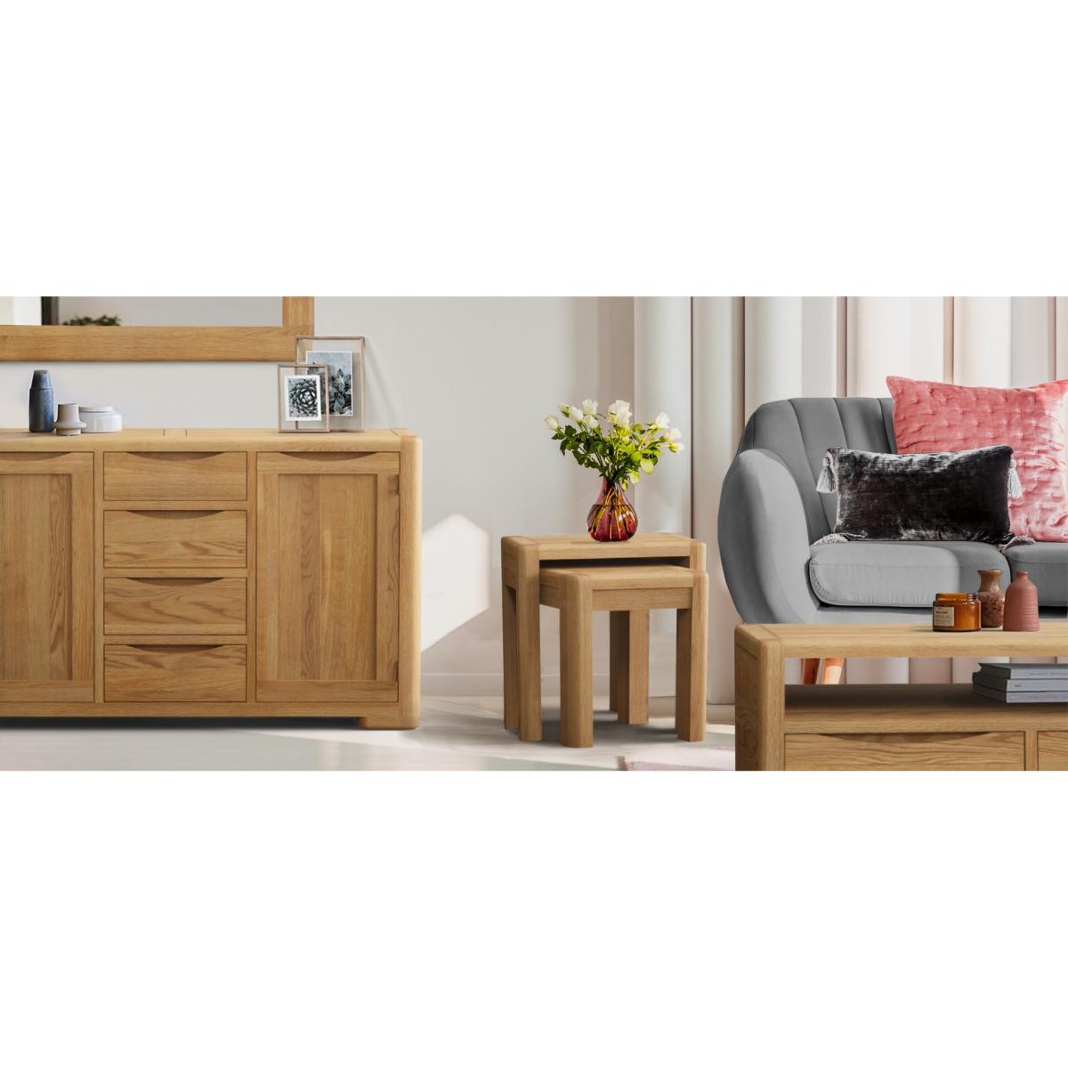 This solid oak sideboard strikes a great balance between functionality and timeless appeal. I love its versatility - it works equally well in both rustic and contemporary interiors, providing warmth and natural texture. Its generous storage makes it ideal for organising everything from dinnerware to office supplies, while the glass-fronted upper section allows for showcasing decorative items or glassware. For styling, consider pairing it with neutral ceramics and minimal accessories for a clean look, or add a pop of colour with decorative bowls or vases. Its natural oak finish brings a cosy, inviting vibe, and the solid wood construction ensures durability for everyday use. Overall, this piece is a reliable and stylish addition to any room that needs practical storage with a touch of understated elegance.