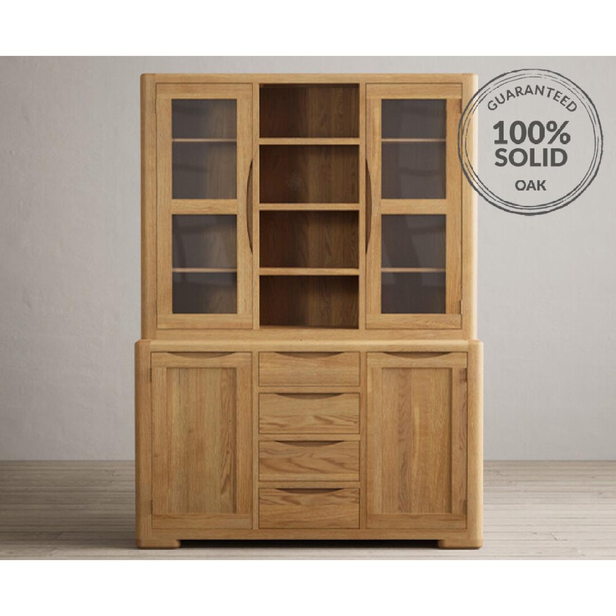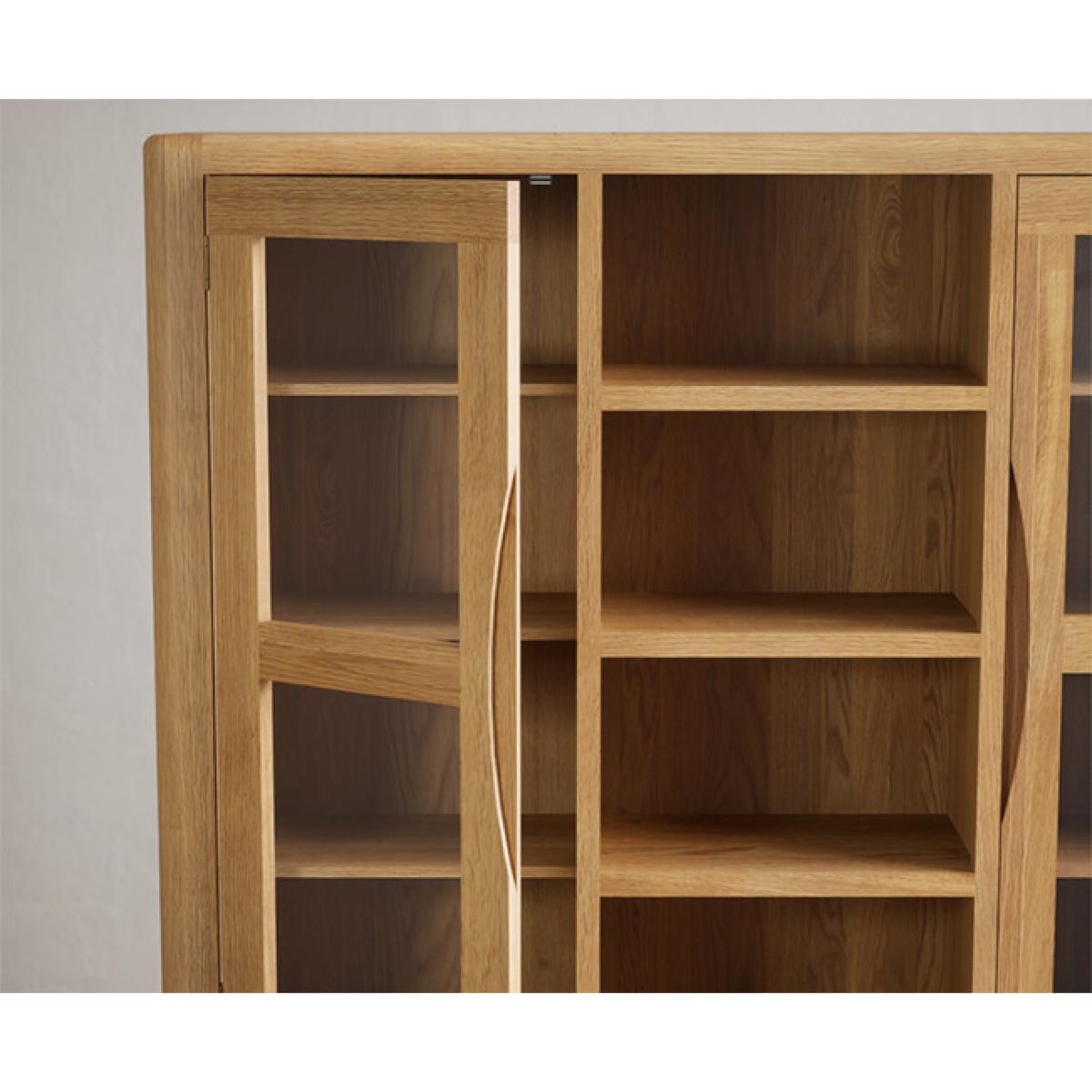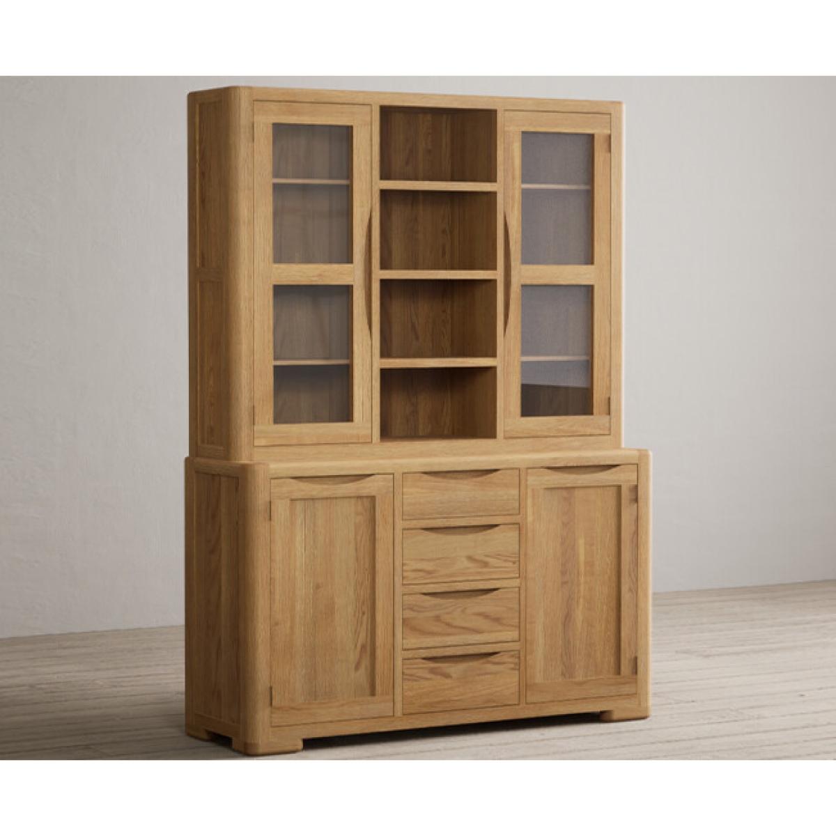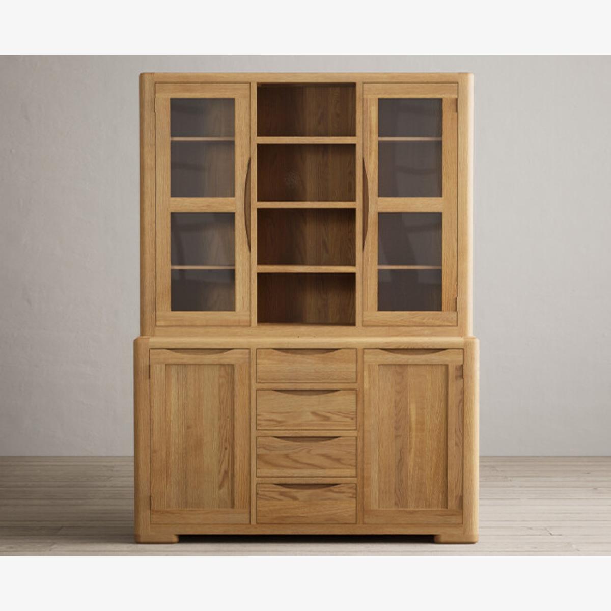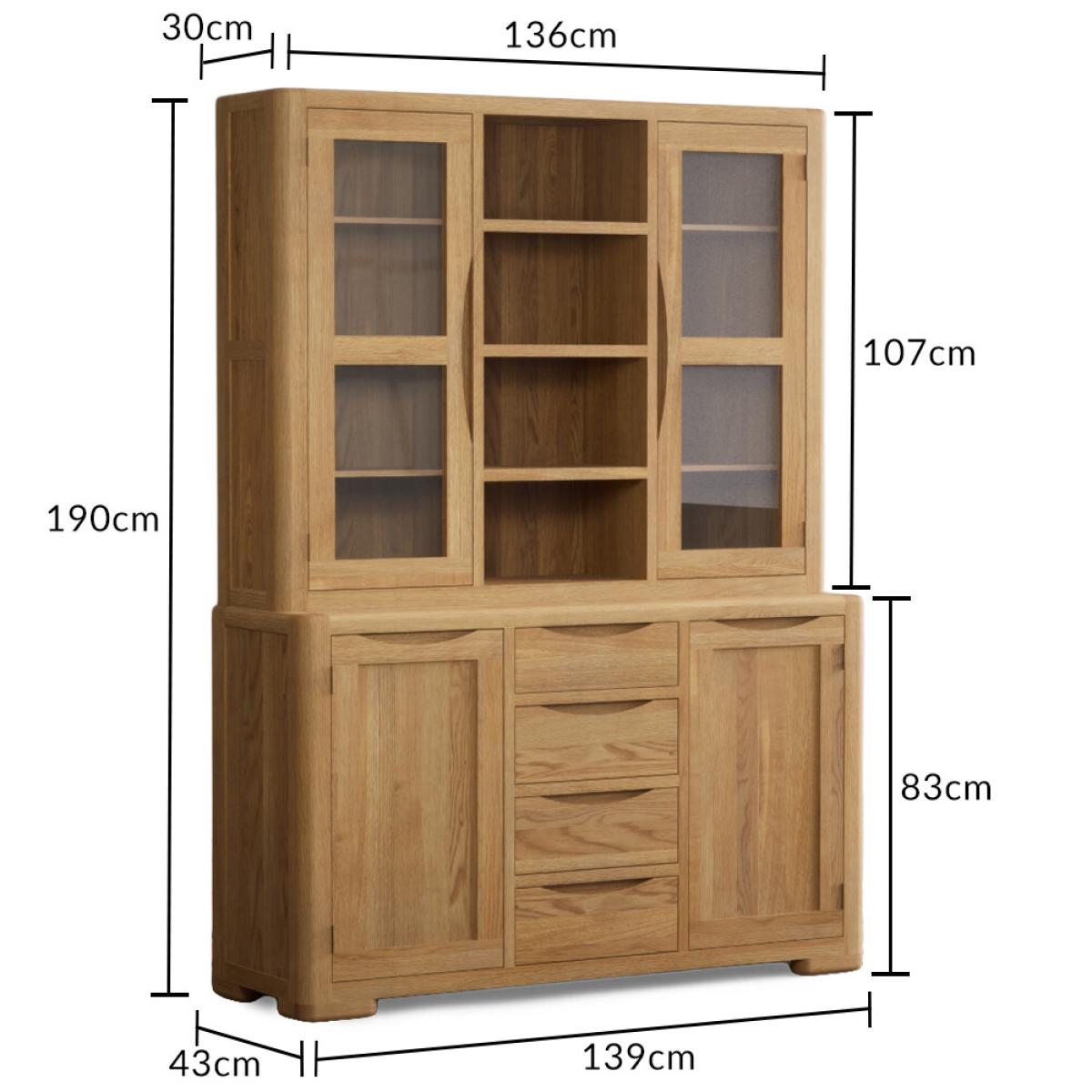 Designed to match the Harper large sideboard, the Harper solid oak dresser top features three shelves and two cupboards with tempered glass doors.