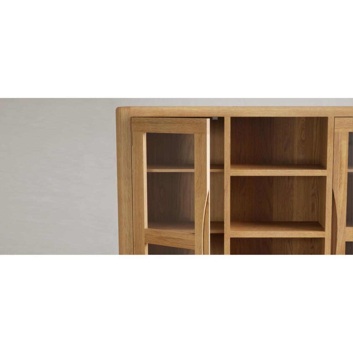 I love this sideboard’s natural oak finish, which offers a versatile and timeless look that works well in both contemporary and traditional interiors. Its solid oak construction ensures durability, making it suitable for everyday use while adding warmth to a room. This piece is particularly well-suited for dining rooms or living spaces where you need practical storage combined with a touch of understated elegance. Practical styling tips include pairing it with ceramic tableware, vintage accessories, or modern minimal décor to enhance its natural charm. The glass-fronted top section is ideal for displaying collections or decorative items, while the lower drawers and cupboards provide ample storage for essentials, keeping your space organised without sacrificing style.