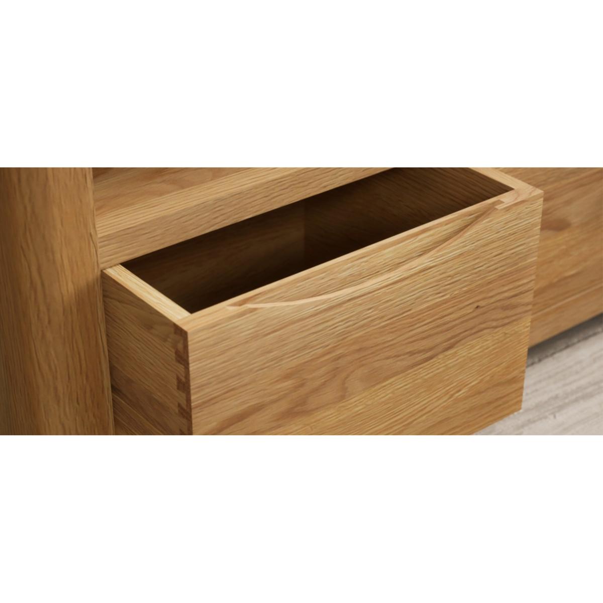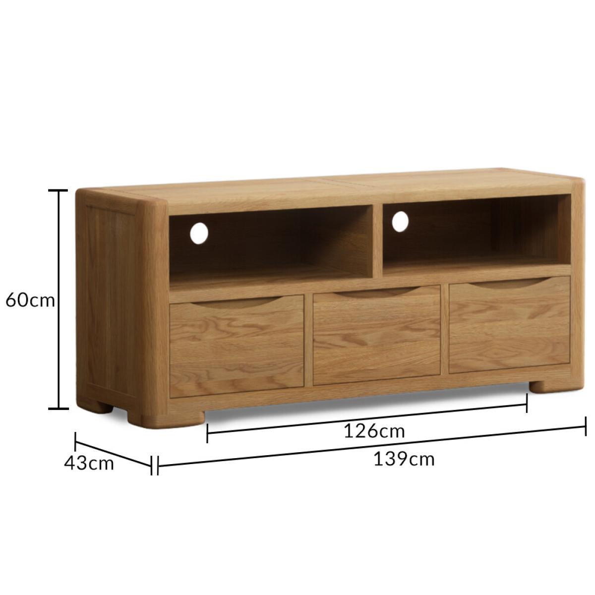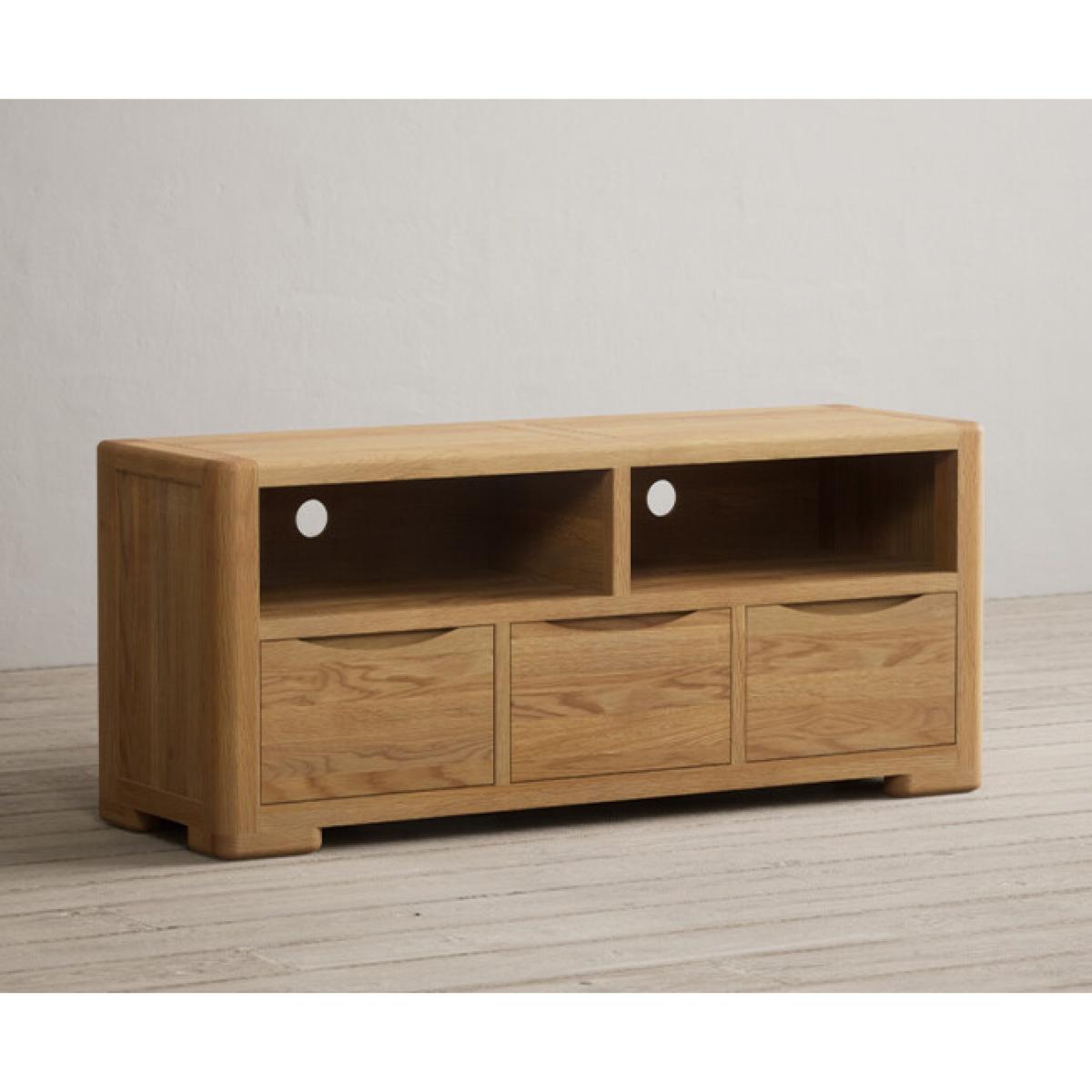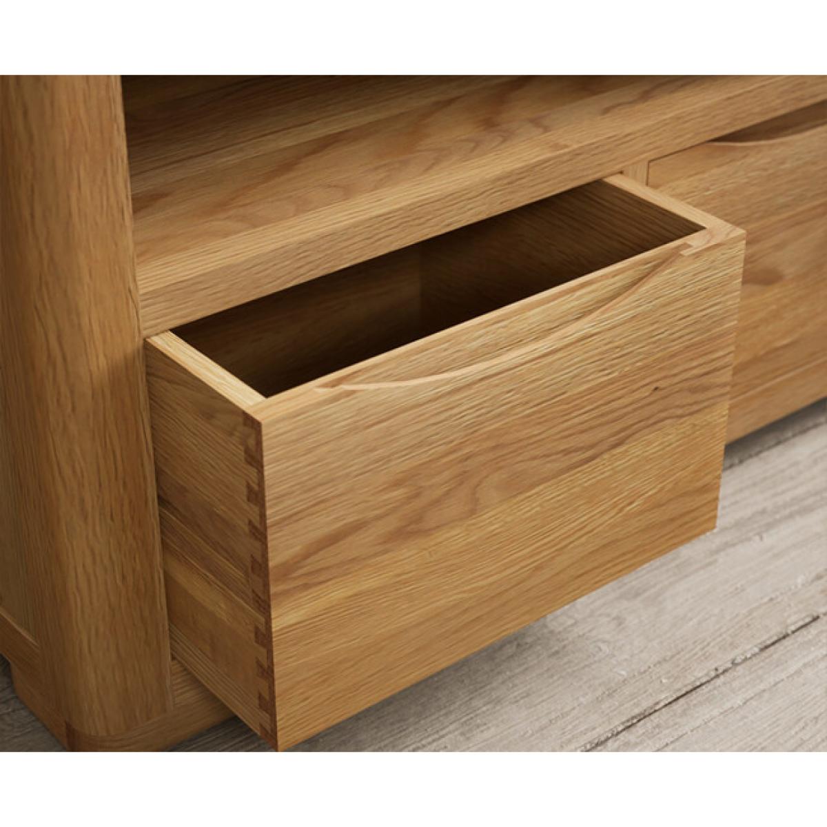 The Harper Solid Oak Large TV Cabinet features a natural finish and smooth edges for a modern look, complete with a Dovetail drawer with a recessed handle and cable management hole.